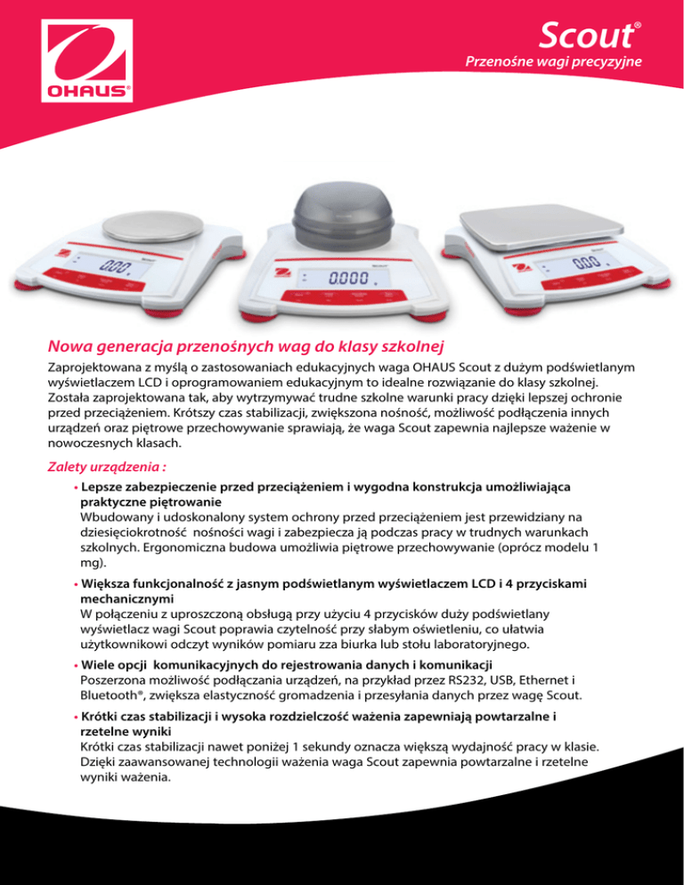 Scout® Przenośne wagi precyzyjne Nowa generacja przenośnych wag do klasy szkolnej Zaprojektowana z myślą o zastosowaniach edukacyjnych waga OHAUS Scout z dużym podświetlanym wyświetlaczem LCD i oprogramowaniem edukacyjnym to idealne rozwiązanie do klasy szkolnej. Została zaprojektowana tak, aby wytrzymywać trudne szkolne warunki pracy dzięki lepszej ochronie przed przeciążeniem. Krótszy czas stabilizacji, zwiększona nośność, możliwość podłączenia innych urządzeń oraz piętrowe przechowywanie sprawiają, że waga Scout zapewnia najlepsze ważenie w nowoczesnych klasach. Zalety urządzenia : • Lepsze zabezpieczenie przed przeciążeniem i wygodna konstrukcja umożliwiająca praktyczne piętrowanie Wbudowany i udoskonalony system ochrony przed przeciążeniem jest przewidziany na dziesięciokrotność nośności wagi i zabezpiecza ją podczas pracy w trudnych warunkach szkolnych. Ergonomiczna budowa umożliwia piętrowe przechowywanie (oprócz modelu 1 mg). • Większa funkcjonalność z jasnym podświetlanym wyświetlaczem LCD i 4 przyciskami mechanicznymi W połączeniu z uproszczoną obsługą przy użyciu 4 przycisków duży podświetlany wyświetlacz wagi Scout poprawia czytelność przy słabym oświetleniu, co ułatwia użytkownikowi odczyt wyników pomiaru zza biurka lub stołu laboratoryjnego. • Wiele opcji komunikacyjnych do rejestrowania danych i komunikacji Poszerzona możliwość podłączania urządzeń, na przykład przez RS232, USB, Ethernet i Bluetooth®, zwiększa elastyczność gromadzenia i przesyłania danych przez wagę Scout. • Krótki czas stabilizacji i wysoka rozdzielczość ważenia zapewniają powtarzalne i rzetelne wyniki Krótki czas stabilizacji nawet poniżej 1 sekundy oznacza większą wydajność pracy w klasie. Dzięki zaawansowanej technologii ważenia waga Scout zapewnia powtarzalne i rzetelne wyniki ważenia. Scout® Przenośne wagi precyzyjne Scout radzi sobie w trudnych warunkach panujących w szkole Konstrukcja umożliwiająca piętrowanie Złącza komunikacyjne Poszerzona możliwość podłączania urządzeń, na przykład przez RS232, USB, Ethernet i Bluetooth® Ergonomiczna budowa umożliwia piętrowe przechowywanie (oprócz modelu 1 mg) Doskonały system mechanicznej ochrony przed przeciążeniem składa się z szalki wykonanej ze stali nierdzewnej i jej plastikowej podstawy odpornej na uderzenia. Dzięki temu waga bezpiecznie wytrzymuje obciążenie nawet 10-krotnie przekraczające jej nośność znamionową i nie ulega uszkodzeniu w wymagających warunkach szkolnych, gdzie obciążenie może być często przekraczane. Wyjątkowa pokrywa do piętrowego przechowywania pozwala na bezpieczne przechowywanie wagi, kiedy nie jest używana. Wbudowana blokada transportowa chroni moduł ważący przed uszkodzeniem podczas piętrowego przechowywania i transportu. Uchwyt do ważenia podszalkowego Wbudowany w spód wagi Scout uchwyt do ważenia podszalkowego umożliwia oznaczanie gęstości i obliczanie ciężaru właściwego Podświetlany wyświetlacz i 4 przyciski mechaniczne gwarantują zadowolenie użytkownika Cztery czytelnie oznaczone przyciski upraszczają obsługę i sprawnie prowadzą przez proces konfiguracji wagi, zmianę jednostek miary, kalibrację i nie tylko. Słabe oświetlenie w laboratorium lub w klasie nie jest problemem dla nowego Scouta. Duży, jasno podświetlony wyświetlacz LCD zwiększa czytelność w warunkach słabego oświetlenia i ułatwia odczyt pomiaru z większej odległości. Gniazdo zabezpieczające Wbudowane gniazdo zabezpieczające zapobiega kradzieży Wiele opcji podłączeń pozwala na innowacyjne użytkowanie Wyświetlacz LCD o wysokim kontraście wyraźnie pokazuje masę i parametry programu nawet przy słabym oświetleniu8 in Wbudowane programy • Ważenie—określanie masy próbki na szalce w wybranej jednostce miary. 8.7 in 222 mm • Oznaczanie gęstości —określenie gęstości ciał stałych lub cieczy. Dzięki wbudowanemu uchwytowi do ważenia podszalkowego można oznaczać gęstość przedmiotów, których umieszczenie na szalce sprawiłoby trudność. 8.8 in 8 in • Ważenie molowe— pomiar masy próbki i 224 mm 202 mm automatyczne przeliczanie na mole. Wymiary 8 in 8 in 202202 mm mm 202 mm Scout z opcjonalnym zestawem do oznaczania gęstości 8 in 8 in 202 202 mm mm 8.7 in 222 mm 202 mm 4.1 in 103 mm 8.8 in 224 mm 2.1 in 5454mm mm Dostępny model z osłoną przeciwpodmuchową 8.7 in8.7 in 222 222 mm 222mm mm 8.8 in 224 mm 8.8 in 224224mm mm 4.1 in 103 103mm mm 4.1 in4.1 in 103 mm 103 mm *Android jest znakiem handlowym Google Inc. 8 in 202 mm 202 mm Większa wydajność i produktywność Pomysłowa osłona przeciwpodmuchowa (tylko dla modelu 1 mg) została wyposażona w łatwą do zdejmowania górną pokrywkę . Pełni ona funkcję zabezpieczenia przed podmuchami powietrza, które chroni szalkę w trudnych warunkach, jednocześnie skracając czas ważenia. Wagę Scout można zablokować w wybranej konfiguracji przy użyciu przycisku blokady mechanicznej Duży podświetlany wyświetlacz LCD Scout ma wiele opcji komunikacyjnych — RS232, USB host, urządzenie USB, Ethernet i Bluetooth®. Dzięki poszerzonej możliwość podłączania urządzeń waga OHAUS Scout jest bardziej wszechstronna i umożliwia wygodną rejestrację danych, komunikację oraz zdalną obsługę urządzenia. Funkcja Bluetooth pozwala zdalnie sterować wagą przy użyciu telefonu lub tabletu z systemem Android™*. Jest możliwość wykonywania między innymi takich funkcji, jak zerowanie, tarowanie, zapisywanie wyników ważenia i wyłączenie zasilania. Opcjonalny host USB ułatwia zapis i przesył danych z wagi wprost do pamięci USB W wagach OHAUS Scout liczy się precyzja i wydajność. Czas stabilizacji poniżej 1 sekundy w połączeniu z wysoką rozdzielczością dają niezwykłą precyzję i powtarzalne wyniki ważenia, na których można zawsze polegać. Dzięki temu Scout idealnie nadaje się
