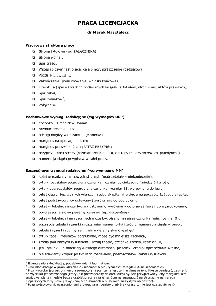 PRACA LICENCJACKA dr Marek Masztalerz Wzorcowa struktura pracy Strona tytułowa (wg ZAŁĄCZNIKA), Strona wolna1, Spis treści, Wstęp (o czym jest praca, cele pracy, streszczenie rozdziałów) Rozdział I, II, III..., Zakończenie (podsumowanie, wnioski końcowe), Literatura (spis wszystkich podawanych ksiąŜek, artykułów, stron www, aktów prawnych), Spis tabel, Spis rysunków2, Załączniki. Podstawowe wymogi redakcyjne (wg wymogów UEP) czcionka - Times New Roman rozmiar czcionki – 13 odstęp między wierszami - 1,5 wiersza margines na oprawę 3 - 3 cm margines prawy - 2 cm (PATRZ PRZYPIS!) przypisy u dołu strony (rozmiar czcionki – 10, odstępy między wierszami pojedyncze) numeracja ciągła przypisów w całej pracy. Szczegółowe wymogi redakcyjne (wg wymogów MM) kolejne rozdziały na nowych stronach (podrozdziały – niekoniecznie), tytuły rozdziałów pogrubioną czcionką, rozmiar powiększony (między 14 a 16), tytuły podrozdziałów pogrubioną czcionką, rozmiar 13, wyrównane do lewej, tekst ciągły, bez wolnych wierszy między akapitami, wcięcia na początku kaŜdego akapitu, tekst podstawowy wyjustowany (wyrównany do obu stron), tekst w tabelach moŜe być wyjustowany, wyrównany do prawej, lewej lub wyśrodkowany, obcojęzyczne słowa piszemy kursywą (np. accounting), tekst w tabelach i na rysunkach moŜe być pisany mniejszą czcionką (min. rozmiar 9), wszystkie tabele i rysunki muszą mieć numer, tytuł i źródło, numeracja ciągła w pracy, tabele i rysunki robimy sami, nie wklejamy skanów/zdjęć4, tytuły tabel i rysunków pogrubione, moŜe być mniejsza czcionka, źródła pod kaŜdym rysunkiem i kaŜdą tabelą, czcionka zwykła, rozmiar 10, jeśli rysunki lub tabele są własnego autorstwa, piszemy: Źródło: opracowanie własne, nie stawiamy kropek po tytułach rozdziałów, podrozdziałów, tabel i rysunków. 1 Ewentualnie z dedykacją, podziękowaniami lub mottem. Jeśli ktoś stosuje w pracy określenie „schemat” a nie „rysunek”, to będzie „Spis schematów”. 3 Przy wydruku jednostronnym dla promotora i recenzenta jest to margines prawy. Proszę pamiętać, Ŝeby plik do wydruku jednostronnego (który jest przeznaczony do archiwum) był tak przygotowany, aby margines 3cm znajdował się tam, gdzie będzie grzbiet pracy a margines 2cm na zewnątrz ( na stronach o numerach nieparzystych lewy 3cm, prawy 2cm, a na stronach o numerach parzystych na odwrót). 4 Poza wyjątkowymi, uzasadnionymi przypadkami. Lenistwo lub brak czasu to nie jest uzasadnienie ☺. 2 1 Wymogi końcowe – wydruk i przekazanie pracy do wydruku pracy konieczna jest moja zgoda – proszę zatem nie śpieszyć się z drukiem, bo nie będę się przejmować tzw. sunk costs, jeśli praca nie będzie spełniać warunków ☺, zgoda na wydruk pracy następuje po otrzymaniu i zaakceptowaniu całości pracy w wersji elektronicznej przesłanej mailem w dwóch plikach: doc (MS Word 1997-2003) oraz pdf, po uzyskaniu zgody drukujemy pracę w trzech egzemplarzach: dwa egzemplarze przeznaczone dla promotora i recenzenta, a jeden do archiwum UEP, egzemplarze dla promotora i recenzenta drukujemy jednostronnie (proszę uwaŜać na marginesy!), oprawiamy w sztywną i twardą okładkę w dowolnym kolorze, egzemplarz do archiwum, zgodnie z wymogami UEP5, drukujemy dwustronnie, oprawiamy w miękką, z przodu przezroczystą okładkę, dołączamy oświadczenie i płytę CD, jeśli elementem pracy jest „dzieło niematerialne” (np. jakiś plik MS Excel lub program), to naleŜy go umieścić na płycie CD i załączyć do wszystkich trzech egzemplarzy pracy. Wymogi archiwalnej wersji pracy (wg uchwały Senatu UEP) Praca licencjacka powinna być wydrukowana dwustronnie i oprawiona w miękką okładkę, przeźroczystą od strony frontowej, aby widoczna była karta tytułowa pracy zestawiona wg wzorca ustalonego przez dziekana (wzór w załączniku). Egzemplarz pracy przekazany na nośniku elektronicznym powinien być dostarczony na płycie CD, na której powinien znajdować się tekst pracy zapisany w jednym pliku w formacie PDF i nazwie rozpoczynającej się od nazwiska autora, następnie bez spacji cyfry identyfikującej numer albumu autora i dalej bez spacji skrótowe określenie rodzaju pracy np. kowalska66666lic. Na płycie CD wraz z wyŜej opisanym plikiem powinien zostać zapisany katalog o nazwie zapas, a w nim powinien być raz jeszcze zapisany tenŜe plik. Płyta CD powinna być włoŜona do papierowej koperty, a ta powinna być przyklejona do odwrotnej strony karty tytułowej pracy. Na widocznej stronie przyklejonej koperty powinny znaleźć się imię i nazwisko autora, tytuł pracy, wydział, kierunek i specjalność studiów, forma i tryb studiów, rok ukończenia studiów oraz nazwisko promotora. Między przeźroczystą obwolutą pracy dyplomowej i jej kartę tytułową autor winien włoŜyć luźną kartkę w formacie A5 z oświadczeniem o oryginalności i równości treści oraz datą i podpisem autora (wzór w załączniku). Załączniki wzór strony tytułowej pracy licencjackiej, wzór oświadczenia załączanego do pracy licencjackiej, wymogi dotyczące bibliografii wraz z przykładem, przykładowy fragment pracy, sformatowany wg wymogów. 5 PoniŜej znajduje się szczegółowa instrukcja dotycząca wymogów, jakie musi spełniać egzemplarz pracy przeznaczony do archiwum UEP. Proszę koniecznie się trzymać zawartych tam reguł! 2