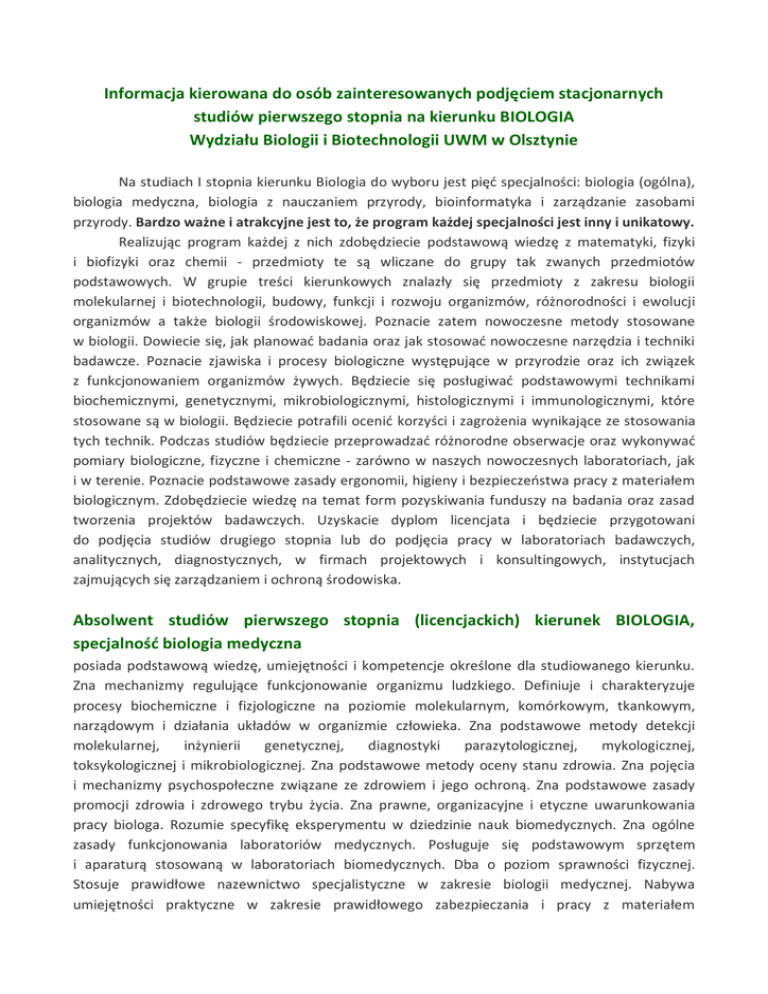 Informacja kierowana do osób zainteresowanych podjęciem stacjonarnych studiów pierwszego stopnia na kierunku BIOLOGIA Wydziału Biologii i Biotechnologii UWM w Olsztynie Na studiach I stopnia kierunku Biologia do wyboru jest pięć specjalności: biologia (ogólna), biologia medyczna, biologia z nauczaniem przyrody, bioinformatyka i zarządzanie zasobami przyrody. Bardzo ważne i atrakcyjne jest to, że program każdej specjalności jest inny i unikatowy. Realizując program każdej z nich zdobędziecie podstawową wiedzę z matematyki, fizyki i biofizyki oraz chemii - przedmioty te są wliczane do grupy tak zwanych przedmiotów podstawowych. W grupie treści kierunkowych znalazły się przedmioty z zakresu biologii molekularnej i biotechnologii, budowy, funkcji i rozwoju organizmów, różnorodności i ewolucji organizmów a także biologii środowiskowej. Poznacie zatem nowoczesne metody stosowane w biologii. Dowiecie się, jak planować badania oraz jak stosować nowoczesne narzędzia i techniki badawcze. Poznacie zjawiska i procesy biologiczne występujące w przyrodzie oraz ich związek z funkcjonowaniem organizmów żywych. Będziecie się posługiwać podstawowymi technikami biochemicznymi, genetycznymi, mikrobiologicznymi, histologicznymi i immunologicznymi, które stosowane są w biologii. Będziecie potrafili ocenić korzyści i zagrożenia wynikające ze stosowania tych technik. Podczas studiów będziecie przeprowadzać różnorodne obserwacje oraz wykonywać pomiary biologiczne, fizyczne i chemiczne - zarówno w naszych nowoczesnych laboratoriach, jak i w terenie. Poznacie podstawowe zasady ergonomii, higieny i bezpieczeństwa pracy z materiałem biologicznym. Zdobędziecie wiedzę na temat form pozyskiwania funduszy na badania oraz zasad tworzenia projektów badawczych. Uzyskacie dyplom licencjata i będziecie przygotowani do podjęcia studiów drugiego stopnia lub do podjęcia pracy w laboratoriach badawczych, analitycznych, diagnostycznych, w firmach projektowych i konsultingowych, instytucjach zajmujących się zarządzaniem i ochroną środowiska. Absolwent studiów pierwszego stopnia (licencjackich) kierunek BIOLOGIA, specjalność biologia medyczna posiada podstawową wiedzę, umiejętności i kompetencje określone dla studiowanego kierunku. Zna mechanizmy regulujące funkcjonowanie organizmu ludzkiego. Definiuje i charakteryzuje procesy biochemiczne i fizjologiczne na poziomie molekularnym, komórkowym, tkankowym, narządowym i działania układów w organizmie człowieka. Zna podstawowe metody detekcji molekularnej, inżynierii genetycznej, diagnostyki parazytologicznej, mykologicznej, toksykologicznej i mikrobiologicznej. Zna podstawowe metody oceny stanu zdrowia. Zna pojęcia i mechanizmy psychospołeczne związane ze zdrowiem i jego ochroną. Zna podstawowe zasady promocji zdrowia i zdrowego trybu życia. Zna prawne, organizacyjne i etyczne uwarunkowania pracy biologa. Rozumie specyfikę eksperymentu w dziedzinie nauk biomedycznych. Zna ogólne zasady funkcjonowania laboratoriów medycznych. Posługuje się podstawowym sprzętem i aparaturą stosowaną w laboratoriach biomedycznych. Dba o poziom sprawności fizycznej. Stosuje prawidłowe nazewnictwo specjalistyczne w zakresie biologii medycznej. Nabywa umiejętności praktyczne w zakresie prawidłowego zabezpieczania i pracy z materiałem biologicznym. Posiada znajomość różnorodnych metod badawczych współczesnej biologii. Potrafi podejmować współpracę ze specjalistami w zakresie analityki i diagnostyki medycznej oraz brać udział w pracach badawczych prowadzonych z użyciem materiału biologicznego. Może podjąć pracę w laboratoriach badawczych, biomedycznych, analitycznych na stanowiskach, na których nie są wymagane uprawnienia diagnosty laboratoryjnego oraz nie wykonuje się czynności diagnostyki laboratoryjnej w rozumieniu Ustawy o diagnostyce laboratoryjnej. Szczegółowe plany studiów, opracowane dla poszczególnych specjalności, znajdują się na stronie internetowej Wydziału Biologii i Biotechnologii w zakładce Rekrutacja i oferta kształcenia