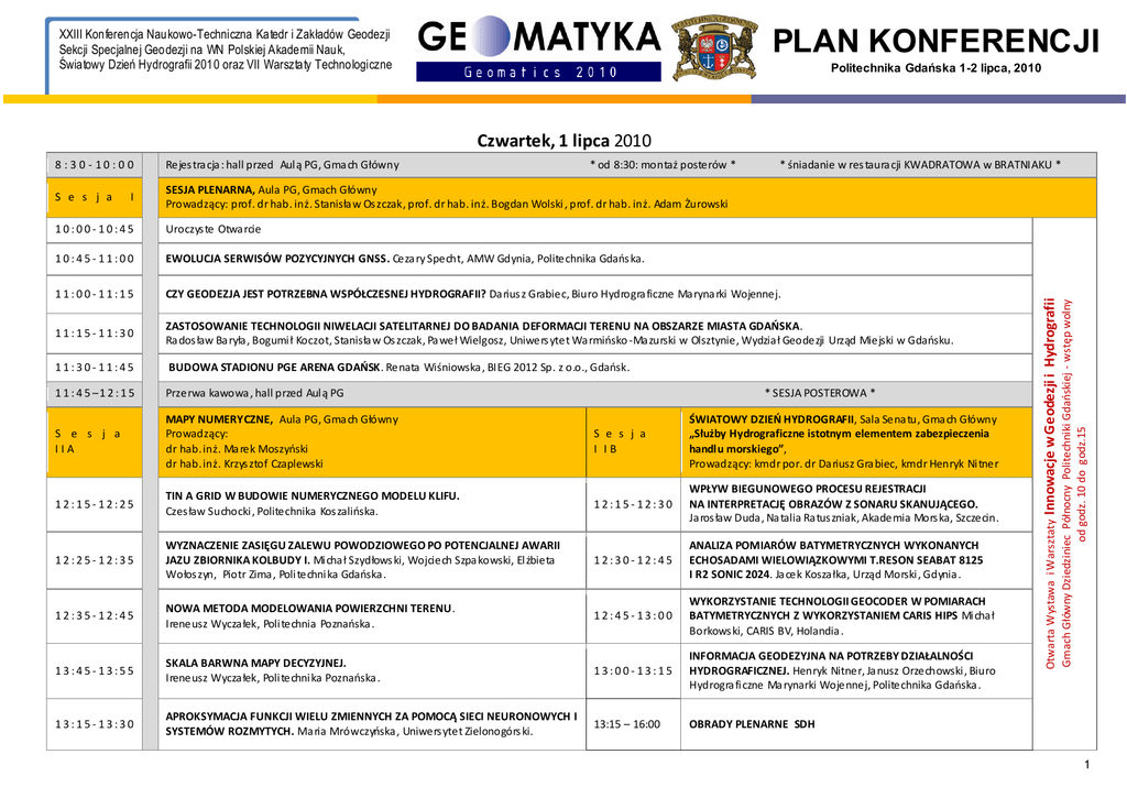 XXIII Konferencja Naukowo-Techniczna Katedr i Zakładów Geodezji Sekcji Specjalnej Geodezji na WN Polskiej Akademii Nauk, Światowy Dzień Hydrografii 2010 oraz VII Warsztaty Technologiczne PLAN KONFERENCJI Politechnika Gdańska 1-2 lipca, 2010 Czwartek, 1 lipca 2010 Rejes tra cja : hall przed Aul ą PG, Gma ch Główny S e s j a SESJA PLENARNA, Aula PG, Gmach Główny Prowadzący: prof. dr hab. inż. Stanisła w Os zczak, prof. dr hab. inż. Bogdan Wolski , prof. dr hab. inż. Adam Żurowski I * od 8:30: montaż posterów * * śniadanie w res taura cji KWADRATOWA w BRATNIAKU * 10:00- 10:45 Uroczys te Otwa rcie 10:45- 11:00 EWOLUCJA SERWISÓW POZYCYJNYCH GNSS. Ceza ry Specht, AMW Gdynia, Politechnika Gdaos ka. 11:00- 11:15 CZY GEODEZJA JEST POTRZEBNA WSPÓŁCZESNEJ HYDROGRAFII? Da rius z Grabiec, Biuro Hydrogra ficzne Ma ryna rki Wojennej. 11:15- 11:30 ZASTOSOWANIE TECHNOLOGII NIWELACJI SATELITARNEJ DO BADANIA DEFORMACJI TERENU NA OBSZARZE MIASTA GDAOSKA. Ra dos ław Ba ryła , Bogumi ł Koczot, Stanisła w Os zczak, Pa weł Wielgosz, Uniwers ytet Wa rmiosko -Ma zurski w Olsztynie, Wydzia ł Geodezji Urząd Miejski w Gdaosku. 11:30- 11:45 BUDOWA STADIONU PGE ARENA GDAOSK. Renata Wiśniowska , BIEG 2012 Sp. z o.o., Gdaosk. 1 1 : 4 5 –1 2 : 1 5 Przerwa kawowa , hall przed Aul ą PG S e s j a IIA MAPY NUMERYCZNE, Aula PG, Gma ch Główny Prowadzący: dr hab. inż. Ma rek Moszyoski dr hab. inż. Krzys ztof Czaplewski S e s j a I IB ŚWIATOWY DZIEO HYDROGRAFII, Sala Sena tu, Gma ch Główny „Służby Hydrograficzne istotnym elementem zabezpieczenia handlu morskiego”, Prowadzący: kmdr por. dr Da riusz Gra biec, kmdr Henryk Ni tner 12:15- 12:25 TIN A GRID W BUDOWIE NUMERYCZNEGO MODELU KLIFU. Czes ław Suchocki , Politechnika Kos zalioska. 12:15- 12:30 WPŁYW BIEGUNOWEGO PROCESU REJESTRACJI NA INTERPRETACJĘ OBRAZÓW Z SONARU SKANUJĄCEGO. Ja ros ław Duda , Na talia Ra tus zniak, Akademia Mors ka, Szczecin. 12:25- 12:35 WYZNACZENIE ZASIĘGU ZALEWU POWODZIOWEGO PO POTENCJALNEJ AWARII JAZU ZBIORNIKA KOLBUDY I. Mi cha ł Szydłows ki, Wojciech Szpa kowski, El żbieta Wołos zyn, Piotr Zima , Poli techni ka Gdaoska . 12:30- 12:45 ANALIZA POMIARÓW BATYMETRYCZNYCH WYKONANYCH ECHOSADAMI WIELOWIĄZKOWYMI T.RESON SEABAT 8125 I R2 SONIC 2024. Ja cek Kosza łka, Urząd Morski , Gdynia . 12:35- 12:45 NOWA METODA MODELOWANIA POWIERZCHNI TERENU. Ireneusz Wycza łek, Poli technia Poznaoska . 12:45- 13:00 WYKORZYSTANIE TECHNOLOGII GEOCODER W POMIARACH BATYMETRYCZNYCH Z WYKORZYSTANIEM CARIS HIPS Mi cha ł Borkows ki, CARIS BV, Holandia . 13:45- 13:55 SKALA BARWNA MAPY DECYZYJNEJ. Ireneusz Wycza łek, Poli techni ka Poznaoska . 13:00- 13:15 INFORMACJA GEODEZYJNA NA POTRZEBY DZIAŁALNOŚCI HYDROGRAFICZNEJ. Henryk Nitner, Ja nusz Orzechowski , Biuro Hydrogra fi czne Ma rynarki Wojennej, Politechnika Gdaoska . 13:15- 13:30 APROKSYMACJA FUNKCJI WIELU ZMIENNYCH ZA POMOCĄ SIECI NEURONOWYCH I SYSTEMÓW ROZMYTYCH. Ma ria Mrówczyoska , Uniwers ytet Zielonogórs ki. 13:15 – 16:00 OBRADY PLENARNE SDH * SESJA POSTEROWA * Otwarta Wystawa i Warsztaty Innowacje w Geodezji i Hydrografii Gmach Główny Dziedziniec Północny Politechniki Gdaoskiej - wstęp wolny od godz. 10 do godz.15 8 : 3 0 - 10 : 0 0 1 XXIII Konferencja Naukowo-Techniczna Katedr i Zakładów Geodezji Sekcji Specjalnej Geodezji na WN Polskiej Akademii Nauk, Światowy Dzień Hydrografii 2010 oraz VII Warsztaty Technologiczne PLAN KONFERENCJI Politechnika Gdańska 1-2 lipca, 2010 13:30- 13:40 OCENA MOŻLIWOŚCI WYKORZYSTANIA MATERIAŁÓW GEODEZYJNYCH DLA CELÓW BUDOWY ZINTEGROWANEGO KOLEJOWEGO SYSTEMU INFORMACJI TERENOWE J. Artur Pli chta , Poli technika Poznaoska , Poznao . 13:40- 13:50 PODSYSTEM GROMADZENIA I WYMIANY DANYCH MOBILNEGO CENTRUM DOWODZENIA SYSTEMU PROTEUS. Ka rol Brzostows ki, Anna Foks -Ryzna r, Rys za rd Zdunek, Centrum Bada o Kosmi cznych PAN. 13:50- 14:00 NIEPOPRAWNY ROZŁÓG POLA UPRAWNEGO UŻYTKU ZIELONEGO PRZYCZYNĄ ZMNIEJSZENIA DOCHODU Z PRODUKCJI ROŚLINNEJ. Stefan Mielewczyk, Poli techni ka Koszalioska . 14:00- 15:00 Przerwa obiadowa, Bra tniak PG – Res taura cja Kwadra towa S e s j a III GEODEZJA INŻYNIERYJNA I - METODY NUMERYCZNE I KOMPILACJA TECHNOLOGII, Aula PG, Gma ch Główny Prowadzący: dr hab. inż. El żbieta Urbaos ka-Galewska , prof. dr hab. inż. Krzysztof Wilde, Rena ta Wiśniowska - Dyrektor Projektu BIEG 2012 Gdaosk, 15:00- 15:20 CLIP I CURBADO FIRMY TOOL — KOMPUTEROWE WSPARCIE TRASOWANIA OBIEKTÓW LINIOWYCH. Da mian Grus zecki , DroSzko. 15:20- 15:40 ZASTOSOWANIE TACHIMETRU SKANUJĄCEGO W PRAKTYCE GEODEZYJNEJ. Ceza ry Toś , Bogdan Wolski , Leszek Zielina, Poli techni ka Kra kowska . 15:40- 15:55 WYKORZYSTANE N IEMETRYCZNYCH ZDJĘD CYFROWYCH WYKONANYCH Z BEZZAŁOGOWEGO APARATU LATAJACEGO DO OPRACOWAO FOTOGRAMETRYCZNYCH - NA PRZYKŁADZIE PROGU STABILIZACYJNEGO NA STOPN IU WODNYM WE WŁOCŁAWKU. Bogdan Szczechowski, Politechnika Gdaoska 15:55- 16:10 WYZNACZANIE PARAMETRÓW GEOMETRYCZNYCH SŁ UPÓW KRATOWN ICOWYCH LIN II WYSOKIEGO NAPIĘCIA . Paweł Kowalewski, Krzysztof Matysik, Cezary Specht, Krzysztof Wilde, Joanna Wojtas, Apeks Sp. z o.o., Politechnika Gdaoska. 16:10- 16:10 OPRACOWANIE TRÓJWYMIAROWEGO MODELU OBIEKTU NA PODSTAWIE WYNIKÓW POMIARU TACHIMETREM BEZLUSTROWYM. Michał Bednarczyk, Uniwersytet Warmiosko-Mazurski w Olsztynie (referat tylko w sesji posterowej) 16:10- 16:25 PROPOZYCJA MODYFIKACJI METODOLOGII OPRACOWAN IA CHMURY PUNKTÓW LiDAR. Wioleta Błaszczak-Bąk, Artur Janowski, Waldemar Kamioski, Jacek Rapioski, Uniwersytet Warmiosko-Mazurski w Olsztynie. 16:25- 16:35 TRADYCYJNE I NOWOCZESNE POMIARY PRZEMIESZCZEO ELEKTROWNI WIATROWEJ . Zygmunt Kurałowicz, Tadeusz Widerski, Politechnika Gdaoska. 16:35- 16:50 OBSŁUGA GEODEZYJNA PRZY BUDOWIE STADION U PGE ARENA W GDAOSKU. Eugeniusz Lepacki, Jacek Śmierzchalski, „Diaz” Kompleksowe Usługi Geodezyjne, Gdaosk. 1 Warsztaty POLOWANIE NA INNOWACJE - spotkanie integracyjne. Klub Strzelecki, ul. Jaśkowa Dolina 114, GDAOSK 8 : 3 0 1 lipca 2010