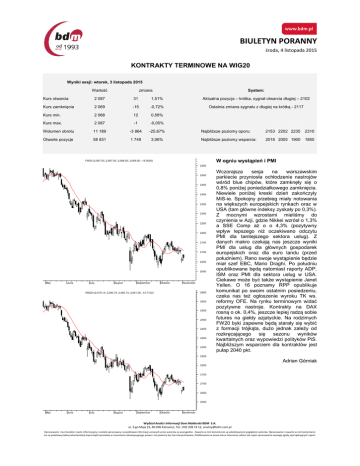BIULETYN PORANNY środa, 4 listopada 2015 KONTRAKTY TERMINOWE NA WIG20 Wyniki sesji: wtorek, 3 listopada 2015 Wartość System: zmiana Kurs otwarcia 2 087 31 1,51% Aktualna pozycja – krótka, sygnał otwarcia długiej – 2102 Kurs zamknięcia 2 069 -15 -0,72% Ostatnia zmiana sygnału z długiej na krótką - 2117 Kurs min. 2 068 12 0,58% Kurs max. 2 087 -1 -0,05% Wolumen obrotu 11 189 -3 864 -25,67% Otwarte pozycje 58 831 1 749 3,06% Najbliższe poziomy oporu: 2153 2202 2235 2310 Najbliższe poziomy wsparcia: 2018 2005 1900 1850 W ogniu wystąpień i PMI FW20 (2,087.00, 2,087.00, 2,068.00, 2,069.00, -15.0000) 2550 2500 2450 2400 2350 2300 2250 2200 2150 2100 2050 2000 May June July August September October November 2600 WIG20 (2,079.14, 2,083.74, 2,060.15, 2,061.38, -15.7102) 2550 2500 2450 2400 2350 2300 Wczorajsza sesja na warszawskim parkiecie przyniosła ochłodzenie nastrojów wśród blue chipów, które zamknęły się o 0,8% poniżej poniedziałkowego zamknięcia. Niewiele poniżej kreski dzień zakończyły MiS-ie. Spokojny przebieg miały notowania na większych europejskich rynkach oraz w USA (tam główne indeksy zyskały po 0,3%). Z mocnymi wzrostami mieliśmy do czynienia w Azji, gdzie Nikkei wzrósł o 1,3% a SSE Comp aż o o 4,3% (pozytywny wpływ lepszego niż oczekiwano odczytu PMI dla tamtejszego sektora usług). Z danych makro czekają nas jeszcze wyniki PMI dla usług dla głównych gospodarek europejskich oraz dla euro landu (przed południem). Rano swoje wystąpienie będzie miał szef EBC, Mario Draghi. Po południu opublikowane będą natomiast raporty ADP, ISM oraz PMI dla sektora usług w USA. Ciekawe może być także wystąpienie Janet Yellen. O 16 poznamy RPP opublikuje komunikat po swoim ostatnim posiedzeniu, czeka nas też ogłoszenie wyroku TK ws. reformy OFE. Na rynku terminowym widać pozytywne nastroje. Kontrakty na DAX rosną o ok. 0,4%, jeszcze lepiej radzą sobie futures na giełdy azjatyckie. Na rodzimych FW20 byki zapewne będą starały się wybić z formacji trójkąta, dużo jednak zależy od rozkręcającego się sezonu wyników kwartalnych oraz wypowiedzi polityków PiS. Najbliższym wsparciem dla kontraktów jest pułap 2040 pkt. 2250 Adrian Górniak 2200 2150 2100 2050 2000 May June July August September October November Wydział Analiz i Informacji Dom Maklerski BDM S.A. ul. 3-go Maja 23, 40-096 Katowice, Tel.: 032 208 14 12, [email protected] Opracowanie ma charakter czysto informacyjny i zostało opracowany na podstawie informacji uznanych przez autorów za wiarygodne . Zawarte w nim komentarze są subiektywnymi poglądami autorów. Opracowanie i zawarte w nim komentarze nie są podstawą żadnej rekomendacji kupna bądź sprzedaży w rozumieniu obowiązującego prawa i nie powinny być tak interpretowane. Publikowanie w prasie lub w Internecie całości lub części opracowania wymaga zgody sporządzających raport. BIULETYN PORANNY środa, 4 listopada 2015 RYNEK AKCJI Wyniki sesji: wtorek, 3 listopada 2015 52 tygodnie Indeks Kurs otwarcia Kurs zamknięcia Zmiana [%] Kurs min. Kurs max. Zakres wahań Obrót [mln PLN] Kurs max. Kurs min. WIG20 2 558,6 2 008,9 2 079,14 2 061,38 -0,76% 2 060,15 2 083,74 23,6 430,6 WIG30 2 782,4 2 222,4 2 316,81 2 296,41 -0,65% 2 296,41 2 317,77 21,4 473,4 mWIG40 3 961,0 3 388,6 3 719,31 3 703,13 -0,18% 13 659,51 13 719,88 60,4 120,2 sWIG80 14 107,4 11 847,7 13 689,33 13 671,70 -0,07% 3 696,12 3 719,64 23,5 27,4 WIG-PL 58 998,6 49 970,2 51 510,95 51 448,47 -0,56% 51 448,47 51 597,88 149,4 552,5 WIG 57 460,4 48 048,1 50 750,34 50 367,53 -0,54% 50 349,68 50 767,70 418,0 565,4 Spółka zmiana % względem WIG30 zmiana % Cena [PLN] Mkt Cap [mln PLN] dzienna 1M 3M 6M dzienna 1M 3M 6M 5 867 -1,0% 5,2% -5,2% -10,4% -0,3% 3,4% 1,6% 5,9% ALIOR BANK 80,70 ASSECOPOL 56,99 4 730 0,0% 3,1% 0,0% -5,8% 0,6% 1,3% 6,8% 10,5% BANK HANDLOWY 80,56 10 526 0,5% 0,7% -13,0% -28,9% 1,1% -1,1% -6,1% -12,7% BOGDANKA 41,89 1 425 -4,8% -29,2% -16,8% -51,9% -4,1% -31,1% -9,9% -35,6% BORYSZEW 5,20 1 248 1,0% 4,0% -13,5% -14,0% 1,6% 2,2% -6,6% 2,2% BZ WBK 308,00 30 564 -1,2% 6,5% 1,3% -16,6% -0,5% 4,6% 8,2% -0,3% CCC 169,00 6 490 0,6% 6,6% -9,9% -9,1% 1,2% 4,8% -3,0% 7,1% CYFROWY POLSAT 25,29 16 174 0,5% 8,3% 10,8% 2,3% 1,2% 6,5% 17,6% 18,5% ENEA 13,25 5 849 0,2% 0,9% -13,4% -19,6% 0,8% -0,9% -6,5% -3,3% EUROCASH 49,75 6 901 -3,0% 9,3% 15,7% 33,3% -2,4% 7,5% 22,6% 49,6% GRUPA AZOTY 91,99 9 125 1,4% 1,0% 4,3% 12,7% 2,0% -0,9% 11,2% 28,9% GTC 6,75 3 085 0,0% 8,3% 15,4% 9,9% 0,6% 6,5% 22,3% 26,2% ING BSK 124,70 16 223 -0,2% 4,3% -3,3% -13,3% 0,4% 2,5% 3,5% 3,0% JSW 13,23 1 553 -0,1% 16,1% 13,9% -9,3% 0,6% 14,2% 20,7% 7,0% KERNEL 53,40 4 255 1,2% 18,9% 23,5% 50,9% 1,8% 17,1% 30,4% 67,2% KGHM 92,30 18 460 -0,5% 17,2% -1,0% -29,0% 0,2% 15,3% 5,9% -12,7% LOTOS 28,44 5 258 -1,6% -0,9% -10,1% -10,0% -0,9% -2,7% -3,3% 6,3% 7 150,00 13 093 -1,4% 2,1% -5,3% -3,6% -0,7% 0,3% 1,6% 12,7% -4,4% LPP mBANK 365,00 15 417 -0,5% 3,0% -2,6% -20,7% 0,1% 1,1% 4,3% NETIA 5,50 1 915 0,5% 0,9% -6,6% -6,5% 1,2% -0,9% 0,2% 9,8% ORANGE POLSKA 7,19 9 436 0,0% 2,3% -11,7% -29,0% 0,6% 0,4% -4,8% -12,7% PEKAO 149,25 39 174 -1,5% -1,3% -7,2% -20,0% -0,8% -3,1% -0,4% -3,7% PGE 14,59 27 280 1,9% 11,1% -16,4% -28,3% 2,5% 9,3% -9,6% -12,0% PGNIG 6,85 40 415 -1,0% 2,2% 5,5% 6,7% -0,4% 0,4% 12,4% 23,0% PKNORLEN 63,00 26 946 -0,8% -5,6% -18,2% -9,7% -0,1% -7,4% -11,3% 6,5% PKOBP 28,52 35 650 -1,6% -1,9% -2,4% -22,1% -1,0% -3,8% 4,5% -5,8% PKP CARGO 62,55 2 801 -3,8% -3,2% -21,8% -26,4% -3,1% -5,1% -15,0% -10,1% PZU 376,50 32 512 -0,3% -1,6% -12,7% -21,0% 0,4% -3,4% -5,9% -4,7% SYNTHOS 3,80 5 028 -0,5% 1,1% -19,0% -20,2% 0,1% -0,8% -12,1% -3,9% TAURON 3,16 5 538 3,6% -0,9% -17,7% -34,3% 4,3% -2,8% -10,9% -18,0% Wydział Analiz i Informacji Dom Maklerski BDM S.A. ul. 3-go Maja 23, 40-096 Katowice, Tel.: 032 208 14 12, [email protected] Opracowanie ma charakter czysto informacyjny i zostało opracowany na podstawie informacji uznanych przez autorów za wiarygodne . Zawarte w nim 