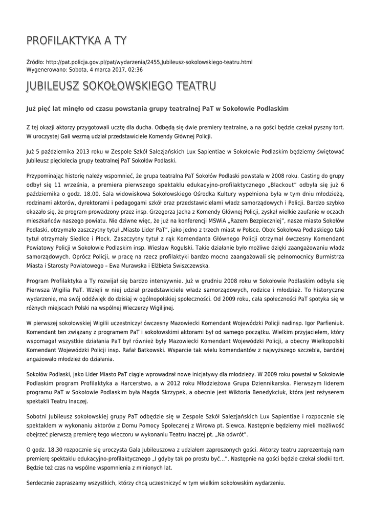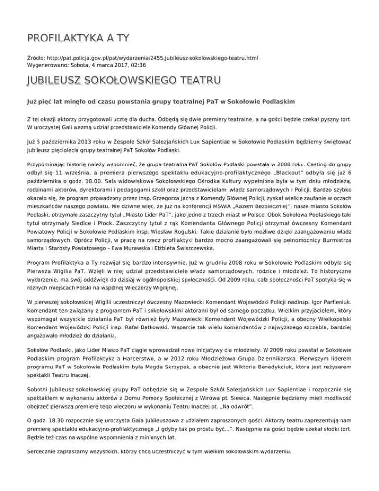 PROFILAKTYKA A TY Źródło: http://pat.policja.gov.pl/pat/wydarzenia/2455,Jubileusz-sokolowskiego-teatru.html Wygenerowano: Sobota, 4 marca 2017, 02:36 JUBILEUSZ SOKOŁOWSKIEGO TEATRU Już pięć lat minęło od czasu powstania grupy teatralnej PaT w Sokołowie Podlaskim Z tej okazji aktorzy przygotowali ucztę dla ducha. Odbędą się dwie premiery teatralne, a na gości będzie czekał pyszny tort. W uroczystej Gali wezmą udział przedstawiciele Komendy Głównej Policji. Już 5 października 2013 roku w Zespole Szkół Salezjańskich Lux Sapientiae w Sokołowie Podlaskim będziemy świętować Jubileusz pięciolecia grupy teatralnej PaT Sokołów Podlaski. Przypominając historię należy wspomnieć, że grupa teatralna PaT Sokołów Podlaski powstała w 2008 roku. Casting do grupy odbył się 11 września, a premiera pierwszego spektaklu edukacyjno-profilaktycznego „Blackout” odbyła się już 6 października o godz. 18.00. Sala widowiskowa Sokołowskiego Ośrodka Kultury wypełniona była w tym dniu młodzieżą, rodzinami aktorów, dyrektorami i pedagogami szkół oraz przedstawicielami władz samorządowych i Policji. Bardzo szybko okazało się, że program prowadzony przez insp. Grzegorza Jacha z Komendy Głównej Policji, zyskał wielkie zaufanie w oczach mieszkańców naszego powiatu. Nie dziwne więc, że już na konferencji MSWiA „Razem Bezpieczniej”, nasze miasto Sokołów Podlaski, otrzymało zaszczytny tytuł „Miasto Lider PaT”, jako jedno z trzech miast w Polsce. Obok Sokołowa Podlaskiego taki tytuł otrzymały Siedlce i Płock. Zaszczytny tytuł z rąk Komendanta Głównego Policji otrzymał ówczesny Komendant Powiatowy Policji w Sokołowie Podlaskim insp. Wiesław Rogulski. Takie działanie było możliwe dzięki zaangażowaniu władz samorządowych. Oprócz Policji, w pracę na rzecz profilaktyki bardzo mocno zaangażowali się pełnomocnicy Burmistrza Miasta i Starosty Powiatowego – Ewa Murawska i Elżbieta Świszczewska. Program Profilaktyka a Ty rozwijał się bardzo intensywnie. Już w grudniu 2008 roku w Sokołowie Podlaskim odbyła się Pierwsza Wigilia PaT. Wzięli w niej udział przedstawiciele władz samorządowych, rodzice i młodzież. To historyczne wydarzenie, ma swój oddźwięk do dzisiaj w ogólnopolskiej społeczności. Od 2009 roku, cała społeczności PaT spotyka się w różnych miejscach Polski na wspólnej Wieczerzy Wigilijnej. W pierwszej sokołowskiej Wigilii uczestniczył ówczesny Mazowiecki Komendant Wojewódzki Policji nadinsp. Igor Parfieniuk. Komendant ten związany z programem PaT i sokołowskimi aktorami był od samego początku. Wielkim przyjacielem, który wspomagał wszystkie działania PaT był również były Mazowiecki Komendant Wojewódzki Policji, a obecny Wielkopolski Komendant Wojewódzki Policji insp. Rafał Batkowski. Wsparcie tak wielu komendantów z najwyższego szczebla, bardziej angażowało młodzież do działania. Sokołów Podlaski, jako Lider Miasto PaT ciągle wprowadzał nowe inicjatywy dla młodzieży. W 2009 roku powstał w Sokołowie Podlaskim program Profilaktyka a Harcerstwo, a w 2012 roku Młodzieżowa Grupa Dziennikarska. Pierwszym liderem programu PaT w Sokołowie Podlaskim była Magda Skrzypek, a obecnie jest Wiktoria Benedykciuk, która jest reżyserem spektakli Teatru Inaczej. Sobotni Jubileusz sokołowskiej grupy PaT odbędzie się w Zespole Szkół Salezjańskich Lux Sapientiae i rozpocznie się spektaklem w wykonaniu aktorów z Domu Pomocy Społecznej z Wirowa pt. Siewca. Następnie będziemy mieli możliwość obejrzeć pierwszą premierę tego wieczoru w wykonaniu Teatru Inaczej pt. „Na odwrót”. O godz. 18.30 rozpocznie się uroczysta Gala Jubileuszowa z udziałem zaproszonych gości. Aktorzy teatru zaprezentują nam premierę spektaklu edukacyjno-profilaktycznego „I gdyby tak po prostu być…”. Następnie na gości będzie czekał słodki tort. Będzie też czas na wspólne wspomnienia z minionych lat. Serdecznie zapraszamy wszystkich, którzy chcą uczestniczyć w tym wielkim sokołowskim wydarzeniu. asp.szt. Sławomir Tomaszewski Zainstaluj wtyczkę Flash, aby zobaczyć odtwarzacz. pobierz film - 5.76 MB Ocena: 0/5 (0) Tweetnij