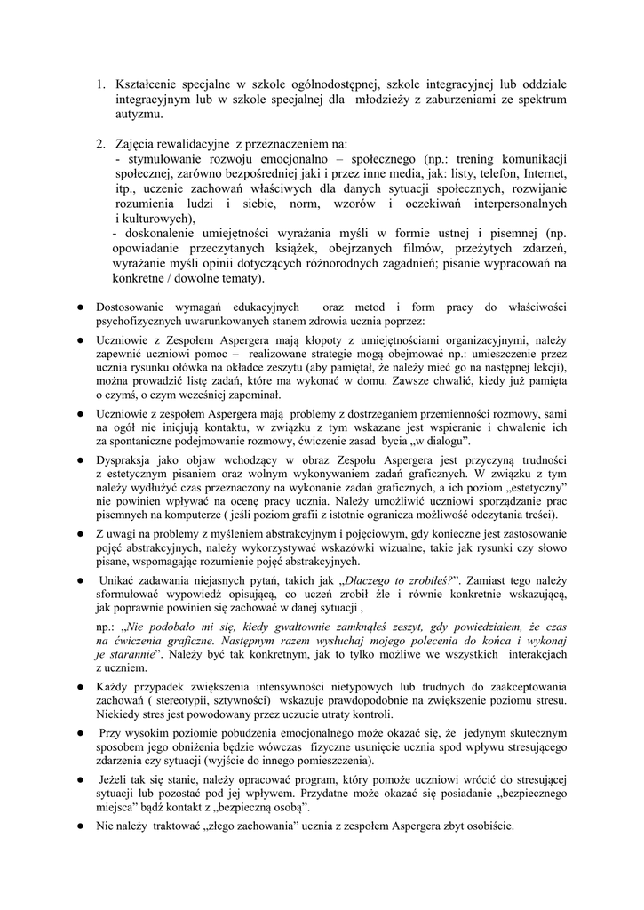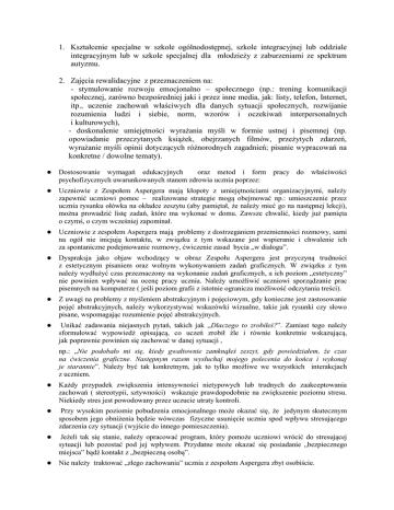 1. Kształcenie specjalne w szkole ogólnodostępnej, szkole integracyjnej lub oddziale integracyjnym lub w szkole specjalnej dla młodzieży z zaburzeniami ze spektrum autyzmu. 2. Zajęcia rewalidacyjne z przeznaczeniem na: - stymulowanie rozwoju emocjonalno – społecznego (np.: trening komunikacji społecznej, zarówno bezpośredniej jaki i przez inne media, jak: listy, telefon, Internet, itp., uczenie zachowań właściwych dla danych sytuacji społecznych, rozwijanie rozumienia ludzi i siebie, norm, wzorów i oczekiwań interpersonalnych i kulturowych), - doskonalenie umiejętności wyrażania myśli w formie ustnej i pisemnej (np. opowiadanie przeczytanych książek, obejrzanych filmów, przeżytych zdarzeń, wyrażanie myśli opinii dotyczących różnorodnych zagadnień; pisanie wypracowań na konkretne / dowolne tematy). Dostosowanie wymagań edukacyjnych oraz metod i form pracy do właściwości psychofizycznych uwarunkowanych stanem zdrowia ucznia poprzez: Uczniowie z Zespołem Aspergera mają kłopoty z umiejętnościami organizacyjnymi, należy zapewnić uczniowi pomoc – realizowane strategie mogą obejmować np.: umieszczenie przez ucznia rysunku ołówka na okładce zeszytu (aby pamiętał, że należy mieć go na następnej lekcji), można prowadzić listę zadań, które ma wykonać w domu. Zawsze chwalić, kiedy już pamięta o czymś, o czym wcześniej zapominał. Uczniowie z zespołem Aspergera mają problemy z dostrzeganiem przemienności rozmowy, sami na ogół nie inicjują kontaktu, w związku z tym wskazane jest wspieranie i chwalenie ich za spontaniczne podejmowanie rozmowy, ćwiczenie zasad bycia „w dialogu”. Dyspraksja jako objaw wchodzący w obraz Zespołu Aspergera jest przyczyną trudności z estetycznym pisaniem oraz wolnym wykonywaniem zadań graficznych. W związku z tym należy wydłużyć czas przeznaczony na wykonanie zadań graficznych, a ich poziom „estetyczny” nie powinien wpływać na ocenę pracy ucznia. Należy umożliwić uczniowi sporządzanie prac pisemnych na komputerze ( jeśli poziom grafii z istotnie ogranicza możliwość odczytania treści). Z uwagi na problemy z myśleniem abstrakcyjnym i pojęciowym, gdy konieczne jest zastosowanie pojęć abstrakcyjnych, należy wykorzystywać wskazówki wizualne, takie jak rysunki czy słowo pisane, wspomagając rozumienie pojęć abstrakcyjnych. Unikać zadawania niejasnych pytań, takich jak „Dlaczego to zrobiłeś?”. Zamiast tego należy sformułować wypowiedź opisującą, co uczeń zrobił źle i równie konkretnie wskazującą, jak poprawnie powinien się zachować w danej sytuacji , np.: „Nie podobało mi się, kiedy gwałtownie zamknąłeś zeszyt, gdy powiedziałem, że czas na ćwiczenia graficzne. Następnym razem wysłuchaj mojego polecenia do końca i wykonaj je starannie”. Należy być tak konkretnym, jak to tylko możliwe we wszystkich interakcjach z uczniem. Każdy przypadek zwiększenia intensywności nietypowych lub trudnych do zaakceptowania zachowań ( stereotypii, sztywności) wskazuje prawdopodobnie na zwiększenie poziomu stresu. Niekiedy stres jest powodowany przez uczucie utraty kontroli. Przy wysokim poziomie pobudzenia emocjonalnego może okazać się, że jedynym skutecznym sposobem jego obniżenia będzie wówczas fizyczne usunięcie ucznia spod wpływu stresującego zdarzenia czy sytuacji (wyjście do innego pomieszczenia). Jeżeli tak się stanie, należy opracować program, który pomoże uczniowi wrócić do stresującej sytuacji lub pozostać pod jej wpływem. Przydatne może okazać się posiadanie „bezpiecznego miejsca” bądź kontakt z „bezpieczną osobą”. Nie należy traktować „złego zachowania” ucznia z zespołem Aspergera zbyt osobiście. Tego typu zachowania są zwykle efektem starań zmierzających do wyjścia cało z doświadczeń, które mogą powodować wystąpienie zakłopotania, dezorientacji czy strachu. Osoby dotknięte zespołem Aspergera są silnie skoncentrowane na sobie, między innymi dlatego, że odczytywanie reakcji innych ludzi jest dla nich skrajnie trudne. W związku z tym niezbędne jest ćwiczenie empatii, umiejętności rozpoznawania emocji (bardzo przydatne w tym celu mogą okazać się piktogramy symbolizujące podstawowe emocje, typu: złość, radość, smutek, gniew itp.; fotografie twarzy ludzi przeżywających różne emocje) wzmacnianie kompetencji społecznych, np.: poprzez wypracowanie i stosowanie formułek (mogą być również spisane dla przypomnienia), typu: „Nie chciałem Pani/Pana/Ciebie urazić”. „Nie wiem , co chcesz abym zrobił”. W przypadkach skumulowania napięcia emocjonalnego, objawiających się np.: krzykiem, złością, problemami z podporządkowaniem się, nie należy wdawać się z uczniem w dyskusję, lepiej umożliwić mu wyciszenie się np. w „bezpiecznym miejscu” pod opieką nauczyciela. Należy używać i interpretować język dosłownie, unikać: idiomów (np. „i tu jest pies pogrzebany”, czy „nie taki diabeł straszny”) podwójnych znaczeń (większość dowcipów wykorzystuje podwójne znaczenia) sarkazmu (np. nie mów „Wspaniale!" po tym jak uczeń właśnie całkowicie niepoprawnie odpowiedział na pytanie/ wykonał zadanie) nie używaj przezwisk ani „miłych" odzywek (np. „Chłopcze”, „Koleś”, czy „Mądralo”) Należy pamiętać, że mimika i inne społeczne wskazówki mogą nie zostać zrozumiane - problemy z odczytywaniem wyrazu twarzy oraz mowy ciała. Jeżeli wydaje ci się, że uczeń niczego się nie uczy wykonując dane zadanie, to rozbij je na krótsze etapy lub przedstaw je na kilka sposobów (np. wizualnie, słownie, fizycznie). Należy unikać wielomówstwa. Być konkretnym. Używać krótszych zdań, co zwiększy szanse na wyłapanie przez ucznia istotnych informacji. Bardzo ważne! Sztywność i słaba tolerancja na zmiany, to cecha charakterystyczna chorych z zespołem Aspergera. Należy przygotowywać ucznia na ws