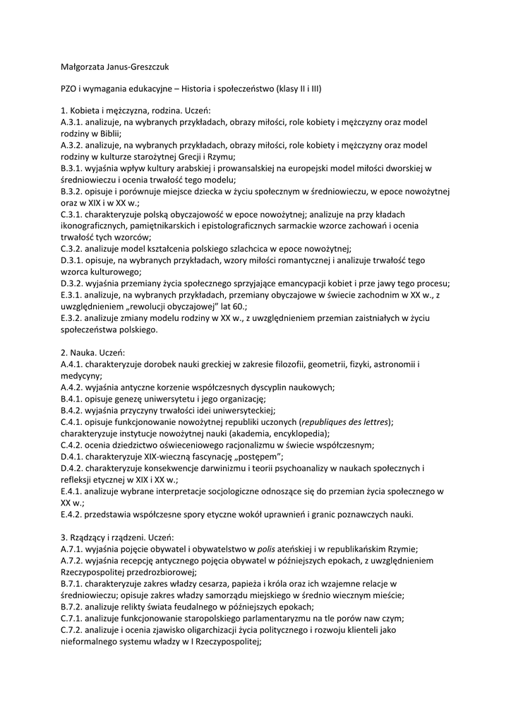 Małgorzata Janus-Greszczuk PZO i wymagania edukacyjne – Historia i społeczeństwo (klasy II i III) 1. Kobieta i mężczyzna, rodzina. Uczeń: A.3.1. analizuje, na wybranych przykładach, obrazy miłości, role kobiety i mężczyzny oraz model rodziny w Biblii; A.3.2. analizuje, na wybranych przykładach, obrazy miłości, role kobiety i mężczyzny oraz model rodziny w kulturze starożytnej Grecji i Rzymu; B.3.1. wyjaśnia wpływ kultury arabskiej i prowansalskiej na europejski model miłości dworskiej w średniowieczu i ocenia trwałość tego modelu; B.3.2. opisuje i porównuje miejsce dziecka w życiu społecznym w średniowieczu, w epoce nowożytnej oraz w XIX i w XX w.; C.3.1. charakteryzuje polską obyczajowość w epoce nowożytnej; analizuje na przy kładach ikonograficznych, pamiętnikarskich i epistolograficznych sarmackie wzorce zachowań i ocenia trwałość tych wzorców; C.3.2. analizuje model kształcenia polskiego szlachcica w epoce nowożytnej; D.3.1. opisuje, na wybranych przykładach, wzory miłości romantycznej i analizuje trwałość tego wzorca kulturowego; D.3.2. wyjaśnia przemiany życia społecznego sprzyjające emancypacji kobiet i prze jawy tego procesu; E.3.1. analizuje, na wybranych przykładach, przemiany obyczajowe w świecie zachodnim w XX w., z uwzględnieniem „rewolucji obyczajowej” lat 60.; E.3.2. analizuje zmiany modelu rodziny w XX w., z uwzględnieniem przemian zaistniałych w życiu społeczeństwa polskiego. 2. Nauka. Uczeń: A.4.1. charakteryzuje dorobek nauki greckiej w zakresie filozofii, geometrii, fizyki, astronomii i medycyny; A.4.2. wyjaśnia antyczne korzenie współczesnych dyscyplin naukowych; B.4.1. opisuje genezę uniwersytetu i jego organizację; B.4.2. wyjaśnia przyczyny trwałości idei uniwersyteckiej; C.4.1. opisuje funkcjonowanie nowożytnej republiki uczonych (republiques des lettres); charakteryzuje instytucje nowożytnej nauki (akademia, encyklopedia); C.4.2. ocenia dziedzictwo oświeceniowego racjonalizmu w świecie współczesnym; D.4.1. charakteryzuje XIX-wieczną fascynację „postępem”; D.4.2. charakteryzuje konsekwencje darwinizmu i teorii psychoanalizy w naukach społecznych i refleksji etycznej w XIX i XX w.; E.4.1. analizuje wybrane interpretacje socjologiczne odnoszące się do przemian życia społecznego w XX w.; E.4.2. przedstawia współczesne spory etyczne wokół uprawnień i granic poznawczych nauki. 3. Rządzący i rządzeni. Uczeń: A.7.1. wyjaśnia pojęcie obywatel i obywatelstwo w polis ateńskiej i w republikańskim Rzymie; A.7.2. wyjaśnia recepcję antycznego pojęcia obywatel w późniejszych epokach, z uwzględnieniem Rzeczypospolitej przedrozbiorowej; B.7.1. charakteryzuje zakres władzy cesarza, papieża i króla oraz ich wzajemne relacje w średniowieczu; opisuje zakres władzy samorządu miejskiego w średnio wiecznym mieście; B.7.2. analizuje relikty świata feudalnego w późniejszych epokach; C.7.1. analizuje funkcjonowanie staropolskiego parlamentaryzmu na tle porów naw czym; C.7.2. analizuje i ocenia zjawisko oligarchizacji życia politycznego i rozwoju klienteli jako nieformalnego systemu władzy w I Rzeczypospolitej; D.7.1. analizuje, na wybranych przykładach, zjawisko rewolucji społeczno-politycznej i je go ideowe korzenie; D.7.2. analizuje, na wybranych przykładach, ruch anarchistyczny; E.7.1. analizuje, na wybranych przykładach, działalność opozycji politycznej w PRL; E.7.2. objaśnia pojęcie antyutopii, odwołując się do prac Orwella i Huxleya. 4. Ojczysty Panteon i ojczyste spory. Uczeń: A.9.1. charakteryzuje, na wybranych przykładach, antyczne wzory bohaterstwa, żołnierza i obrońcy ojczyzny oraz ich recepcję w polskiej myśli politycznej, tradycji literackiej oraz edukacyjnej późniejszych epok; A.9.2. charakteryzuje antyczny wzorzec obywatela oraz jego recepcję w polskiej myśli i praktyce politycznej późniejszych epok; B.9.1. charakteryzuje, na wybranych przykładach, koncepcje polityczne władców z dynastii piastowskiej; B.9.2. charakteryzuje oraz ocenia, na wybranych przykładach, rolę ludzi Kościoła w bu dowie państwa polskiego; C.9.1 charakteryzuje, na wybranych przykładach, postawy obywateli wobec wyzwań epoki (XVI–XVIII w.); C.9.2. charakteryzuje spory o przyczyny upadku I Rzeczypospolitej; D.9.1 charakteryzuje i ocenia polityczne koncepcje nurtu insurekcyjnego oraz nurtu realizmu politycznego; D.9.2. charakteryzuje spory o ocenę dziewiętnastowiecznych powstań narodowych; E.9.1. charakteryzuje spory o kształt Polski w XX w., uwzględniając cezury 1918 r., 1944–1945, 1989 r., oraz prezentuje sylwetki czołowych uczestników tych wydarzeń; E.9.2. charakteryzuje postawy społeczne wobec totalitarnej władzy, uwzględniając różno rodne formy oporu, oraz koncepcje współpracy lub przystosowania. PZO Sprawdziany – 20p. Kartkówki – 10p. Odpowiedzi – 10p. Zadania domowe – 10p. Aktywność – 5p. Projekt – 20p. Punkty w ponad podstawach: udział w konkursach i olimpiadach, lektury Przeliczanie punktów na oceny wg WSO.