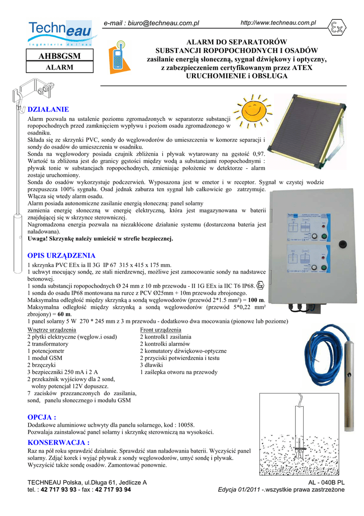 e-mail : [email protected] AHB8GSM ALARM http://www.techneau.com.pl ALARM DO SEPARATORÓW SUBSTANCJI ROPOPOCHODNYCH I OSADÓW zasilanie energią słoneczną, sygnał dźwiękowy i optyczny, z zabezpieczeniem certyfikowanym przez ATEX URUCHOMIENIE i OBSŁUGA DZIAŁANIE Alarm pozwala na ustalenie poziomu zgromadzonych w separatorze substancji ropopochodnych przed zamknięciem wypływu i poziom osadu zgromadzonego w osadniku. Składa się ze skrzynki PVC, sondy do węglowodorów do umieszczenia w komorze separacji i sondy do osadów do umieszczenia w osadniku. Sonda na węglowodory posiada czujnik zbliżenia i pływak wytarowany na gęstość 0,97. Wartość ta zbliżona jest do granicy gęstości między wodą a substancjami ropopochodnymi : pływak tonie w substancjach ropopochodnych, zmieniając położenie w detektorze - alarm zostaje uruchomiony. Sonda do osadów wykorzystuje podczerwień. Wyposazona jest w emetor i w receptor. Sygnał w czystej wodzie przepuszcza 100% sygnału. Osad jednak zaburza ten sygnał lub całkowicie go zatrzymuje. Włącza się wtedy alarm osadu. Alarm posiada autonomiczne zasilanie energią słoneczną: panel solarny zamienia energię słoneczną w energię elektryczną, która jest magazynowana w baterii znajdującej się w skrzynce sterowniczej. Nagromadzona energia pozwala na niezakłócone działanie systemu (dostarczona bateria jest naładowana). Uwaga! Skrzynkę należy umieścić w strefie bezpiecznej. OPIS URZĄDZENIA 1 skrzynka PVC EEx ia II 3G IP 67 315 x 415 x 175 mm. 1 uchwyt mocujący sondę, ze stali nierdzewnej, możliwe jest zamocowanie sondy na nadstawce betonowej. 1 sonda substancji ropopochodnych Ø 24 mm z 10 mb przewodu - II 1G EEx ia IIC T6 IP68. 1 sonda do osadu IP68 montowana na rurce z PCV Ø25mm + 10m przewodu zbrojonego. Maksymalna odległość między skrzynką a sondą węglowodorów (przewód 2*1.5 mm²) = 100 m. Maksymalna odległość między skrzynką a sondą węglowodorów (przewód 5*0,22 mm² zbrojony) = 60 m. 1 panel solarny 5 W 270 * 245 mm z 3 m przewodu - dodatkowo dwa mocowania (pionowe lub poziome) Wnętrze urządzenia Front urządzenia 2 płytki elektryczne (węglow.i osad) 2 kontrolk1 zasilania 2 transformatory 2 kontrolki alarmów 1 potencjometr 2 komutatory dźwiękowo-optyczne 1 moduł GSM 2 przyciski potwierdzenia i testu 2 brzęczyki 3 dławiki 3 bezpieczniki 250 mA i 2 A 1 zaślepka otworu na przewody 2 przekaźnik wyjściowy dla 2 sond, wolny potencjał 12V dopuszcz. 7 zacisków przezanczonych do zasilania, sond, panelu słonecznego i modułu GSM OPCJA : Dodatkowe aluminiowe uchwyty dla panelu solarnego, kod : 10058. Pozwalaja zainstalować panel solarny i skrzynkę sterowniczą na wysokości. KONSERWACJA : Raz na pół roku sprawdzić działanie. Sprawdzić stan naładowania baterii. Wyczyścić panel solarny. Zdjąć korek i wyjąć pływak z sondy węglowodorów, umyć sondę i pływak. Wyczyścić także sondę osadów. Zamontować ponownie. TECHNEAU Polska, ul.Długa 61, Jedlicze A tel. : 42 717 93 93 - fax : 42 717 93 94 AL - 040B PL Edycja 01/2011 -.wszystkie prawa zastrzeżone