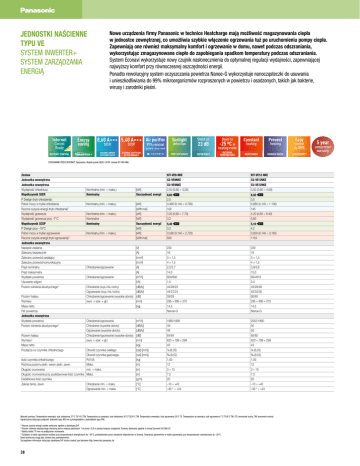 JEDNOSTKI NAŚCIENNE TYPU VE SYSTEM INWERTER+ SYSTEM ZARZĄDZANIA ENERGIĄ Energy Internet saving 8,60 A+++ 5,40 A+++ Air purifier SEER SCOP 99% removal AL N TIO INTERNET CONTROL Sunlight detection bacteria · virus · mold OP Control Ready Nowe urządzenia firmy Panasonic w technice Heatcharge mają możliwość magazynowania ciepła w jednostce zewnętrznej, co umożliwia szybkie włączenie ogrzewania tuż po uruchomieniu pompy ciepła. Zapewniają one również maksymalny komfort i ogrzewanie w domu, nawet podczas odszraniania, wykorzystując zmagazynowane ciepło do zapobiegania spadkom temperatury podczas odszraniania. System Econavi wykorzystuje nowy czujnik nasłonecznienia do optymalnej regulacji wydajności, zapewniającej najwyższy komfort przy równoczesnej oszczędności energii. Ponadto rewolucyjny system oczyszczania powietrza Nanoe-G wykorzystuje nanocząsteczki do usuwania i unieszkodliwiania do 99% mikroorganizmów rozproszonych w powietrzu i osadzonych, takich jak bakterie, wirusy i zarodniki pleśni. SEASONAL ENERGY EFFICIENCY RATIO SEASONAL COEFFICIENT OF PERFORMANCE Silent air 23 dB SUPER QUIET Down to -25 ºC in heating mode OUTDOOR TEMPERATURE Constant heating HEATCHARGE Prevent control by BMS SUMMER HOUSE CONNECTIVITY STEROWANIE PRZEZ INTERNET: Opcjonalne. Współczynniki SEER i SCOP: zestaw KIT-VE9-NKE. Zestaw Jednostka wewnętrzna Jednostka zewnętrzna Wydajność chłodnicza Współczynnik SEER P Design (tryb chłodzenia) Pobór mocy w trybie chłodzenia Roczne zużycie energii (tryb chłodzenia)1 Wydajność grzewcza Wydajność grzewcza przy –7°C Współczynnik SCOP P Design przy –10°C Pobór mocy w trybie ogrzewania Roczne zużycie energii (tryb ogrzewania)1 Jednostka wewnętrzna Napięcie zasilania Zalecany bezpiecznik Zalecany przewód zasilający Zalecany przewód komunikacyjny Prąd nominalny Prąd maksymalny Wydatek powietrza Usuwanie wilgoci Poziom ciśnienia akustycznego2 Poziom hałasu Wymiary Masa netto Filtr powietrza Jednostka zewnętrzna Wydatek powietrza Poziom ciśnienia akustycznego2 Poziom hałasu Wymiary3 Masa netto Przyłącza rur czynnika chłodniczego KIT-VE9-NKE CS-VE9NKE CU-VE9NKE 2,50 (0,60 ÷ 3,00) KIT-VE12-NKE CS-VE12NKE CU-VE12NKE 3,50 (0,60 ÷ 4,00) 8,60 j 2,5 0,480 (0,140 ÷ 0,790) 102 3,20 (0,60 ÷ 7,70) 3,2 8,50 j 3,5 0,880 (0,140 ÷ 1,100) 145 4,20 (0,60 ÷ 8,40) 5,60 5,40 j 3,2 0,580 (0,140 ÷ 2,720) 830 5,10 j 4,2 0,850 (0,140 ÷ 3,160) 1153 [V] [A] [mm²] [mm²] Chłodzenie/ogrzewanie [A] [A] Chłodzenie/ogrzewanie [m³/h] [l/h] Chłodzenie (wys./nis./cichy) [dB(A)] Ogrzewanie (wys./nis./cichy) [dB(A)] Chłodzenie/ogrzewanie (wysokie obroty) [dB] (wys. × szer. × gł.) [mm] [kg] 230 16 3 × 1,5 4 × 1,5 2,2/2,7 14,0 600/600 1,5 44/26/23 44/27/24 59/59 295 × 890 × 275 14,5 Nanoe-G 230 16 3 × 1,5 4 × 1,5 3,9/3,8 15,0 654/618 2,0 45/29/26 45/33/30 60/60 295 × 890 × 275 14,5 Nanoe-G Chłodzenie/ogrzewanie Chłodzenie (wysokie obroty) Ogrzewanie (wysokie obroty) Chłodzenie/ogrzewanie (wysokie obroty) (wys. × szer. × gł.) 1980/1890 49 49 64/64 623 × 799 × 299 43 ¼ (6,35) ⅜ (9,52) 1,50 12 3 ÷ 15 7,5 20 –10 ÷ +43 –30 4 ÷ +24 2052/1890 50 50 65/65 623 × 799 × 299 43 ¼ (6,35) ⅜ (9,52) 1,50 12 3 ÷ 15 7,5 20 –10 ÷ +43 –30 4 ÷ +24 Nominalna (min. ÷ maks.) Nominalny [kW] Oszczędność energii Nominalny (min. ÷ maks.) [kW] [kWh/rok] [kW] [kW] Oszczędność energii [kW] [kW] [kWh/rok] Nominalna (min. ÷ maks.) Nominalna Nominalny Nominalny (min. ÷ maks.) Obwód czynnika ciekłego Obwód czynnika gazowego Ilość czynnika chłodniczego R410A Różnica poziomu jedn. wewn./jedn. zewn. Maks. Długość orurowania min. ÷ maks. Długość orurowania przy podstawowej ilości czynnika Maks. Dodatkowa ilość czynnika Zakres temp. zewn. Chłodzenie min. ÷ maks. Ogrzewanie min. ÷ maks. [m³/h] [dB(A)] [dB(A)] [dB] [mm] [kg] [cal] ([mm]) [cal] ([mm]) [kg] [m] [m] [m] [g/m] [°C] [°C] Warunki pomiaru: Temperatura wewnątrz, tryb chłodzenia 27°C TS/19°C TM. Temperatura na zewnątrz, tryb chłodzenia 35°C TS/24°C TM. Temperatura wewnątrz, tryb ogrzewania 20°C TS. Temperatura na zewnątrz, tryb ogrzewania 7°C TS/6°C TM. (TS: termometr suchy; TM: termometr mokry) Ograniczenia dotyczące połączeń: jednostki typu JKE nie są kompatybilne z jednostkami typu PKE. Roczne zużycie energii zostało wyliczone zgodnie z dyrektywą ErP. Poziom ciśnienia akustycznego mierzony jest w miejscu położonym 1 m przed i 0,8 m poniżej korpusu urządzenia. Pomiaru dokonano zgodnie z normą Eurovent 6/C/006-97. Należy dodać 70 mm na podłączenie orurowania. 4) Działanie w trybie ogrzewania możliwe przy temperaturach zewnętrznych do –30°C, przetestowane przez niezależne laboratorium w Szwecji. Gwarancja parametrów w trybie ogrzewania przy temperaturach zewnętrznych do –20°C. Dane techniczne mogą ulec zmianie bez powiadomienia. Szczegółowe informacje dotyczące dyrektywy ErP można znaleźć pod adresem http://www.doc.panasonic.de 1) 2) 3) 38 Easy freezing 5 year compressor warranty