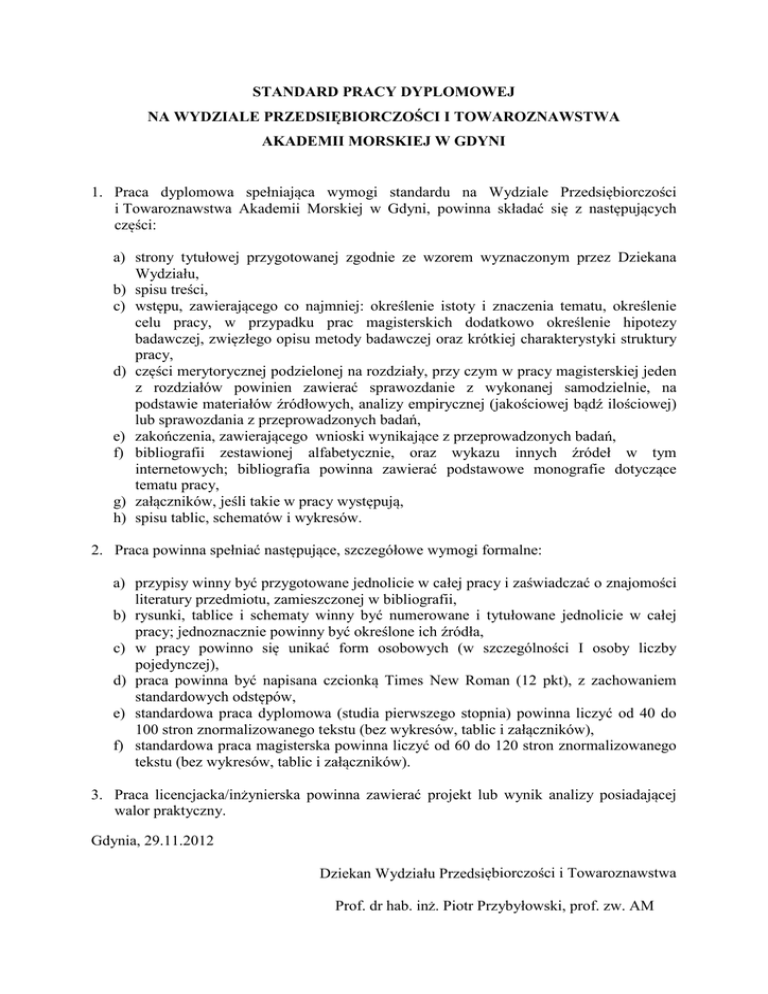 STANDARD PRACY DYPLOMOWEJ NA WYDZIALE PRZEDSIĘBIORCZOŚCI I TOWAROZNAWSTWA AKADEMII MORSKIEJ W GDYNI 1. Praca dyplomowa spełniająca wymogi standardu na Wydziale Przedsiębiorczości i Towaroznawstwa Akademii Morskiej w Gdyni, powinna składać się z następujących części: a) strony tytułowej przygotowanej zgodnie ze wzorem wyznaczonym przez Dziekana Wydziału, b) spisu treści, c) wstępu, zawierającego co najmniej: określenie istoty i znaczenia tematu, określenie celu pracy, w przypadku prac magisterskich dodatkowo określenie hipotezy badawczej, zwięzłego opisu metody badawczej oraz krótkiej charakterystyki struktury pracy, d) części merytorycznej podzielonej na rozdziały, przy czym w pracy magisterskiej jeden z rozdziałów powinien zawierać sprawozdanie z wykonanej samodzielnie, na podstawie materiałów źródłowych, analizy empirycznej (jakościowej bądź ilościowej) lub sprawozdania z przeprowadzonych badań, e) zakończenia, zawierającego wnioski wynikające z przeprowadzonych badań, f) bibliografii zestawionej alfabetycznie, oraz wykazu innych źródeł w tym internetowych; bibliografia powinna zawierać podstawowe monografie dotyczące tematu pracy, g) załączników, jeśli takie w pracy występują, h) spisu tablic, schematów i wykresów. 2. Praca powinna spełniać następujące, szczegółowe wymogi formalne: a) przypisy winny być przygotowane jednolicie w całej pracy i zaświadczać o znajomości literatury przedmiotu, zamieszczonej w bibliografii, b) rysunki, tablice i schematy winny być numerowane i tytułowane jednolicie w całej pracy; jednoznacznie powinny być określone ich źródła, c) w pracy powinno się unikać form osobowych (w szczególności I osoby liczby pojedynczej), d) praca powinna być napisana czcionką Times New Roman (12 pkt), z zachowaniem standardowych odstępów, e) standardowa praca dyplomowa (studia pierwszego stopnia) powinna liczyć od 40 do 100 stron znormalizowanego tekstu (bez wykresów, tablic i załączników), f) standardowa praca magisterska powinna liczyć od 60 do 120 stron znormalizowanego tekstu (bez wykresów, tablic i załączników). 3. Praca licencjacka/inżynierska powinna zawierać projekt lub wynik analizy posiadającej walor praktyczny. Gdynia, 29.11.2012 Dziekan Wydziału Przedsiębiorczości i Towaroznawstwa Prof. dr hab. inż. Piotr Przybyłowski, prof. zw. AM
