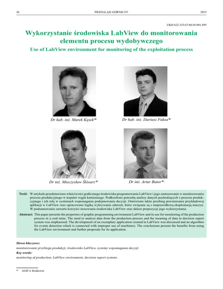 26 PRZEGLĄD GÓRNICZY 2015 UKD 622.333:67/68.05:001.895 Wykorzystanie środowiska LabView do monitorowania elementu procesu wydobywczego Use of LabView environment for monitoring of the exploitation process Dr hab. inż. Marek Kęsek*) Dr hab. inż. Dariusz Fuksa*) Dr inż. Mieczysław Ślósarz*) Dr inż. Artur Bator*) Treść: W artykule przedstawiono właściwości graficznego środowiska programowania LabView i jego zastosowanie w monitorowaniu procesu produkcyjnego w kopalni węgla kamiennego. Podkreślono potrzebę analizy danych pochodzących z procesu produkcyjnego i ich rolę w systemach wspomagania podejmowania decyzji. Omówiono także przebieg powstawania przykładowej aplikacji w LabView oraz opracowano logikę wykrywania zdarzeń, które związane są z nieprawidłową eksploatacją maszyn. W podsumowaniu zawarto korzyści stosowania środowiska LabView oraz dalsze propozycje jego wykorzystania. Abstract: This paper presents the properties of graphic programming environment LabView and its use for monitoring of the production process in a coal mine. The need to analyse data from the production process and the meaning of data in decision suport system was emphasized. The development of an exemplary application created in LabView was discussed and an algorithm for events detection which is connected with improper use of machinery. The conclusions present the benefits from using the LabView environment and further proposals for its application. Słowa kluczowe: monitorowanie przebiegu produkcji, środowisko LabView, systemy wspomagania decyzji Key words: monitoring of production, LabView environment, decision suport systems *) AGH w Krakowie Nr 8 PRZEGLĄD GÓRNICZY 1. Wprowadzenie Obserwowany obecnie postęp techniczny, wynikający z wzajemnego napędzania się elektroniki i informatyki, przejawia się również w unowocześnianiu maszyn wykorzystywanych w przemyśle górniczym. Urządzenia coraz częściej wyposażane są w różnego rodzaju czujniki i elementy wykonawcze zdalnie sterowane. Rozwiązania te bezsprzecznie zwiększają bezpieczeństwo procesu wydobywczego oraz dają pole do opracowania rozwiązań prowadzących do stworzenia inteligentnej kopalni, w której praca ludzka zostanie doprowadzona do niezbędnego minimum. Z pewnością jednak ostateczną kontrolę nad procesem wydobywczym sprawować będzie człowiek. Choćby z tego względu bardzo istotne stają się kwestie monitoringu procesu produkcyjnego oraz wspomagania człowieka w interpretacji coraz większej ilości danych pochodzących z czujników zainstalowanych w wyrobiskach i maszynach. Gromadzone na bieżąco dane mogą być analizowane przez programy komputerowe wykonujące się z jednej strony w kontrolerach urządzeń, a z drugiej w systemach wspomagania decyzji przetwarzających ogromne ilości danych w informacje pomocne do efektywnego zarządzania procesem produkcyjnym. Dużą rolę odgrywa tu monitoring procesów zachodzących w kopalni. Tworzenie aplikacji umożliwiających monitorowanie staje się łatwiejsze dzięki rozwojowi środowisk programistycznych wspomaganych przez dedykowane urządzenia pomiarowe, dających możliwości wygodnego programowania i wyprowadzania wyników algorytmów w formie sygnałów elektrycznych sterujących urządzenia. Jednym z takich środowisk jest stale rozwijające się środowisko LabView. 2. LabView LabView (ang. Laboratory Virtual Instrument Engineering Workbench) to zestaw programów opracowanych przez amerykańską firmę National Instruments, spełniających rolę środowiska programistycznego, zawierającego szeroki zestaw funkcji i udogodnień wspomagających pracę informatyków. To co odróżnia programowanie w LabView od programowania w innych językach, to sposób zapisu kodu programu. W LabView używa się graficznego „języka G”, w którym kod programu tworzony jest podobnie do budowania obwodów elektronicznych – poprzez łączenie elementów w taki sposób, aby realizowały założoną funkcję. Program napisany w środowisku LabView składa się z szeregu ikonek połączonych przewodami. Ikony odpowiadają za realizację odpowiednich funkcji, a przewody służą do przekazywania danych pomiędzy nimi. Program wykonywany jest zgodnie z koncepcją Data Flow, w której przewody doprowadzają dane do funkcji, a następnie odbierają z nich wyniki i przeprowadzają do następnych funkcji. Takie podejście do programowania jest bardzo intuicyjne dla inżynierów elektroników i dzięki dobrze opracowanemu systemu pomocy nie wymaga pamiętania nazw funkcji oraz kolejności i typów ich argumentów. National Instruments dostarcza także dedykowane urządzenia pomiarowe, które podłączone do komputera (kontrolera) pozwalają na automatyczną akwizycję danych (najczęściej pomiarów sygnałów elektrycznych) oraz na wyprowadzanie sygnałów wyjściowych. Koncepcja jaką przyjęła firma polega na dostarczaniu urządzeń pomiarowych, w których w zależności od potrzeb znaleźć można jednostkę sterującą oraz szereg slotów, w których umieszczane są odpowiednie karty pomiarowe. Takie rozwiązanie polega na elastycznym dopasowaniu urządzeń do danego zastosowania, a to pozwala 27 na ograniczenie ich kosztów. Na rysunku 1 przedstawiono szereg urządzeń, które w zależności od potrzeb oferowane są przez National Instruments. Urządzenia te opisywane są wyczerpująco na stronie producenta [8]. 3. Wspomaganie decyzji w przemyśle górniczym Specyfika przemysłu górniczego przejawiająca się przede wszystkim bezpośrednim uzależnieniem od warunków geologiczno-górniczych [6], ale także ekonomicznych, polegających na długim okresie zwrotu inwestycji, braku możliwości zbycia środków trwałych, takich jak wyrobiska górnicze itp., powoduje, że podjęcie decyzji dotyczących sposobu rozcięcia złoża, przyjęcia systemu eksploatacji, czy doboru maszyn pociąga skutki odczuwalne nawet przez kilka lat. Zatem zagadnienie wspomag