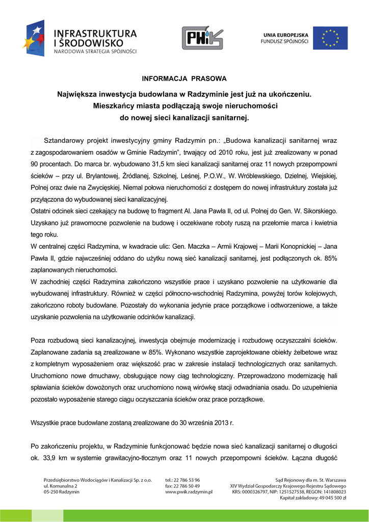 INFORMACJA PRASOWA Największa inwestycja budowlana w Radzyminie jest już na ukończeniu. Mieszkańcy miasta podłączają swoje nieruchomości do nowej sieci kanalizacji sanitarnej. Sztandarowy projekt inwestycyjny gminy Radzymin pn.: „Budowa kanalizacji sanitarnej wraz z zagospodarowaniem osadów w Gminie Radzymin”, trwający od 2010 roku, jest już zrealizowany w ponad 90 procentach. Do marca br. wybudowano 31,5 km sieci kanalizacji sanitarnej oraz 11 nowych przepompowni ścieków – przy ul. Brylantowej, Źródlanej, Szkolnej, Leśnej, P.O.W., W. Wróblewskiego, Dzielnej, Wiejskiej, Polnej oraz dwie na Zwycięskiej. Niemal połowa nieruchomości z dostępem do nowej infrastruktury została już przyłączona do wybudowanej sieci kanalizacyjnej. Ostatni odcinek sieci czekający na budowę to fragment Al. Jana Pawła II, od ul. Polnej do Gen. W. Sikorskiego. Uzyskano już prawomocne pozwolenie na budowę i oczekiwane roboty ruszą na przełomie marca i kwietnia tego roku. W centralnej części Radzymina, w kwadracie ulic: Gen. Maczka – Armii Krajowej – Marii Konopnickiej – Jana Pawła II, gdzie najwcześniej oddano do użytku nową sieć kanalizacji sanitarnej, jest podłączonych ok. 85% zaplanowanych nieruchomości. W zachodniej części Radzymina zakończono wszystkie prace i uzyskano pozwolenie na użytkowanie dla wybudowanej infrastruktury. Również w części północno-wschodniej Radzymina, powyżej torów kolejowych, zakończono roboty budowlane. Pozostały do wykonania jedynie prace porządkowe i odtworzeniowe, a także uzyskanie pozwolenia na użytkowanie odcinków kanalizacji. Poza rozbudową sieci kanalizacyjnej, inwestycja obejmuje modernizację i rozbudowę oczyszczalni ścieków. Zaplanowane zadania są zrealizowane w 85%. Wykonano wszystkie zaprojektowane obiekty żelbetowe wraz z kompletnym wyposażeniem oraz większość prac w zakresie instalacji technologicznych oraz sanitarnych. Uruchomiono nowe dmuchawy, obsługujące nowy ciąg technologiczny. Przeprowadzono modernizację hali spławiania ścieków dowożonych oraz uruchomiono nową wirówkę stacji odwadniania osadu. Do uzupełnienia pozostało wyposażenie starego ciągu oczyszczania ścieków oraz prace porządkowe. Wszystkie prace budowlane zostaną zrealizowane do 30 września 2013 r. Po zakończeniu projektu, w Radzyminie funkcjonować będzie nowa sieć kanalizacji sanitarnej o długości ok. 33,9 km w systemie grawitacyjno-tłocznym oraz 11 nowych przepompowni ścieków. Łączna długość kanalizacji będzie wynosić ponad 60 km. To pozwoli kolejnym 4000 mieszkańcom, zarówno z centrum Radzymina, jak i z terenów spoza miasta, na przyłączenie się do nowo wybudowanej infrastruktury. Modernizacja i rozbudowa oczyszczalni pozwoli na podwojenie dotychczasowej średniej 3 przepustowości obiektu, tj. do poziomu 4400 m na dobę. Ładunek zanieczyszczeń odprowadzanych do środowiska na terenie aglomeracji Radzymin zostanie znacznie zmniejszony, przy równoczesnym zwiększeniu ilości ścieków odprowadzanych do sieci kanalizacyjnej. Najważniejsze korzyści, jakich można się spodziewać po zakończonej inwestycji to poprawa jakości środowiska naturalnego aglomeracji poprzez redukcję zanieczyszczeń przedostających się do wód gruntowych i gleby, lepsza ochrona obszarów przyrodniczych prawnie chronionych, wyższa jakość usług kanalizacyjnych i mniejsza awaryjność systemów kanalizacyjnych. Całkowity koszt inwestycji wyniesie 79 958 081,85 PLN. Jej realizacja jest możliwa dzięki wsparciu finansowemu z unijnego Funduszu Spójności w ramach Programu Operacyjnego Infrastruktura i Środowisko, który pokryje 85 % kosztów kwalifikowalnych. Budowa kanalizacji sanitarnej wraz z zagospodarowaniem osadów w Gminie Radzymin dofinansowana przez Wojewódzki Fundusz Ochrony Środowiska i Gospodarki Wodnej w Warszawie, w formie pożyczki, w kwocie 16.429.000,00 zł. Zbigniew Piotrowski – Burmistrz Radzymina Małgorzata Klimkiewicz – Pełnomocnik ds. Realizacji Projektu (MAO) Więcej informacji na temat Projektu można uzyskać w siedzibie PWiK – tel. 22 786 53 96÷97