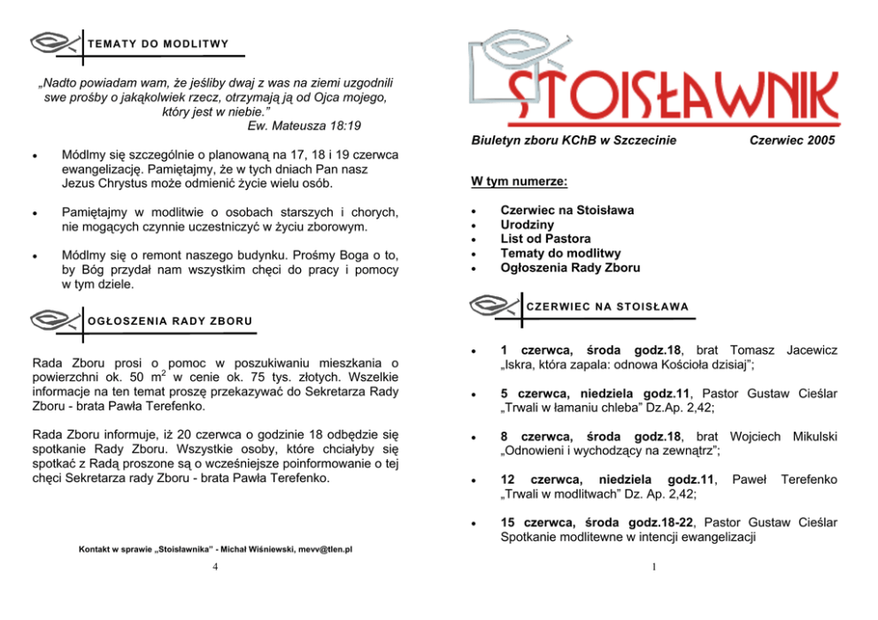 TEMATY DO MODLITWY „Nadto powiadam wam, że jeśliby dwaj z was na ziemi uzgodnili swe prośby o jakąkolwiek rzecz, otrzymają ją od Ojca mojego, który jest w niebie.” Ew. Mateusza 18:19 Biuletyn zboru KChB w Szczecinie • Módlmy się szczególnie o planowaną na 17, 18 i 19 czerwca ewangelizację. Pamiętajmy, że w tych dniach Pan nasz Jezus Chrystus może odmienić życie wielu osób. • Pamiętajmy w modlitwie o osobach starszych i chorych, nie mogących czynnie uczestniczyć w życiu zborowym. • Módlmy się o remont naszego budynku. Prośmy Boga o to, by Bóg przydał nam wszystkim chęci do pracy i pomocy w tym dziele. Czerwiec 2005 W tym numerze: • • • • • Czerwiec na Stoisława Urodziny List od Pastora Tematy do modlitwy Ogłoszenia Rady Zboru CZERWIEC NA STOISŁAWA OGŁOSZENIA RADY ZBORU Rada Zboru prosi o pomoc w poszukiwaniu mieszkania o powierzchni ok. 50 m2 w cenie ok. 75 tys. złotych. Wszelkie informacje na ten temat proszę przekazywać do Sekretarza Rady Zboru - brata Pawła Terefenko. Rada Zboru informuje, iż 20 czerwca o godzinie 18 odbędzie się spotkanie Rady Zboru. Wszystkie osoby, które chciałyby się spotkać z Radą proszone są o wcześniejsze poinformowanie o tej chęci Sekretarza rady Zboru - brata Pawła Terefenko. • 1 czerwca, środa godz.18, brat Tomasz Jacewicz „Iskra, która zapala: odnowa Kościoła dzisiaj”; • 5 czerwca, niedziela godz.11, Pastor Gustaw Cieślar „Trwali w łamaniu chleba” Dz.Ap. 2,42; • 8 czerwca, środa godz.18, brat Wojciech Mikulski „Odnowieni i wychodzący na zewnątrz”; • 12 czerwca, niedziela godz.11, „Trwali w modlitwach” Dz. Ap. 2,42; • 15 czerwca, środa godz.18-22, Pastor Gustaw Cieślar Spotkanie modlitewne w intencji ewangelizacji Kontakt w sprawie „Stoisławnika” - Michał Wiśniewski, [email protected] 4 1 Paweł Terefenko • 17 czerwca, piątek godz.18, Spotkanie ewangelizacyjne; dr Mark Edworthy • 18 czerwca, sobota godz.18, Spotkanie ewangelizacyjne; dr Mark Edworthy • 19 czerwca, niedziela godz.11, dr Mark Edworthy Spotkanie ewangelizacyjne; • 22 czerwca, środa godz.18, brat Sławomir Zientarski „Potrzeba kontynuacji”; • 26 czerwca, niedziela godz.11, Pastor Robert Merecz „Trwali w nauce apostolskiej” Dz.Ap.2,42; • 29 czerwca, środa godz.18, Tomasz „Oczekiwanie na ogólnoświatowe przebudzenie.” Jacewicz URODZINY W czerwcu obchodzi rocznicę swoich urodzin aż sześć naszych ukochanych sióstr i jeden brat. Nie zapomnijmy pospieszyć do nich życzeniami...Redakcja Stoisławnika życzy jubilatom Bożego prowadzenia i satysfakcji ze służby dla Pana! 1 czerwca - Krystyna Tomaszczuk 4 czerwca - Elżbieta Królikiewicz 5 czerwca - Krystyna Terefenko 8 czerwca - Marzena Ewa Jacewicz 20 czerwca - Aneta Bojko 20 czerwca - Alina Mrukwa 28 czerwca - Piotr Kulgajuk 2 LIST OD PASTORA „Niech nam Bóg miłościw będzie I niech nam błogosławi, Niech nad nami rozjaśni oblicze swoje!” Psalm 67,2-3 Kochani Bracia i Siostry! W tym roku mija 155 lat od poświęcenia budynku zborowego w Szczecinie. Odzyskawszy po 47 latach starań zaniedbany budynek chcielibyśmy upamiętnić to wydarzenie generalnym remontem. Przystąpiliśmy już do prac przygotowawczych, staramy się o niezbędne do rozpoczęcia tak poważnego remontu pozwolenia. Naszym celem jest wyremontowanie i rozbudowa budynku tak, by jeszcze pełniej mógł on służyć ku chwale naszego Pana Jezusa Chrystusa. Remontujemy piwnice i chcielibyśmy stworzyć tam salę społeczności, salki dla szkółki niedzielnej oraz małą księgarnię. Chcielibyśmy odrestaurować kaplicę, a także dobudować jedno piętro na mieszkanie dla Pastora i sale dla zborowej szkoły biblijnej. Pragniemy stworzyć miejsce spotkań gdzie wierzący mogliby spotykać się z ludźmi z zewnątrz. Miejsce, w którym moglibyśmy organizować różne spotkania i wykłady by zachęcić ludzi do pogłębiania swojej relacji z Bogiem. Misją naszej społeczności jest przynoszenie chwały Bogu przez czynienie dojrzałych chrześcijan, którzy pełni miłości wobec siebie nawzajem używają swoich darów w celu powiększania królestwa Bożego w Szczecinie i na świecie. Aby uzyskać fundusze na tak duże przedsięwzięcie wystawiliśmy na sprzedaż jedną z posiadanych przez Kościół działek. Mimo tego do szczęśliwego sfinalizowania tego dzieła potrzebować będziemy dużego wsparcia naszego Zboru i życzliwości dobrych ludzi, którym nie jest obojętne dzieło Pańskie w Szczecinie. Pastor Zboru w Szczecinie Gustaw Cieślar 3