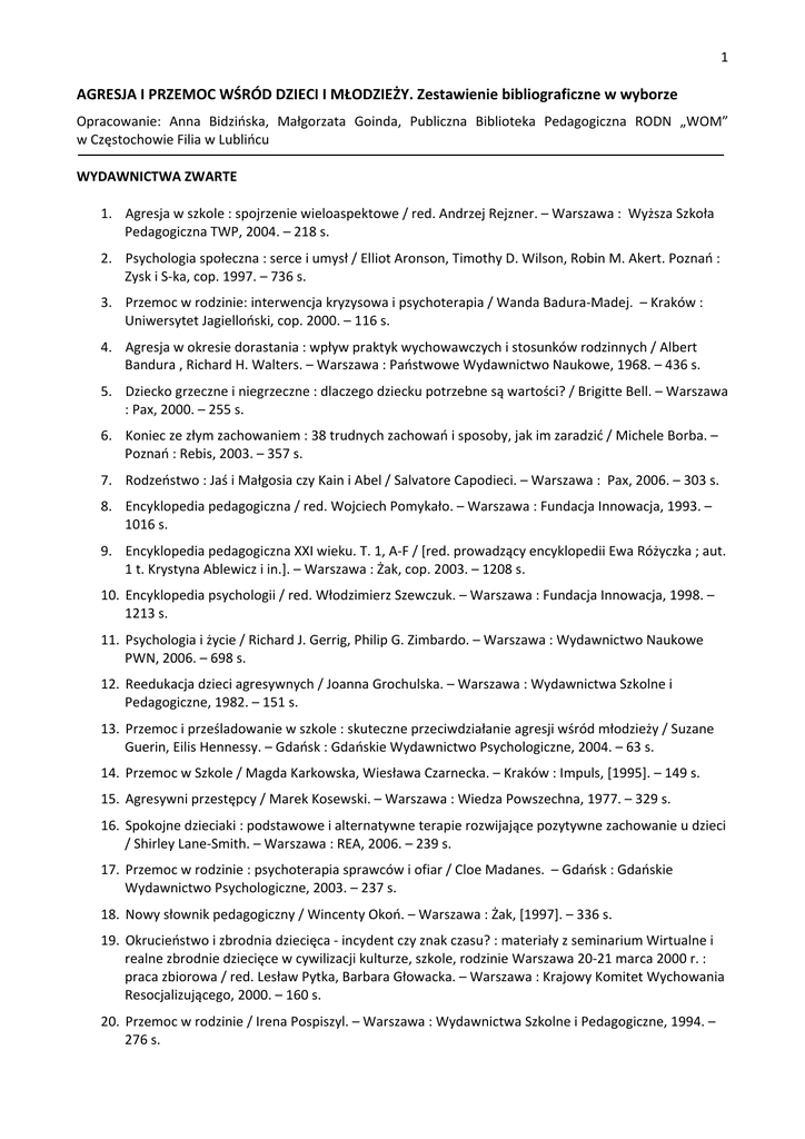 1 AGRESJA I PRZEMOC WŚRÓD DZIECI I MŁODZIEŻY. Zestawienie bibliograficzne w wyborze Opracowanie: Anna Bidzińska, Małgorzata Goinda, Publiczna Biblioteka Pedagogiczna RODN „WOM” w Częstochowie Filia w Lublińcu WYDAWNICTWA ZWARTE 1. Agresja w szkole : spojrzenie wieloaspektowe / red. Andrzej Rejzner. – Warszawa : Wyższa Szkoła Pedagogiczna TWP, 2004. – 218 s. 2. Psychologia społeczna : serce i umysł / Elliot Aronson, Timothy D. Wilson, Robin M. Akert. Poznań : Zysk i S-ka, cop. 1997. – 736 s. 3. Przemoc w rodzinie: interwencja kryzysowa i psychoterapia / Wanda Badura-Madej. – Kraków : Uniwersytet Jagielloński, cop. 2000. – 116 s. 4. Agresja w okresie dorastania : wpływ praktyk wychowawczych i stosunków rodzinnych / Albert Bandura , Richard H. Walters. – Warszawa : Państwowe Wydawnictwo Naukowe, 1968. – 436 s. 5. Dziecko grzeczne i niegrzeczne : dlaczego dziecku potrzebne są wartości? / Brigitte Bell. – Warszawa : Pax, 2000. – 255 s. 6. Koniec ze złym zachowaniem : 38 trudnych zachowań i sposoby, jak im zaradzić / Michele Borba. – Poznań : Rebis, 2003. – 357 s. 7. Rodzeństwo : Jaś i Małgosia czy Kain i Abel / Salvatore Capodieci. – Warszawa : Pax, 2006. – 303 s. 8. Encyklopedia pedagogiczna / red. Wojciech Pomykało. – Warszawa : Fundacja Innowacja, 1993. – 1016 s. 9. Encyklopedia pedagogiczna EEI wieku. T. 1, A-F / [red. prowadzący encyklopedii Ewa Różyczka ; aut. 1 t. Krystyna Ablewicz i in.]. – Warszawa : Żak, cop. 2003. – 1208 s. 10. Encyklopedia psychologii / red. Włodzimierz Szewczuk. – Warszawa : Fundacja Innowacja, 1998. – 1213 s. 11. Psychologia i życie / Richard J. Gerrig, Philip G. Zimbardo. – Warszawa : Wydawnictwo Naukowe PWN, 2006. – 698 s. 12. Reedukacja dzieci agresywnych / Joanna Grochulska. – Warszawa : Wydawnictwa Szkolne i Pedagogiczne, 1982. – 151 s. 13. Przemoc i prześladowanie w szkole : skuteczne przeciwdziałanie agresji wśród młodzieży / Suzane Guerin, Eilis Hennessy. – Gdańsk : Gdańskie Wydawnictwo Psychologiczne, 2004. – 63 s. 14. Przemoc w Szkole / Magda Karkowska, Wiesława Czarnecka. – Kraków : Impuls, [1995]. – 149 s. 15. Agresywni przestępcy / Marek Kosewski. – Warszawa : Wiedza Powszechna, 1977. – 329 s. 16. Spokojne dzieciaki : podstawowe i alternatywne terapie rozwijające pozytywne zachowanie u dzieci / Shirley Lane-Smith. – Warszawa : REA, 2006. – 239 s. 17. Przemoc w rodzinie : psychoterapia sprawców i ofiar / Cloe Madanes. – Gdańsk : Gdańskie Wydawnictwo Psychologiczne, 2003. – 237 s. 18. Nowy słownik pedagogiczny / Wincenty Okoń. – Warszawa : Żak, [1997]. – 336 s. 19. Okrucieństwo i zbrodnia dziecięca - incydent czy znak czasu? : materiały z seminarium Wirtualne i realne zbrodnie dziecięce w cywilizacji kulturze, szkole, rodzinie Warszawa 20-21 marca 2000 r. : praca zbiorowa / red. Lesław Pytka, Barbara Głowacka. – Warszawa : Krajowy Komitet Wychowania Resocjalizującego, 2000. – 160 s. 20. Przemoc w rodzinie / Irena Pospiszyl. – Warszawa : Wydawnictwa Szkolne i Pedagogiczne, 1994. – 276 s. 2 21. Razem przeciw przemocy / Irena Pospiszyl. – Warszawa : Żak, 1999. – 214 s. 22. Psychologia / red. Tadeusz Tomaszewski. – Warszawa : Państwowe Wydawnictwo Naukowe, 1978. – 891 s. 23. Lęk, gniew, agresja / JenL Ranschburg. – Warszawa : Wydawnictwa Szkolne i Pedagogiczne, 1993. – 158 s. 24. Agresja czy miłość : prezentacja poglądów Ericha Fromma / Larysa Siniugina. – Warszawa : Krajowa Agencja Wydawnicza, 1981. – 125 s. 25. Słownik psychologiczny / red. Włodzimierz Szewczuk. – Warszawa : Wiedza Powszechna, 1985. – 363 s. 26. Psychologia dziecka / Ross Vasta, Marshall M. Haith, Scott A. Miller. Warszawa : Wydawnictwa Szkolne i Pedagogiczne, 1995. – 725 s. 27. Agresywność młodzieży : problem indywidualny i społeczny / Jolanta Maria Wolińska. – Lublin : Uniwersytet Marii Curie-Skłodowskiej, 2000. – 162 s. WYDAWNICTWA CIĄGŁE 1. Agresja / Beata Rechnio // Wszystko dla Szkoły. – 2007, nr 6, s. 16 2. Agresja dzieci w perspektywie rozwojowej / Irena Obuchowska // Problemy OpiekuńczoWychowawcze. – 2000, nr 9, s. 3-11 3. Agresja i przemoc / Marek Dziewiecki // Wychowawca. – 2007, nr 2, s. 15 4. Agresja i przemoc dzieci i młodzieży : zestawienie bibliograficzne w wyborze / Kinga Hechsman // Nowa Szkoła. – 1999, nr 5, s. 57-58 5. Agresja i przemoc wśród dzieci i młodzieży : zestawienie bibliograficzne w wyborze / Beata Bukowska // Nowa Szkoła. - 1998, nr 10, s. 44-46 6. Agresja, konflikt, nierówności i normy w klasie szkolnej / Artur Pokropek // Dyrektor Szkoły. – 2007, nr 7, s. 36-39 7. Agresja nie popłaca / Dorota Strzódka, Małgorzata Chilińska // Nowe w Szkole. – 2003, nr 2,s. 15-17 8. Agresja seksualna w szkole / Marek Babik // Wychowawca. – 2007, nr 9, s. 12-14 9. Agresja w szkole / Beata Kubik // Życie Szkoły. – 2001, nr 4, s. 216-221 10. Agresja w szkole / Elżbieta Sołtys // Nowe w Szkole. – 2000/2001, nr 6, s. 18-19 11. Agresja w szkole / Magdalena Krawczonek // Dyrektor Szkoły. – 2006, nr 5, s. 52-53 12. Agresja w świetle koncepcji psychologicznych / Katarzyna Nadrowska // Życie Szkoły. – 2004, nr 2, s. 79-84 13. Alkoholizm i przemoc przenoszone z pokolenia na pokolenie / Jan Śledzianowski // Problemy Alkoholizmu. – 2000, nr 4, s. 19-21 14. Asertywność sposób na agresję : scenariusz zajęć / Bożena Kukiełka // Biblioteka w Szkole. – 2001, nr 10, s. 23 15. Bardziej agresywni czy zastraszeni? / Jadwiga Raczkowska // Problemy Opiekuńczo- Wychowawcze. – 2006, nr 2, s. 11-21 16. Błąd wychowawczy nauczyciela a agresja uczniów / Janina Janowska // Nowa Szkoła. – 2000, nr 3, s. 41-45 17. Czy można oswoić agresję? / Elżbieta Brylska, Jolanta Michalska // Dyrektor Szkoły. – 2003, nr 1, s. 25-26 3 18. Czy przemoc rodzi się w szkole? / Wiesław Sikorski // Nowa Szkoła. – 1998, nr 10, s. 14-18 19. Czy telewizja jest rekla