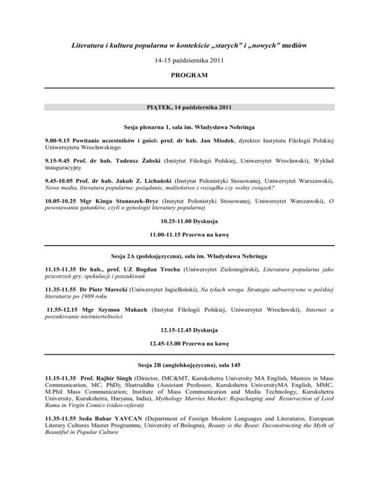 Literatura i kultura popularna w kontekście „starych” i „nowych” mediów 14-15 października 2011 PROGRAM PIĄTEK, 14 października 2011 Sesja plenarna 1, sala im. Władysława Nehringa 9.00-9.15 Powitanie uczestników i gości: prof. dr hab. Jan Miodek, dyrektor Instytutu Filologii Polskiej Uniwersytetu Wrocławskiego 9.15-9.45 Prof. dr hab. Tadeusz Żabski (Instytut Filologii Polskiej, Uniwersytet Wrocławski), Wykład inauguracyjny 9.45-10.05 Prof. dr hab. Jakub Z. Lichański (Instytut Polonistyki Stosowanej, Uniwersytet Warszawski), Nowe media, literatura popularna: pożądanie, małżeństwo z rozsądku czy wolny związek? 10.05-10.25 Mgr Kinga Stanaszek-Bryc (Instytut Polonistyki Stosowanej, Uniwersytet Warszawski), O powstawaniu gatunków, czyli o genologii literatury popularnej 10.25-11.00 Dyskusja 11.00-11.15 Przerwa na kawę Sesja 2A (polskojęzyczna), sala im. Władysława Nehringa 11.15-11.35 Dr hab., prof. UZ Bogdan Trocha (Uniwersytet Zielonogórski), Literatura popularna jako przestrzeń gry, spekulacji i poszukiwań 11.35-11.55 Dr Piotr Marecki (Uniwersytet Jagielloński), Na tyłach wroga. Strategie subwersywne w polskiej literaturze po 1989 roku 11.55-12.15 Mgr Szymon Makuch (Instytut Filologii Polskiej, Uniwersytet Wrocławski), Internet a poszukiwanie nieśmiertelności 12.15-12.45 Dyskusja 12.45-13.00 Przerwa na kawę Sesja 2B (angielskojęzyczna), sala 145 11.15-11.35 Prof. Rajbir Singh (Director, IMC&MT, Kurukshetra University MA English, Masters in Mass Communication, MC, PhD); Shatruddha (Assistant Professor, Kurukshetra UniversityMA English, MMC, M.Phil Mass Communication; Institute of Mass Communication and Media Technology, Kurukshetra University, Kurukshetra, Haryana, India), Mythology Marries Market: Repackaging and Resurrection of Lord Rama in Virgin Comics (video-referat) 11.35-11.55 Seda Bahar YAVCAN (Department of Foreign Modern Languages and Literatures, European Literary Cultures Master Programme, University of Bologna), Beauty is the Beast: Deconstructing the Myth of Beautiful in Popular Culture 11.55-12.15 Markku Soikkeli, PhD (Translation and Literary Studies, Finland School of Language, Tampere, Finland), Relationship between science fiction and national culture 12.15-12.45 Dyskusja 12.45-13.00 Przerwa na kawę Sesja 3A (polskojęzyczna), sala im. Władysława Nehringa 13.00-13.20 Dr Konrad Dominas (Uniwersytet im. Adama Mickiewicza), Cezar w nowych mediach – recepcja literatury antycznej czy analiza wybranych tematów kultury popularnej? 13.20-13.40 Mgr Damian Kaja (Uniwersytet Mikołaja Kopernika), Dziedzictwo lirnika. Orfeusz i nowe media 13.40-14.00 Dr Marcin Chruściel (V LO im. Augusta Witkowskiego w Krakowie), Związki „młodej” literatury współczesnej z kulturą popularną – symbioza, pasożytnictwo czy infekcja wirusowa? Opis zjawiska na przykładzie książek Doroty Masłowskiej, Jakuba Żulczyka i Jacka Dukaja 14.00-14.30 Dyskusja 14.30-16.00 Przerwa obiadowa Sesja 3B (angielskojęzyczna), sala 145 13.00-13.20 Mgr Markéta Holanová (Faculty of Arts, Charles University in Prague), Popular literature and film in the reception of Czech cultural journals and anthologies in the 20s the 20th century 13.20-13.40 Dr Elżbieta Klimek-Dominiak, (Instytut Filologii Angielskiej, Uniwersytet Wrocławski), Impact of “Mis Lit”: Cultural Work of American Incest Narratives 13.40-14.00 Dr Justyna Deszcz-Tryhubczak (Instytut Filologii Angielskiej, Uniwersytet Wrocławski), At Home in the Zone of Muu: Pop Cosmopolitanism in Salman Rushdie’s „Luka and the Fire of Life” 14.00-14.30 Dyskusja 14.30-16. 00 Przerwa obiadowa Sesja plenarna 4, sala im. Władysława Nehringa 16.00-16.20 Mgr Michał Mesjasz (Instytut Filologii Polskiej, Uniwersytet Wrocławski), Od baśni do pornografii. Anonimowe opracowanie wybranych wątków baśni braci Grimm z początku XX wieku a psychoanalityczne teorie Brunona Bettelheima 16.20-16.40 Dr Ksenia Olkusz (PWSZ, Racibórz), Tajemniczy malarz Hieronim Bosch i jego szalona wyobraźnia. Kilka uwag o postrzeganiu artysty i dzieła sztuki we współczesnej literaturze popularnej 16.40-17.00 Dr hab. Anna Gemra (Instytut Filologii Polskiej, Uniwersytet Wrocławski), Nowe/stare, stare/nowe: człowiek a system w trylogii Stiega Larssona „Millenium” 17.00-17.30 Dyskusja 17.30-17.45 Przerwa na kawę Sesja plenarna 5, sala im. Władysława Nehringa 17.45-18.05 Dr hab., prof. UWr Jacek Rzeszotnik (Instytut Filologii Germańskiej, Uniwersytet Wrocławski), Doctor Who i Torchwood, czyli o strategiach komunikacyjnych we współczesnych telewizyjnych serialach fantastycznych 18.05-18.25 Mgr Emilia Maria Prucia (Uniwersytet Warszawski), Zbrodnia, romans, sacrum, czyli niektóre motywy literatury popularnej w reklamie telewizyjnej. Od analizy tematu po filozoficzną refleksję nad kulturą 18.25-18.45 Dr Halina Kubicka (Instytut Filologii Polskiej, Uniwersytet Wrocławski), Szukając Baker Street 221B. Podróże śladami książek i filmów 18.45-19.05 Dyskusja 19.05-19.35 Jakub Tabisz (Stowarzyszenie “Wielosfer”), To jest gra! Bądź poważny 20.00 “Po drugiej stronie lustra” – jeepform organizowany przez Stowarzyszenie “Wielosfer” (kawiarnia “Wydawnictwo”, ul. Włodkowica 11) SOBOTA, 15 października 2011 Sesja plenarna 1, sala im. Władysława Nehringa 9.30-9.50 Dr Tomasz Ratajczak (Uniwersytet Zielonogórski), Mieszkanie w stylu hi-tech czyli o pewnej próbie odwzorowania obrazu cyberprzestrzeni 9.50-10.10 Mgr Lidia Gąsowska (Instytut Filologii Polskiej, Uniwersytet Warmińsko-Mazurski), Popularność Gothic Lolita wobec aktualnych trendów i mód 10.10-10.30 Dr Marta Cuber (Uniwersytet Śląski), Lot koszący? O przygodach popularnej literatury homoerotycznej w Polsce 10.30-11.00 Dyskusja 11.00-11.15 Przerwa na kawę Sesja plenarna 2, sala im. Władysława Nehringa 11.15-11.35 Mgr Kamila Tuszyńska (Instytut Polonistyki Stosowanej, Uniwersytet Warszawski), Szekspir, postapokalipsa i ekologia 