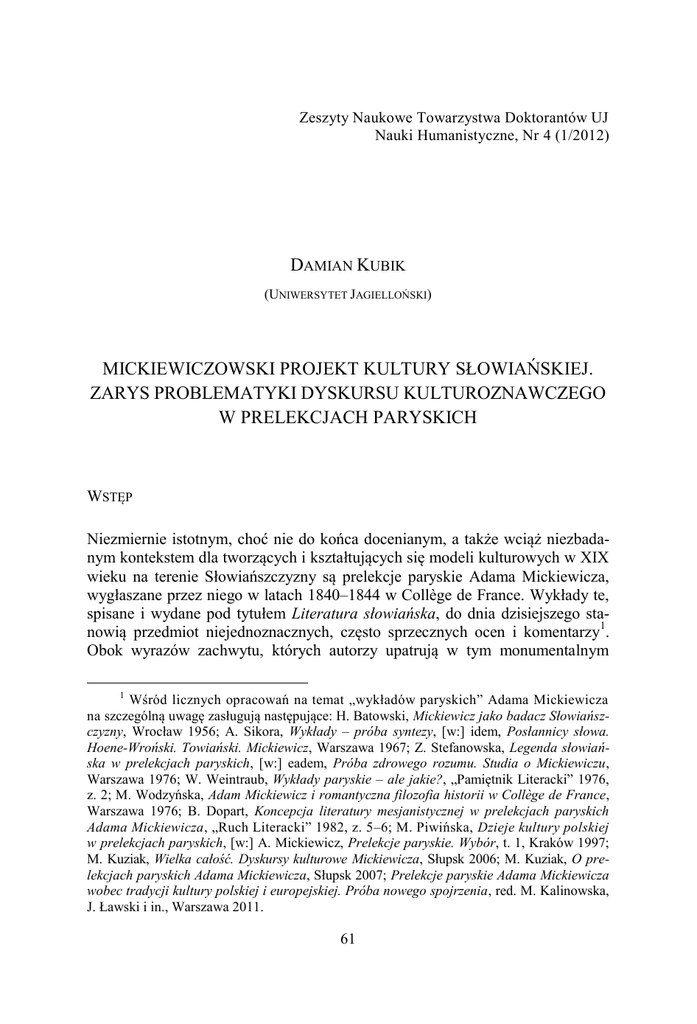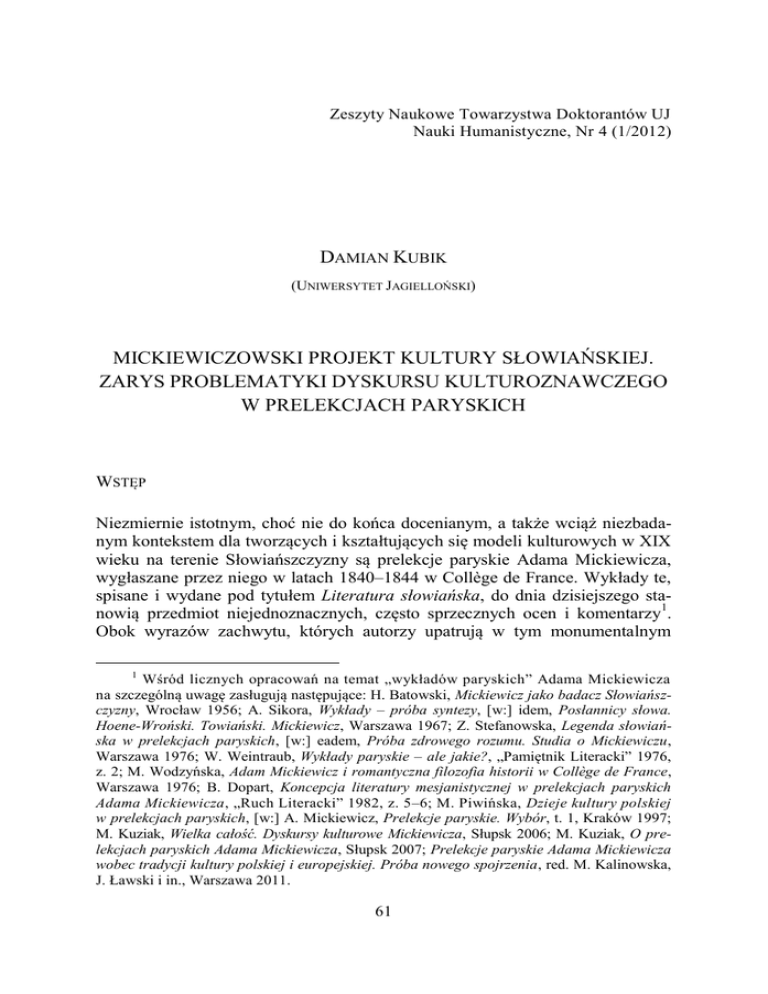 Zeszyty Naukowe Towarzystwa Doktorantów UJ Nauki Humanistyczne, Nr 4 (1/2012) DAMIAN KUBIK (UNIWERSYTET JAGIELLOŃSKI) MICKIEWICZOWSKI PROJEKT KULTURY SŁOWIAŃSKIEJ. ZARYS PROBLEMATYKI DYSKURSU KULTUROZNAWCZEGO W PRELEKCJACH PARYSKICH WSTĘP Niezmiernie istotnym, choć nie do końca docenianym, a także wciąż niezbadanym kontekstem dla tworzących i kształtujących się modeli kulturowych w XIX wieku na terenie Słowiańszczyzny są prelekcje paryskie Adama Mickiewicza, wygłaszane przez niego w latach 1840–1844 w Collège de France. Wykłady te, spisane i wydane pod tytułem Literatura słowiańska, do dnia dzisiejszego stanowią przedmiot niejednoznacznych, często sprzecznych ocen i komentarzy1. Obok wyrazów zachwytu, których autorzy upatrują w tym monumentalnym 1 Wśród licznych opracowań na temat „wykładów paryskich” Adama Mickiewicza na szczególną uwagę zasługują następujące: H. Batowski, Mickiewicz jako badacz Słowiańszczyzny, Wrocław 1956; A. Sikora, Wykłady – próba syntezy, [w:] idem, Posłannicy słowa. Hoene-Wroński. Towiański. Mickiewicz, Warszawa 1967; Z. Stefanowska, Legenda słowiańska w prelekcjach paryskich, [w:] eadem, Próba zdrowego rozumu. Studia o Mickiewiczu, Warszawa 1976; W. Weintraub, Wykłady paryskie – ale jakie?, „Pamiętnik Literacki” 1976, z. 2; M. Wodzyńska, Adam Mickiewicz i romantyczna filozofia historii w Collège de France, Warszawa 1976; B. Dopart, Koncepcja literatury mesjanistycznej w prelekcjach paryskich Adama Mickiewicza, „Ruch Literacki” 1982, z. 5–6; M. Piwińska, Dzieje kultury polskiej w prelekcjach paryskich, [w:] A. Mickiewicz, Prelekcje paryskie. Wybór, t. 1, Kraków 1997; M. Kuziak, Wielka całość. Dyskursy kulturowe Mickiewicza, Słupsk 2006; M. Kuziak, O prelekcjach paryskich Adama Mickiewicza, Słupsk 2007; Prelekcje paryskie Adama Mickiewicza wobec tradycji kultury polskiej i europejskiej. Próba nowego spojrzenia, red. M. Kalinowska, J. Ławski i in., Warszawa 2011. 61 Damian Kubik __________________________________________________________________________________________________________________________________________________________________________________________________________________________________ dziele „wielkiego bilansu romantyzmu, niemającego odpowiednika w piśmiennictwie europejskim”2, pojawiają się także opinie umniejszające jego rolę i wartość, klasyfikujące je jedynie jako zapis stanu wiedzy na temat historii i kultury narodów słowiańskich. Należy jednak podkreślić, że obie te przeciwstawne linie interpretacji wykładów Mickiewicza wynikają z ogromnych niedostatków w badaniach nad tym obszarem twórczości polskiego wieszcza, co objawia się choćby tym, że do dziś Literatura słowiańska nie ukazała się w krytycznym wydaniu w języku francuskim, w którym była wygłaszana. Liczne, aczkolwiek koncentrujące się na niewielkiej ilości problemów, przy tym często nazbyt ogólne analizy prelekcji bądź to śledziły omyłki, niedopatrzenia, przekłamania, jakich niewątpliwie dopuścił się Mickiewicz podczas swoich wystąpień, bądź to wskazywały na szeroko zakrojoną przez niego, niezwykle ambitną, pionierską próbę syntezy dorobku Słowian. Co więcej, wśród tych omówień, komentarzy i monografii zaznacza się dość widoczny brak opracowań dotyczących możliwych wpływów idei Mickiewicza na proces tworzenia się modelu kulturowego zwłaszcza na południu Słowiańszczyzny. Kwestię tę sygnalizuje Joanna Rapacka w jednym z rozdziałów swej książki Godzina Herdera3, co oczywiście jest zaledwie próbą zarysowania tego złożonego i trudnego zagadnienia. Również pozostałe dostępne opracowania nie podejmują wnikliwszej analizy tego problemu, ograniczając się do wskazania na historię recepcji Mickiewiczowskich wykładów w Chorwacji i Serbii bądź – co najwyżej – na omówienie wpływu Mickiewicza ideologa na toczące się tam ważne przemiany polityczne. Biorąc pod uwagę fakt, że prelekcje paryskie nie doczekały się zadowalającego opracowania, obejmującego całość prezentowanej problematyki4, założeniem tego artykułu staje się zatem próba wskazania na najważniejsze założenia Mickiewiczowskiego projektu kultury słowiańskiej, wraz z prześledzeniem stosowanych przez niego strategii i sposobów przedstawiania Słowiańszczyzny. Wypada zacząć od oczywistości: Mickiewicz w swych wykładach w sposób wybiórczy i nierównomierny zajmuje się poszczególnymi literaturami i kulturami słowiańskimi. Najwięcej uwagi, rzecz jasna, poświęca literaturze polskiej i rosyjskiej. Warto też od razu zaznaczyć, że jego wizja Słowiańszczyzny była dychotomiczna, oparta na duchu wolności, którego reprezentowała Polska, i na duchu despotyzmu, którego ucieleśnieniem była Rosja. Na tym tle południowa 2 B. Dopart, Adam Mickiewicz, [w:] Historia literatury polskiej w dziesięciu tomach, t. 5, cz. 2: Romantyzm, s. 328–329. 3 J. Rapacka, Godzina Herdera: o Serbach, Chorwatach i idei jugosłowiańskiej, Warszawa 1995, s. 95–112. 4 Aktualny zatem pozostaje apel Henryka Batowskiego, który domagał się opracowania poszczególnych problemów prelekcji paryskich. Wśród ważnych przedsięwzięć, które starają się odpowiedzieć na to wezwanie, należy wymienić realizowany przez Instytut Badań Interdyscyplinarnych „Artes Liberales” Uniwersytetu Warszawskiego projekt pod kierunkiem prof. Marii Kalinowskiej i tu między innymi wydaną niedawno książkę, będącą istotnym wkładem w poznanie wykładów Mickiewicza: Prelekcje paryskie Adama Mickiewicza, op. cit. 62 Mickiewiczowski projekt kultury słowiańskiej... __________________________________________________________________________________________________________________________________________________________________________________________________________________________________ Słowiańszczyzna (zredukowana przez Mickiewicza do Serbi