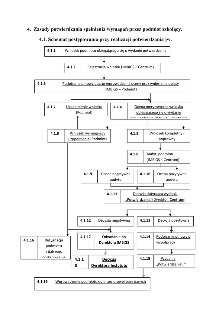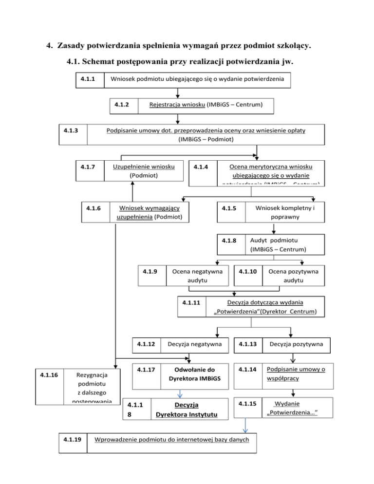 4. Zasady potwierdzania spełnienia wymagań przez podmiot szkolący. 4.1. Schemat postępowania przy realizacji potwierdzania jw. 4.1.1 Wniosek podmiotu ubiegającego się o wydanie potwierdzenia 4.1.2 Rejestracja wniosku (IMBiGS – Centrum) Podpisanie umowy dot. przeprowadzenia oceny oraz wniesienie opłaty (IMBiGS – Podmiot) 4.1.3 4.1.7 4.1.6 Uzupełnienie wniosku (Podmiot) Ocena merytoryczna wniosku ubiegającego się o wydanie potwierdzenia (IMBiGS – Centrum) 4.1.4 Wniosek wymagający uzupełnienia (Podmiot) Wniosek kompletny i poprawny merytorycznie 4.1.5 Audyt podmiotu (IMBiGS – Centrum) 4.1.8 4.1.9 Ocena negatywna audytu 4.1.11 4.1.16 Rezygnacja podmiotu z dalszego postępowania 4.1.19 4.1.10 Ocena pozytywna audytu Decyzja dotycząca wydania „Potwierdzenia”(Dyrektor Centrum) 4.1.12 Decyzja negatywna 4.1.13 Decyzja pozytywna 4.1.17 Odwołanie do Dyrektora IMBiGS 4.1.14 Podpisanie umowy o współpracy (IMBiGS – Podmiot) 4.1.1 8 Decyzja Dyrektora Instytutu 4.1.15 Wprowadzenie podmiotu do internetowej bazy danych (IMBiGS – Centrum) Wydanie „Potwierdzenia…” Wyjaśnienia do schematu potwierdzania spełnienia wymagań 4.1.1. Wniosek podmiotu ubiegającego się o wydanie Potwierdzenia W cele uzyskania „Potwierdzenia…” Instytutu, umożliwiającego świadczenie usług szkoleniowych, podmiot składa wniosek dokumentujący faktyczne i formalne spełnianie przesłanek, o których mowa w §25 rozporządzenia Ministra Gospodarki z dnia 20 września 2001r. (Dz. U. Nr 118, poz. 1263)- wzór wniosku stanowi załącznik nr 1. Wniosek winien zawierać określenie zakresu przedmiotowego przewidywanych szkoleń oraz komplet dokumentów i informacji potwierdzających posiadanie: 1.) odpowiednio przygotowanej kadry wykładowców i instruktorów, 2.) warunków lokalowych umożliwiających właściwe prowadzenie wykładów i ćwiczeń, 3.) wyposażenia dydaktycznego, 4.) odpowiedniego zaplecza socjalnego, 5.) parku maszynowego wraz z placem manewrowym. Dla zapewnienia wymaganego poziomu szkolenia: ad.1 - wykładowcy zajęć teoretycznych winni legitymować się wyższym wykształceniem technicznym, doświadczeniem zawodowym przy eksploatacji maszyn określonych specjalności, przygotowaniem do realizacji zadań dydaktycznych, - instruktorzy do realizacji zajęć praktycznych winni posiadać wykształcenie średnie oraz przygotowanie pedagogiczne dla instruktorów praktycznej nauki zawodu jak również uprawnienia operatora najwyższej klasy przewidzianej dla danego rodzaju maszyn i/lub montażysty rusztowań budowlano-montażowych metalowych. Wykaz imienny ocenianej kadry nauczającej (wykładowców i instruktorów), zawarty jest we wniosku zgłoszeniowym podmiotu ubiegającego się o uzyskanie „Potwierdzenia...”. Kwalifikacje wykładowców i instruktorów należy potwierdzić kopiami dokumentów, potwierdzonymi za zgodność z oryginałem. ad.2 i 3 – sale do realizacji zajęć dydaktycznych winny być wyposażone w pomoce dydaktyczne do określonych specjalności oraz wyposażenie techniczne do prezentacji multimedialnych, ponadto powinny posiadać pomoce dydaktycznych dla każdej specjalności i przedmiotu, np.: zespoły maszyn, ich przekroje, modele, plansze, przezrocza, filmy, prezentacje multimedialne, literaturę techniczną, w tym instrukcje obsługi i użytkowania (DTR) maszyn i inne, - cenną pomoc dydaktyczną, może stanowić trenażer, który umożliwiałby symulację pracy maszyną, jak również symulację reakcji maszyny w konkretnych sytuacjach zagrożenia, ad. 4 - zarówno sale wykładowe jak i place manewrowe winny posiadać stosowne zaplecze socjalne i sanitarne, ad. 5 - maszyn do zajęć praktycznych winny odpowiadać charakterystyce prowadzonych szkoleń i zabezpieczać przestrzeganie zasad bhp podczas realizacji zajęć dydaktycznych. W przypadku specjalności „montażysta rusztowań budowlano-montażowych metalowych”- zestawów co najmniej dwóch różnych rodzajów rusztowań spośród rusztowań: rurowo-złączkowych, ramowych, modułowych oraz ściany do montażu rusztowań z możliwością wykonywania kotwień, o wymiarach nie mniejszych niż: długość 10m, wysokość 8m. Prawo do dysponowania lokalami, placem manewrowym, maszynami i innymi urządzeniami technicznymi, należy udokumentować aktami lub umowami cywilnoprawnymi (np.: aktem własności, umową: najmu, dzierżawy, lub deklaracją). Procedura „Potwierdzania” jest wykonywana jednorazowo dla miejsca szkolenia. Rozszerzenie zakresu szkolenia wymaga uzyskania kolejnego „Potwierdzania”. W celu uzyskania „Potwierdzenia” rozszerzającego posiadany zakres szkolenia należy złożyć wniosek uzupełniający. Omówione wyżej zasady obowiązują również w przypadku ubiegania się o „Potwierdzenie” dla bazy zamiejscowej. Każdorazowa zmiana danych zawartych we wniosku o uzyskanie „Potwierdzenia” wymaga bezzwłocznego zawiadomienia Centrum. W przypadku podzlecenia realizacji części szkolenia innemu podmiotowi, wówczas podmiot ten podlega pełnej procedurze „potwierdzania” dla zakresu określonego zleceniem. Podmiot zlecający odpowiada za cały zakres szkolenia. 4.1.2. Rejestracja wniosku Każdy wniosek, jak również jego uzupełnienia i inne pisma, w tym wniosek dotyczący bazy zamiejscowej, jest rejestrowany w Centrum. Zgodnie z instrukcją o organizacji i zakresie działania archiwum zakładowego, wnioskowi nadawany jest numer identyfikacyjny. 4.1.3. Podpisanie umowy dot. przeprowadzenia oceny oraz wniesienie opłaty Podmiot otrzymuje za pośrednictwem poczty umowę dotyczącą finansowania kosztów oceny. Koszt umowny ustalony jest zgodnie z cennikiem jak w pkt. 3.2. Przesłanie podpisanej umowy, następnie dokonanie na podstawie wystawionej przez Instytut faktury wpłaty kwoty określonej w umowie, będzie warunkiem kontynuowania procedury. Podmiot może przysłać podpisaną umowę wraz z wnioskiem, korzystając z zamieszczonego na stronie internetowej Ins