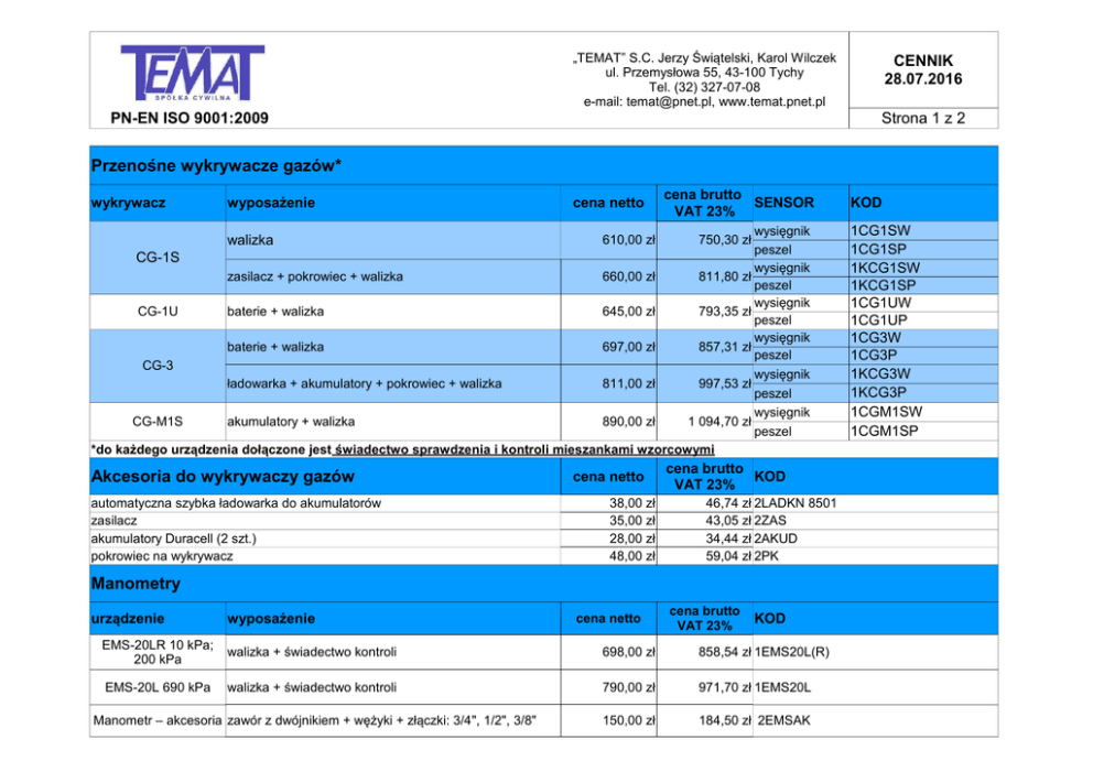 „TEMAT” S.C. Jerzy Świątelski, Karol Wilczek ul. Przemysłowa 55, 43-100 Tychy Tel. (32) 327-07-08 e-mail: [email protected], www.temat.pnet.pl CENNIK 28.07.2016 Strona 1 z 2 PN-EN ISO 9001:2009 Przenośne wykrywacze gazów* wykrywacz wyposażenie cena netto cena brutto SENSOR VAT 23% wysięgnik peszel CG-1S wysięgnik zasilacz + pokrowiec + walizka 660,00 zł 811,80 zł peszel wysięgnik CG-1U baterie + walizka 645,00 zł 793,35 zł peszel wysięgnik baterie + walizka 697,00 zł 857,31 zł peszel CG-3 wysięgnik ładowarka + akumulatory + pokrowiec + walizka 811,00 zł 997,53 zł peszel wysięgnik CG-M1S akumulatory + walizka 890,00 zł 1 094,70 zł peszel *do każdego urządzenia dołączone jest świadectwo sprawdzenia i kontroli mieszankami wzorcowymi walizka Akcesoria do wykrywaczy gazów automatyczna szybka ładowarka do akumulatorów zasilacz akumulatory Duracell (2 szt.) pokrowiec na wykrywacz 610,00 zł cena netto 38,00 zł 35,00 zł 28,00 zł 48,00 zł 750,30 zł cena brutto KOD VAT 23% 46,74 zł 2LADKN 8501 43,05 zł 2ZAS 34,44 zł 2AKUD 59,04 zł 2PK Manometry urządzenie wyposażenie cena netto cena brutto VAT 23% KOD EMS-20LR 10 kPa; 200 kPa walizka + świadectwo kontroli 698,00 zł 858,54 zł 1EMS20L(R) EMS-20L 690 kPa walizka + świadectwo kontroli 790,00 zł 971,70 zł 1EMS20L Manometr – akcesoria zawór z dwójnikiem + wężyki + złączki: 3/4", 1/2", 3/8" 150,00 zł 184,50 zł 2EMSAK KOD 1CG1SW 1CG1SP 1KCG1SW 1KCG1SP 1CG1UW 1CG1UP 1CG3W 1CG3P 1KCG3W 1KCG3P 1CGM1SW 1CGM1SP „TEMAT” S.C. Jerzy Świątelski, Karol Wilczek ul. Przemysłowa 55, 43-100 Tychy Tel. (32) 327-07-08 e-mail: [email protected], www.temat.pnet.pl Strona 2 z 2 PN-EN ISO 9001:2009 Mierniki gazów ** urządzenie pomiar GasAlert Extreme GasAlert MicroClip XL GasAlert MicroClip XL GasAlert MicroClip XL GasAlert MicroClip XL Testo 315-3 Testo 315-3(B) CO (O2/H2S) CO/O2/H2S/LEL – jednogazowy – dowolny sensor CO/O2/H2S/LEL – dwugazowy – dowlona konfiguracja CO/O2/H2S/LEL – trzygazowy – dowolna konfiguracja CO/O2/H2S/LEL – czterogazowy jednoczesny pomiar CO i CO2 (bez Bluetooth) jednoczesny pomiar CO i CO2 (z Bluetooth) cena netto 1 019,10 zł 1 625,40 zł 1 771,60 zł 2 085,50 zł 2 408,00 zł 3 440,00 zł 3 787,00 zł cena brutto KOD VAT 23% 1 253,49 zł 3GASEXTREME 1 999,24 zł 3GASMICRO1 2 179,07 zł 3GASMICRO2 2 565,17 zł 3GASMICRO3 2 961,84 zł 3GASMICRO4 4 231,20 zł 3TESTO 315-3 4 658,01 zł 3TESTO 315-3(B) Mierniki środowiska ** urządzenie pomiar AZ 8703 AZ 8901 AZ 8903 AZ 9871 Testo 835 T1 Testo 835 T2 Testo 835 H1 termohigrometr anemometr anemometr przepływ ,temp.,wilgotn., drukarka, oprogr.jęz.pol. pomiar temperatury (pirometr) pomiar wysokich temperatur do 1500º C (pirometr) pomiar temperatury i wilgotności (pirometr) cena netto 380,00 zł 700,00 zł 620,00 zł 990,00 zł 812,00 zł 1 628,00 zł 1 221,00 zł cena brutto KOD VAT 23% 467,40 zł 3AZ 8703 861,00 zł 3AZ 8901 762,60 zł 3AZ 8903 1 217,70 zł 3AZ 9871 998,76 zł 3TESTO 835 T1 2 002,44 zł 3TESTO 835 T2 1 501,83 zł 3TESTO 835 H1 Analizatory spalin ** urządzenie pomiar Testo 320 Basic Testo 330-1LL Testo 330-1LL z NO analiza spalin analiza spalin analiza spalin ** Ceny zależne od kursu walut CENNIK 28.07.2016 cena netto 2 900,00 zł 5 550,00 zł 7 400,00 zł cena brutto KOD VAT 23% 3 567,00 zł 3TESTO 320 BASIC 6 826,50 zł 3TESTO 330-1LL 9 102,00 zł 3TESTO 330-1LL NO