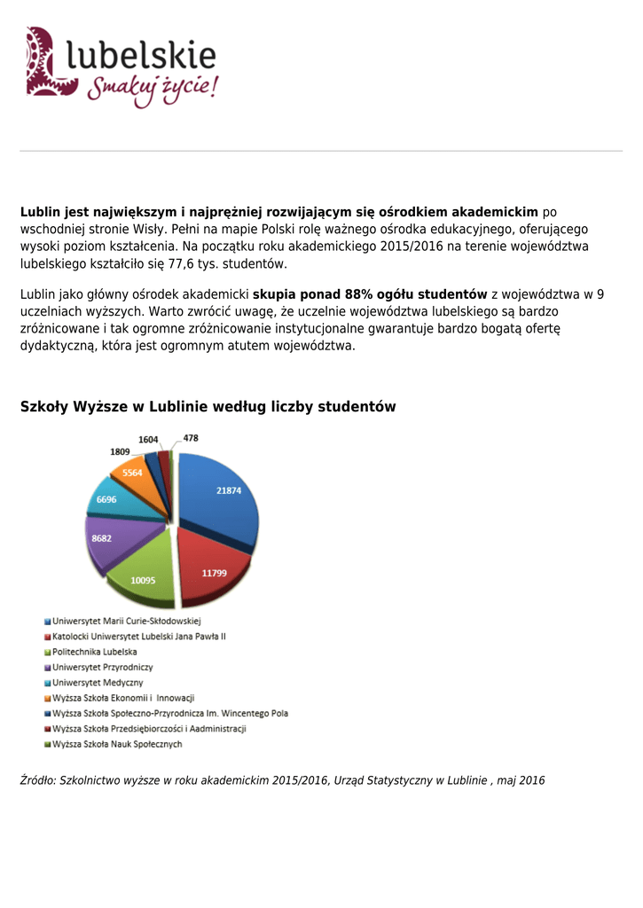 Lublin jest największym i najprężniej rozwijającym się ośrodkiem akademickim po wschodniej stronie Wisły. Pełni na mapie Polski rolę ważnego ośrodka edukacyjnego, oferującego wysoki poziom kształcenia. Na początku roku akademickiego 2015/2016 na terenie województwa lubelskiego kształciło się 77,6 tys. studentów. Lublin jako główny ośrodek akademicki skupia ponad 88% ogółu studentów z województwa w 9 uczelniach wyższych. Warto zwrócić uwagę, że uczelnie województwa lubelskiego są bardzo zróżnicowane i tak ogromne zróżnicowanie instytucjonalne gwarantuje bardzo bogatą ofertę dydaktyczną, która jest ogromnym atutem województwa. Szkoły Wyższe w Lublinie według liczby studentów Źródło: Szkolnictwo wyższe w roku akademickim 2015/2016, Urząd Statystyczny w Lublinie , maj 2016 Absolwenci według ukończonych grup kierunków studiów Źródło: Szkolnictwo wyższe w roku akademickim 2015/2016, Urząd Statystyczny w Lublinie , maj 2016 Studenci i absolwenci szkół wyższych: wyszczególnienie studenci absolwenci 2015/2016 77 562 22 521 pierwszego stopnia (zawodowe) 47 004 11 878 z tytułem inżyniera 18 119 3 693 z tytułem licencjata 28 885 8 185 magisterskie jednolite 12 798 2 141 drugiego stopnia-magisterskie uzupełniające 16 391 8 502 Źródło: Szkolnictwo wyższe w roku akademickim 2015/2016, Urząd Statystyczny w Lublinie , maj 2016 Zagraniczni studenci wybierają Lublin... Z roku na rok rośnie również udział studentów zagranicznych wśród ogółu studentów – obecnie region z wartością 8,4% w latach 2015/2016 jest w czołówce województw Polski. Na początku roku akademickiego 2015/16 w 17 uczelniach województwa lubelskiego kształciło się prawie 6,6 tys. cudzoziemców. Najwięcej cudzoziemców przybyło na studia z Ukrainy, Tajwanu następnie Białorusi, ze Stanów Zjednoczonych Ameryki oraz z Norwegii i Arabii Saudyjskiej. Największym zainteresowaniem wśród studiujących cudzoziemców cieszyły się kierunki z grupy „zdrowie i opieka społeczna” następnie „nauki społeczne, dziennikarstwo i informacja” oraz „biznes, administracja i prawo”. Studenci cudzoziemcy Źródło: Szkolnictwo wyższe w roku akademickim 2015/2016, Urząd Statystyczny w Lublinie , maj 2016 Doktoranci w województwie lubelskim Lubelszczyzna zajmuje czwarte miejsce w Polsce pod względem kształcenia się doktorantów (14,4 doktorantów na 10 tys. ludności). Najwięcej doktorantów kształci się na Katolickim Uniwersytecie Lubelskim Jana Pawła II następnie na Uniwersytecie Marii Curie-Skłodowskiej oraz na Uniwersytecie Medycznym. Wśród 16 dziedzin nauki, na których odbywają się studia doktoranckie największym zainteresowaniem cieszą się nauki humanistyczne, społeczne oraz teologiczne. Drukuj [1] Pobierz PDF [2] Pobierz DOC [3] Źródło: http://www.invest.lubelskie.pl/pl/studenci Odnośniki [1] http://www.invest.lubelskie.pl/pl/print/1024 [2] http://www.invest.lubelskie.pl/pl/printpdf/1024 [3] http://www.invest.lubelskie.pl/pl/print/1024?type=doc