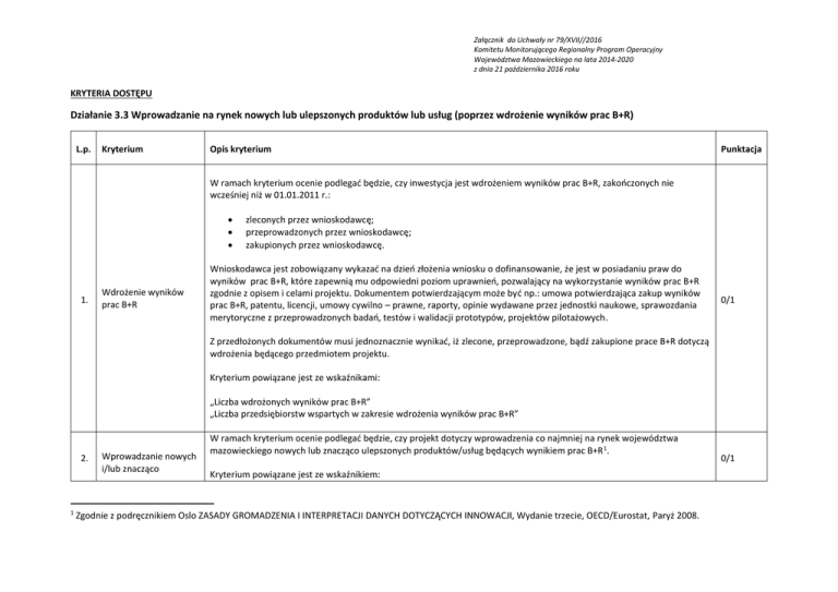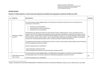 Załącznik do Uchwały nr 79/XVII//2016 Komitetu Monitorującego Regionalny Program Operacyjny Województwa Mazowieckiego na lata 2014-2020 z dnia 21 października 2016 roku KRYTERIA DOSTĘPU Działanie 3.3 Wprowadzanie na rynek nowych lub ulepszonych produktów lub usług (poprzez wdrożenie wyników prac B+R) L.p. Kryterium Opis kryterium Punktacja W ramach kryterium ocenie podlegać będzie, czy inwestycja jest wdrożeniem wyników prac B+R, zakończonych nie wcześniej niż w 01.01.2011 r.: 1. Wdrożenie wyników prac B+R zleconych przez wnioskodawcę; przeprowadzonych przez wnioskodawcę; zakupionych przez wnioskodawcę. Wnioskodawca jest zobowiązany wykazać na dzień złożenia wniosku o dofinansowanie, że jest w posiadaniu praw do wyników prac B+R, które zapewnią mu odpowiedni poziom uprawnień, pozwalający na wykorzystanie wyników prac B+R zgodnie z opisem i celami projektu. Dokumentem potwierdzającym może być np.: umowa potwierdzająca zakup wyników prac B+R, patentu, licencji, umowy cywilno – prawne, raporty, opinie wydawane przez jednostki naukowe, sprawozdania merytoryczne z przeprowadzonych badań, testów i walidacji prototypów, projektów pilotażowych. 0/1 Z przedłożonych dokumentów musi jednoznacznie wynikać, iż zlecone, przeprowadzone, bądź zakupione prace B+R dotyczą wdrożenia będącego przedmiotem projektu. Kryterium powiązane jest ze wskaźnikami: „Liczba wdrożonych wyników prac B+R” „Liczba przedsiębiorstw wspartych w zakresie wdrożenia wyników prac B+R” 2. 1 Wprowadzanie nowych i/lub znacząco W ramach kryterium ocenie podlegać będzie, czy projekt dotyczy wprowadzenia co najmniej na rynek województwa mazowieckiego nowych lub znacząco ulepszonych produktów/usług będących wynikiem prac B+R 1. Kryterium powiązane jest ze wskaźnikiem: Zgodnie z podręcznikiem Oslo ZASADY GROMADZENIA I INTERPRETACJI DANYCH DOTYCZĄCYCH INNOWACJI, Wydanie trzecie, OECD/Eurostat, Paryż 2008. 0/1 udoskonalonych produktów/usług „Liczba przedsiębiorstw objętych wsparciem w celu wprowadzenia produktów nowych dla rynku (CI 28)” Nowy produkt lub usługa powstaje w wyniku zastosowanej innowacji produktowej i/lub procesowej. Produkt jest nowy na rynku, jeżeli nie ma innych dostępnych na rynku produktów oferujących taką samą funkcjonalność lub technologia, którą wykorzystuje nowy produkt zasadniczo różni się od technologii już istniejących produktów. 3. Analiza potrzeb W ramach kryterium oceniane będzie, czy analiza rynku przeprowadzona przez wnioskodawcę potwierdza zapotrzebowanie na produkty, usługi lub rozwiązania dotyczące procesu produkcji opracowane lub znacząco udoskonalone w wyniku realizacji projektu, oraz czy projekt stanowi odpowiedź na zidentyfikowane potrzeby wnioskodawcy. 0/1 2 KRYTERIA MERYTORYCZNE – SZCZEGÓŁOWE Działanie 3.3 Wprowadzanie na rynek nowych lub ulepszonych produktów lub usług (poprzez wdrożenie wyników prac B+R) L.p. Kryterium Opis kryterium Punktacja Maksymalna liczba punktów Kryterium promuje projekty, w których wnioskodawca wprowadza co najmniej na rynek województwa mazowieckiego dwa nowe lub znacząco udoskonalone produkty i/lub usługi przy zastosowaniu oprócz innowacji produktowej równocześnie innowacji procesowej. 1. Wprowadzanie nowych i/lub znacząco udoskonalonych produktów/usług Nowy produkt lub usługa powstaje w wyniku zastosowanej innowacji produktowej i/lub procesowej. Produkt jest nowy na rynku, jeżeli nie ma innych dostępnych na rynku produktów oferujących taką samą funkcjonalność lub technologia, którą wykorzystuje nowy produkt zasadniczo różni się od technologii już istniejących produktów. Projekt zakłada wprowadzenie na rynek nowe i/lub znacząco udoskonalone produkty/usługi przy zastosowaniu oprócz innowacji produktowej równocześnie innowacji procesowej2 – 5 pkt. 5 Brak spełnienia wyżej wymienionych warunków lub brak informacji w tym zakresie – 0 pkt. Kryterium powiązane jest ze wskaźnikami: „Liczba wprowadzonych innowacji produktowych [szt.]” „Liczba wprowadzonych innowacji procesowych [szt.]” 2. 2 Wykorzystanie wyników prac badawczych z 1.2 RPO WM 2014-2020 Zgodnie z RPO WM 2014-2020, kryterium promuje projekty stanowiące kontynuację prac B+R finansowanych z Działania 1.2 Regionalnego Programu Operacyjnego Województwa Mazowieckiego 2014-2020. Projekt stanowi wdrożenie wyników prac B+R finansowanych z Działania 1.2 RPO WM 20142020 – 1 pkt. 1 Zgodnie z podręcznikiem Oslo ZASADY GROMADZENIA I INTERPRETACJI DANYCH DOTYCZĄCYCH INNOWACJI, Wydanie trzecie, OECD/Eurostat, Paryż 2008. 3 Brak spełnienia wyżej wymienionych warunków lub brak informacji w tym zakresie – 0 pkt. Kryterium promuje projekty polegające na wdrożeniu wyników prac B+R wprowadzających na rynek nowe lub znacząco ulepszone produkty/usługi poprzez następujące działania wnioskodawcy: 3. Sposób pozyskania wyników prac B+R zlecenie bądź przeprowadzenie samodzielnie prac B+R; zakup wyników prac B+R. Projekt zakłada wdrożenie następujących wyników prac B+R: przeprowadzonych samodzielnie przez wnioskodawcę – 11 pkt; zleconych przez wnioskodawcę – 7 pkt; zakupionych przez wnioskodawcę – 4 pkt. W ramach kryterium punkty nie sumują się. 11 4 4. Zgodność projektu z inteligentną specjalizacją Kryterium promuje projekty dotyczące obszarów inteligentnej specjalizacji województwa mazowieckiego zgodnie z załącznikiem numer 1 do Regionalnej Strategii Innowacji dla Mazowsza do 2020 roku. Kryterium powiązane jest ze wskaźnikiem: „Liczba przedsiębiorstw wspartych w ramach sektora strategii inteligentnej specjalizacji” 5. Kontynuacja współpracy Projekt jest zgodny z minimum jednym obszarem inteligentnej specjalizacji województwa mazowieckiego – 4 pkt. Brak spełnienia wyżej wymienionych warunków lub brak informacji w tym zakresie – 0 pkt. Kryterium promuje projekty, w których dokument potwierdzając