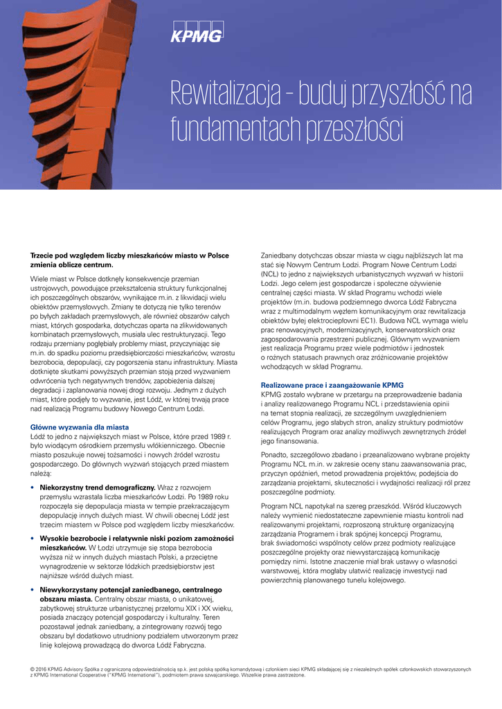 Rewitalizacja – buduj przyszłość na fundamentach przeszłości Trzecie pod względem liczby mieszkańców miasto w Polsce zmienia oblicze centrum. Wiele miast w Polsce dotknęły konsekwencje przemian ustrojowych, powodujące przekształcenia struktury funkcjonalnej ich poszczególnych obszarów, wynikające m.in. z likwidacji wielu obiektów przemysłowych. Zmiany te dotyczą nie tylko terenów po byłych zakładach przemysłowych, ale również obszarów całych miast, których gospodarka, dotychczas oparta na zlikwidowanych kombinatach przemysłowych, musiała ulec restrukturyzacji. Tego rodzaju przemiany pogłębiały problemy miast, przyczyniając się m.in. do spadku poziomu przedsiębiorczości mieszkańców, wzrostu bezrobocia, depopulacji, czy pogorszenia stanu infrastruktury. Miasta dotknięte skutkami powyższych przemian stoją przed wyzwaniem odwrócenia tych negatywnych trendów, zapobieżenia dalszej degradacji i zaplanowania nowej drogi rozwoju. Jednym z dużych miast, które podjęły to wyzwanie, jest Łódź, w której trwają prace nad realizacją Programu budowy Nowego Centrum Łodzi. Główne wyzwania dla miasta Łódź to jedno z największych miast w Polsce, które przed 1989 r. było wiodącym ośrodkiem przemysłu włókienniczego. Obecnie miasto poszukuje nowej tożsamości i nowych źródeł wzrostu gospodarczego. Do głównych wyzwań stojących przed miastem należą: • Niekorzystny trend demograficzny. Wraz z rozwojem przemysłu wzrastała liczba mieszkańców Łodzi. Po 1989 roku rozpoczęła się depopulacja miasta w tempie przekraczającym depopulację innych dużych miast. W chwili obecnej Łódź jest trzecim miastem w Polsce pod względem liczby mieszkańców. • Wysokie bezrobocie i relatywnie niski poziom zamożności mieszkańców. W Łodzi utrzymuje się stopa bezrobocia wyższa niż w innych dużych miastach Polski, a przeciętne wynagrodzenie w sektorze łódzkich przedsiębiorstw jest najniższe wśród dużych miast. Zaniedbany dotychczas obszar miasta w ciągu najbliższych lat ma stać się Nowym Centrum Łodzi. Program Nowe Centrum Łodzi (NCŁ) to jedno z największych urbanistycznych wyzwań w historii Łodzi. Jego celem jest gospodarcze i społeczne ożywienie centralnej części miasta. W skład Programu wchodzi wiele projektów (m.in. budowa podziemnego dworca Łódź Fabryczna wraz z multimodalnym węzłem komunikacyjnym oraz rewitalizacja obiektów byłej elektrociepłowni EC1). Budowa NCŁ wymaga wielu prac renowacyjnych, modernizacyjnych, konserwatorskich oraz zagospodarowania przestrzeni publicznej. Głównym wyzwaniem jest realizacja Programu przez wiele podmiotów i jednostek o rożnych statusach prawnych oraz zróżnicowanie projektów wchodzących w skład Programu. Realizowane prace i zaangażowanie KPMG KPMG zostało wybrane w przetargu na przeprowadzenie badania i analizy realizowanego Programu NCŁ i przedstawienia opinii na temat stopnia realizacji, ze szczególnym uwzględnieniem celów Programu, jego słabych stron, analizy struktury podmiotów realizujących Program oraz analizy możliwych zewnętrznych źródeł jego finansowania. Ponadto, szczegółowo zbadano i przeanalizowano wybrane projekty Programu NCŁ m.in. w zakresie oceny stanu zaawansowania prac, przyczyn opóźnień, metod prowadzenia projektów, podejścia do zarządzania projektami, skuteczności i wydajności realizacji ról przez poszczególne podmioty. Program NCŁ napotykał na szereg przeszkód. Wśród kluczowych należy wymienić niedostateczne zapewnienie miastu kontroli nad realizowanymi projektami, rozproszoną strukturę organizacyjną zarządzania Programem i brak spójnej koncepcji Programu, brak świadomości wspólnoty celów przez podmioty realizujące poszczególne projekty oraz niewystarczającą komunikację pomiędzy nimi. Istotne znaczenie miał brak ustawy o własności warstwowej, która mogłaby ułatwić realizację inwestycji nad powierzchnią planowanego tunelu kolejowego. • Niewykorzystany potencjał zaniedbanego, centralnego obszaru miasta. Centralny obszar miasta, o unikatowej, zabytkowej strukturze urbanistycznej przełomu XIX i XX wieku, posiada znaczący potencjał gospodarczy i kulturalny. Teren pozostawał jednak zaniedbany, a zintegrowany rozwój tego obszaru był dodatkowo utrudniony podziałem utworzonym przez linię kolejową prowadzącą do dworca Łódź Fabryczna. © 2016 KPMG Advisory Spółka z ograniczoną odpowiedzialnością sp.k. jest polską spółką komandytową i członkiem sieci KPMG składającej się z niezależnych spółek członkowskich stowarzyszonych z KPMG International Cooperative (“KPMG International”), podmiotem prawa szwajcarskiego. Wszelkie prawa zastrzeżone. W wyniku przeprowadzonych analiz KPMG przedstawiło szereg rekomendacji. Aby zwiększyć kontrolę miasta nad realizacją Programu NCŁ, zaproponowano powołanie Dyrektora NCŁ i utworzenie Zarządu Planowania, Nadzoru i Rozwoju NCŁ. Przygotowano model zarządzania Programem obejmujący: Finalizowana jest rewitalizacja obiektów kompleksu EC1 Wschód, które będą pełnić funkcje kulturalno-artystyczne (rewitalizacja została nagrodzona tytułem Bryła roku 2013) oraz obiektów EC1 Zachód, gdzie zlokalizowane będzie Centrum Nauki i Techniki. Trwają prace nad budową podziemnej części nowego dworca Łódź Fabryczna. • Zdefiniowanie organizacyjnej i prawnej struktury zarządzania, Przykład Łodzi Realizowany w Łodzi Program jest przykładem spójnego podejścia do wykreowania nowego obszaru funkcjonalnego centrum miasta. Zarówno obszar inwestycji, jak i liczba planowanych i realizowanych projektów są imponujące. Tak złożone przedsięwzięcie wymaga wdrożenia modelu zarządzania obejmującego m.in. zdefiniowanie skutecznej struktury organizacyjnej z jasnym określeniem ról i kompetencji, stworzenie systemu komunikacji angażującego kluczowych interesariuszy oraz uruchomienie mechanizmów zarządzania 