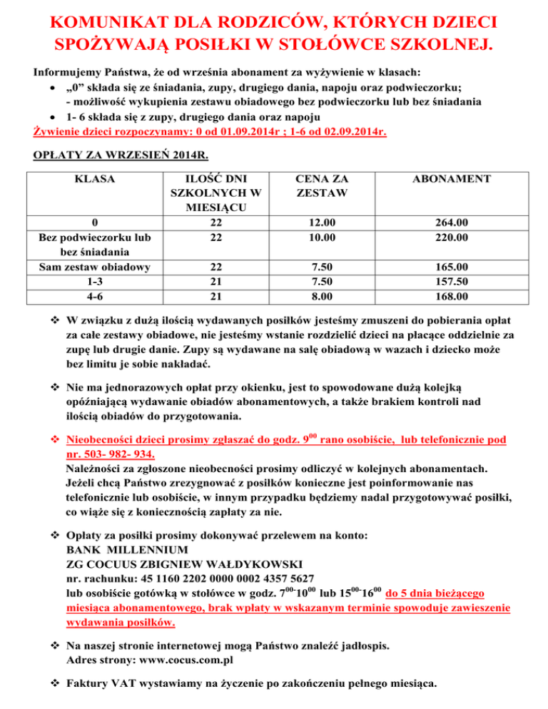 KOMUNIKAT DLA RODZICÓW, KTÓRYCH DZIECI SPOŻYWAJĄ POSIŁKI W STOŁÓWCE SZKOLNEJ. Informujemy Państwa, że od września abonament za wyżywienie w klasach: „0” składa się ze śniadania, zupy, drugiego dania, napoju oraz podwieczorku; - możliwość wykupienia zestawu obiadowego bez podwieczorku lub bez śniadania 1- 6 składa się z zupy, drugiego dania oraz napoju Żywienie dzieci rozpoczynamy: 0 od 01.09.2014r ; 1-6 od 02.09.2014r. OPŁATY ZA WRZESIEŃ 2014R. KLASA 0 Bez podwieczorku lub bez śniadania Sam zestaw obiadowy 1-3 4-6 ILOŚĆ DNI SZKOLNYCH W MIESIĄCU 22 22 CENA ZA ZESTAW ABONAMENT 12.00 10.00 264.00 220.00 22 21 21 7.50 7.50 8.00 165.00 157.50 168.00 W związku z dużą ilością wydawanych posiłków jesteśmy zmuszeni do pobierania opłat za całe zestawy obiadowe, nie jesteśmy wstanie rozdzielić dzieci na płacące oddzielnie za zupę lub drugie danie. Zupy są wydawane na salę obiadową w wazach i dziecko może bez limitu je sobie nakładać. Nie ma jednorazowych opłat przy okienku, jest to spowodowane dużą kolejką opóźniającą wydawanie obiadów abonamentowych, a także brakiem kontroli nad ilością obiadów do przygotowania. Nieobecności dzieci prosimy zgłaszać do godz. 900 rano osobiście, lub telefonicznie pod nr. 503- 982- 934. Należności za zgłoszone nieobecności prosimy odliczyć w kolejnych abonamentach. Jeżeli chcą Państwo zrezygnować z posiłków konieczne jest poinformowanie nas telefonicznie lub osobiście, w innym przypadku będziemy nadal przygotowywać posiłki, co wiąże się z koniecznością zapłaty za nie. Opłaty za posiłki prosimy dokonywać przelewem na konto: BANK MILLENNIUM ZG COCUUS ZBIGNIEW WAŁDYKOWSKI nr. rachunku: 45 1160 2202 0000 0002 4357 5627 lub osobiście gotówką w stołówce w godz. 700-1000 lub 1500-1600 do 5 dnia bieżącego miesiąca abonamentowego, brak wpłaty w wskazanym terminie spowoduje zawieszenie wydawania posiłków. Na naszej stronie internetowej mogą Państwo znaleźć jadłospis. Adres strony: www.cocus.com.pl Faktury VAT wystawiamy na życzenie po zakończeniu pełnego miesiąca.