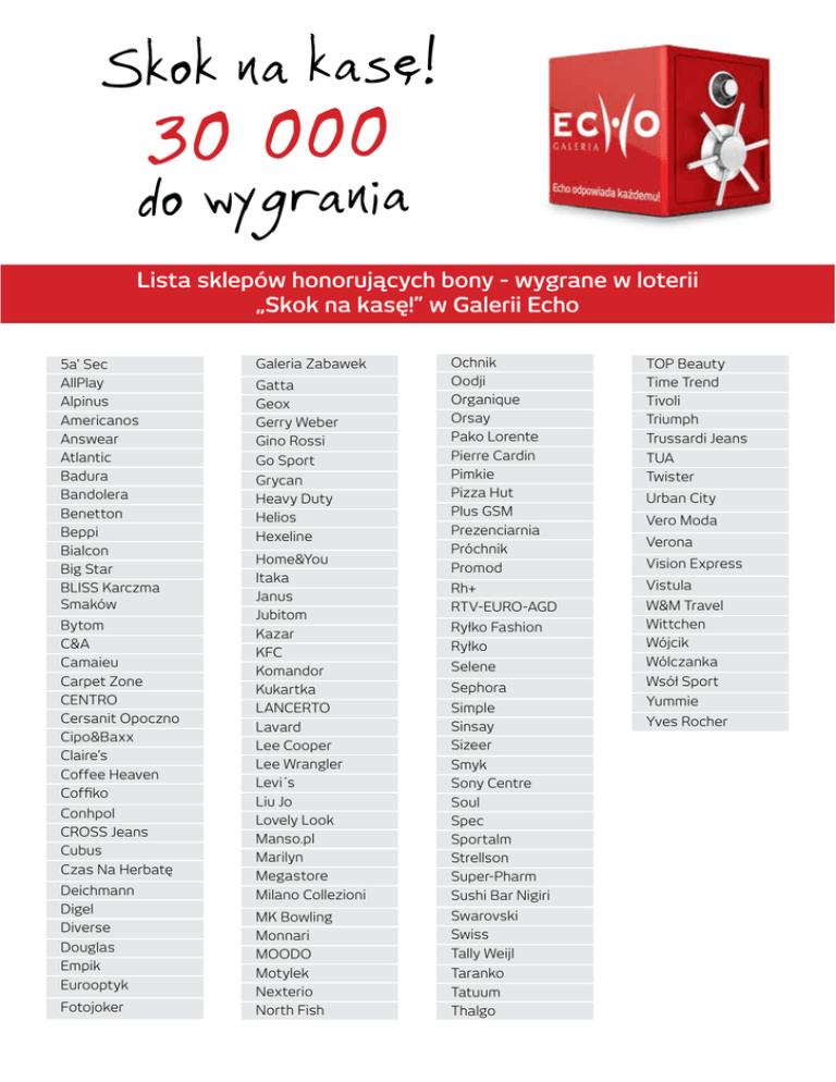Skok na kasę! do wygrania Lista sklepów honorujących bony - wygrane w loterii „Skok na kasę!” w Galerii Echo 5a' Sec AllPlay Alpinus Americanos Answear Atlantic Badura Bandolera Benetton Beppi Bialcon Big Star BLISS Karczma Smaków Bytom C&A Camaieu Carpet Zone CENTRO Cersanit Opoczno Cipo&Baxx Claire’s Coffee Heaven Coffiko Conhpol CROSS Jeans Cubus Czas Na Herbatę Deichmann Digel Diverse Douglas Empik Eurooptyk Fotojoker Galeria Zabawek Gatta Geox Gerry Weber Gino Rossi Go Sport Grycan Heavy Duty Helios Hexeline Home&You Itaka Janus Jubitom Kazar KFC Komandor Kukartka LANCERTO Lavard Lee Cooper Lee Wrangler Levi´s Liu Jo Lovely Look Manso.pl Marilyn Megastore Milano Collezioni MK Bowling Monnari MOODO Motylek Nexterio North Fish Ochnik Oodji Organique Orsay Pako Lorente Pierre Cardin Pimkie Pizza Hut Plus GSM Prezenciarnia Próchnik TOP Beauty Time Trend Tivoli Triumph Trussardi Jeans TUA Twister Urban City Vero Moda Verona Promod Vision Express Rh+ RTV-EURO-AGD Vistula Ryłko Fashion Ryłko Selene W&M Travel Wittchen Wójcik Wólczanka Sephora Wsół Sport Simple Sinsay Sizeer Yves Rocher Smyk Sony Centre Soul Spec Sportalm Strellson Super-Pharm Sushi Bar Nigiri Swarovski Swiss Tally Weijl Taranko Tatuum Thalgo Yummie