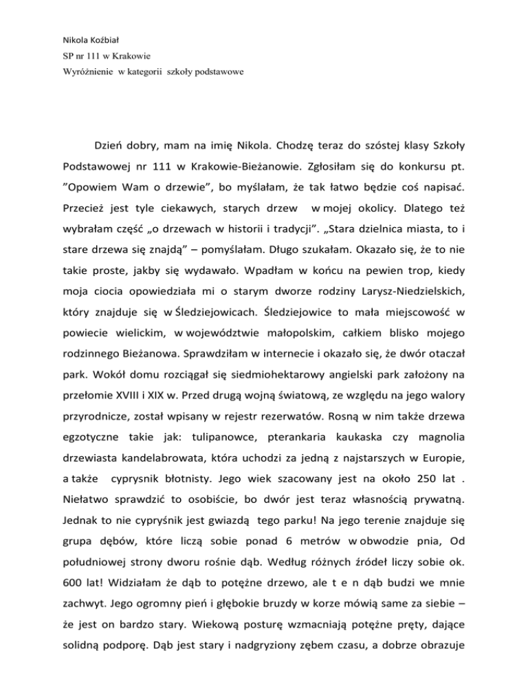 Nikola Koźbiał SP nr 111 w Krakowie Wyróżnienie w kategorii szkoły podstawowe Dzień dobry, mam na imię Nikola. Chodzę teraz do szóstej klasy Szkoły Podstawowej nr 111 w Krakowie-Bieżanowie. Zgłosiłam się do konkursu pt. ”Opowiem Wam o drzewie”, bo myślałam, że tak łatwo będzie coś napisać. Przecież jest tyle ciekawych, starych drzew w mojej okolicy. Dlatego też wybrałam część „o drzewach w historii i tradycji”. „Stara dzielnica miasta, to i stare drzewa się znajdą” – pomyślałam. Długo szukałam. Okazało się, że to nie takie proste, jakby się wydawało. Wpadłam w końcu na pewien trop, kiedy moja ciocia opowiedziała mi o starym dworze rodziny Larysz-Niedzielskich, który znajduje się w Śledziejowicach. Śledziejowice to mała miejscowość w powiecie wielickim, w województwie małopolskim, całkiem blisko mojego rodzinnego Bieżanowa. Sprawdziłam w internecie i okazało się, że dwór otaczał park. Wokół domu rozciągał się siedmiohektarowy angielski park założony na przełomie XVIII i XIX w. Przed drugą wojną światową, ze względu na jego walory przyrodnicze, został wpisany w rejestr rezerwatów. Rosną w nim także drzewa egzotyczne takie jak: tulipanowce, pterankaria kaukaska czy magnolia drzewiasta kandelabrowata, która uchodzi za jedną z najstarszych w Europie, a także cyprysnik błotnisty. Jego wiek szacowany jest na około 250 lat . Niełatwo sprawdzić to osobiście, bo dwór jest teraz własnością prywatną. Jednak to nie cypryśnik jest gwiazdą tego parku! Na jego terenie znajduje się grupa dębów, które liczą sobie ponad 6 metrów w obwodzie pnia, Od południowej strony dworu rośnie dąb. Według różnych źródeł liczy sobie ok. 600 lat! Widziałam że dąb to potężne drzewo, ale t e n dąb budzi we mnie zachwyt. Jego ogromny pień i głębokie bruzdy w korze mówią same za siebie – że jest on bardzo stary. Wiekową posturę wzmacniają potężne pręty, dające solidną podporę. Dąb jest stary i nadgryziony zębem czasu, a dobrze obrazuje to wielka szczelina w jego pniu. Jest jak staruszek o lasce, który musi się podeprzeć. Dąb, jak gdyby wstydząc się swojej kondycji zdrowotnej, okrył się bluszczem niby płaszczem. O dębie można pisać i pisać, ale nic nie odda jego majestatycznego wyglądu, dopóki nie ujrzy się go na własne oczy. Mogłam sama tego doświadczyć, gdyż wybrałam się do dworku, a właściciel był tak dobry, że pozwolił mi na podziwianie i zachwycanie się dębem. Stoi tak dostojnie i w pełnej swej krasie, jakby chciał powiedzieć „Słuchajcie, ja jestem panem tego parku”. Wśród innych drzew on stoi jak strażnik - potężny twardy i ogromny. Jego rozłożyste gałęzie fundują ptakom schronienie. Uwiły sobie w nich gniazdko. Nam ludziom dają ogromny cień w upalne lato. Dąb rośnie powoli, swymi korzeniami sięga bardzo głęboko w ziemię. Może chce schować swe tajemnice. Można powiedzieć, że takie wielkie, zwaliste drzewo nie ma gracij, ale poruszone delikatnym wiatrem listki pięknie szumią w letni popołudniowy dzień. To jest niczym balsam dla zbolałych uszu od codziennego zgiełku. Mogłam tak trwać i wsłuchiwać się w ten szum i śpiew. Może dąb chce powiedzieć, jak się czuję albo co go boli? A może tylko zdradza ile ma lat? Kiedyś w przyszłości chciałabym być taka jak ten dąb. Wielka (nie dosłownie), silna, twarda a jednocześnie pełna dostojności. Długowieczność i okazały wygląd dębów od wieków wywierały na ludziach duże wrażenie, uważane były za strażników lasu. Przynosiły szczęście, dobrobyt i zdrowie. Dlatego obsadzono nimi parki i lasy. Jeśli będąc na spacerze, zobaczycie gdzieś to drzewo, przystańcie i przytulcie się do niego. Zamknijcie oczy i dajcie się ponieść fantazji. Możecie z nim porozmawiać o swoich kłopotach i tajemnicach. Kto jak kto, ale On na pewno nikomu nic nie powie, a może nawet podsunie myśl, jak zaradzić danemu kłopotowi. Wzmianki o dębach znajdują się w starym testamencie. Czytamy tam o Abrahamie siadającym pod dębami Mamre. Niektórzy siadali pod dębami, aby odpocząć czy móc porozmawiać, a sam Ildefons Gałczyński latem wolał oglądać wszystko z góry. Wdrapywał się na dach dworu nocą, przez co przykleił się do niego przydomek „kot”. Można tylko przypuszczać, że wtedy poecie przychodziły go głowy wspaniałe inspiracje. Pewnego lata wykonane zostało słynne zdjęcie Gałczyńskiego okrytego peleryną i w cylindrze. Klasycystyczny dwór oraz jeden z najwspanialszych parków dworskich z pięknym starodrzewem, posiada jeszcze w dolnej części parku uroczy staw rybny. Cała posiadłość jest od dawna w posiadaniu prywatnym i nie można zobaczyć parku ot tak. Jednakże dzięki uprzejmości właściciela, w tamtym roku został zorganizowany plener artystyczny „wędrówka ze sztuką”, w którym uczestniczyło 20 artystów. Mogli zobaczyć zabytkową posiadłość dworską oraz jej przepiękny i bardzo stary park.