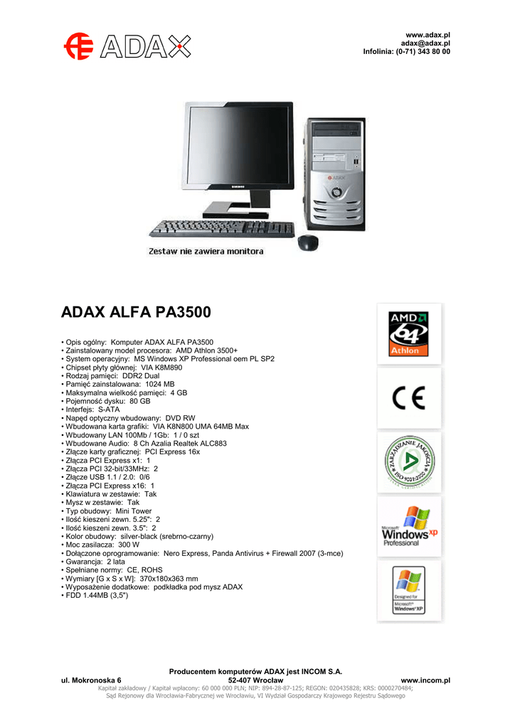 www.adax.pl [email protected] Infolinia: (0-71) 343 80 00 ADAX ALFA PA3500 • Opis ogólny: Komputer ADAX ALFA PA3500 • Zainstalowany model procesora: AMD Athlon 3500+ • System operacyjny: MS Windows XP Professional oem PL SP2 • Chipset płyty głównej: VIA K8M890 • Rodzaj pamięci: DDR2 Dual • Pamięć zainstalowana: 1024 MB • Maksymalna wielkość pamięci: 4 GB • Pojemność dysku: 80 GB • Interfejs: S-ATA • Napęd optyczny wbudowany: DVD RW • Wbudowana karta grafiki: VIA K8N800 UMA 64MB Max • Wbudowany LAN 100Mb / 1Gb: 1 / 0 szt • Wbudowane Audio: 8 Ch Azalia Realtek ALC883 • Złącze karty graficznej: PCI Express 16x • Złącza PCI Express x1: 1 • Złącza PCI 32-bit/33MHz: 2 • Złącze USB 1.1 / 2.0: 0/6 • Złącza PCI Express x16: 1 • Klawiatura w zestawie: Tak • Mysz w zestawie: Tak • Typ obudowy: Mini Tower • Ilość kieszeni zewn. 5.25": 2 • Ilość kieszeni zewn. 3.5": 2 • Kolor obudowy: silver-black (srebrno-czarny) • Moc zasilacza: 300 W • Dołączone oprogramowanie: Nero Express, Panda Antivirus + Firewall 2007 (3-mce) • Gwarancja: 2 lata • Spełniane normy: CE, ROHS • Wymiary [G x S x W]: 370x180x363 mm • WyposaŜenie dodatkowe: podkładka pod mysz ADAX • FDD 1.44MB (3,5") ul. Mokronoska 6 Producentem komputerów ADAX jest INCOM S.A. 52-407 Wrocław www.incom.pl Kapitał zakładowy / Kapitał wpłacony: 60 000 000 PLN; NIP: 894-28-87-125; REGON: 020435828; KRS: 0000270484; Sąd Rejonowy dla Wrocławia-Fabrycznej we Wrocławiu, VI Wydział Gospodarczy Krajowego Rejestru Sądowego
