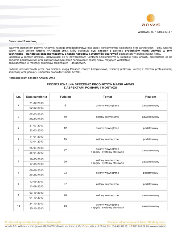 Włocławek, dn. 4 lutego 2013 r. Szanowni Państwo, Ważnym elementem polityki rynkowej naszego przedsiębiorstwa jest stałe i konsekwentne wspieranie firm partnerskich. Temu właśnie celowi służy projekt ANWIS PARTNER 2013, który obejmuje cykl szkoleń z zakresu produktów marki ANWIS w tym techniczno - handlowe oraz montażowe, a także napędów i systemów sterowań dostępnych w ofercie naszej firmy. Szkolenia w ramach projektu, odbywające się w nowoczesnym Centrum Szkoleniowym w siedzibie firmy ANWIS, prowadzone są na poziomie podstawowym oraz zaawansowanym przez handlowców naszej firmy, mających wieloletnie doświadczenie w realizacji projektów szkoleniowo – doradczych. Podczas prowadzonych przez nas szkoleń, mogą Państwo zdobyć kompleksową, wspartą praktyką, wiedzę z zakresu profesjonalnej sprzedaży oraz pomiaru i montażu produktów marki ANWIS. Harmonogram szkoleń ANWIS 2013 PROFESJONALNA SPRZEDAŻ PRODUKTÓW MARKI ANWIS Z ASPEKTAMI POMIARU I MONTAŻU Lp. Data szkolenia Tydzień Temat Poziom 8 osłony wewnętrzne zawansowany 10 osłony zewnętrzne zawansowany 12 osłony wewnętrzne podstawowy 15 osłony zewnętrzne podstawowy 17 osłony wewnętrzne napędy i systemy sterowań zawansowany 20 osłony zewnętrzne napędy i systemy sterowań zawansowany 23 osłony wewnętrzne podstawowy 37 osłony zewnętrzne podstawowy 40 osłony zewnętrzne zawansowany 43 napędy i systemy sterowań osłony wewnętrzne napędy i systemy sterowań zawansowany 21-02-2013 1 22-02-2013 07-03-2013 2 08-03-2013 21-03-2013 3 22-03-2013 11-04-2013 4 12-04-2013 25-04-2013 5 26-04-2013 16-05-2013 6 17-05-2013 06-06-2013 7 07-06-2013 12-09-2013 8 13-09-2013 03-10-2013 9 04-10-2013 24-10-2013 10 25-10-2013 14-11-2013 46 11 15-11-2013 osłony zewnętrzne napędy i systemy sterowań zawansowany 1. Każdy z uczestników projektu otrzyma materiały dydaktyczne oraz certyfikat potwierdzający ukończenie szkolenia. 2. Koszt udziału w szkoleniu asortymentowym dla partnerów handlowych jest bezpłatny. 3. Aby dokonać zgłoszenia na wybrane szkolenie, prosimy o wypełnienie i odesłanie zwrotne załączonego formularza /nr fax 054 412 88 26 lub e-mail [email protected]/. 4. W przypadku rezygnacji z udział w szkoleniu prosimy o bezzwłoczne przekazanie informacji. 5. Dla osób zainteresowanych rezerwacją noclegu w okresie trwania szkoleń przesyłamy zestawienie wybranych włocławskich hoteli. Pensjonat MICHELIN Hotel MŁYN Hotel RATUSZOWY www.pensjonatmichelin.com.pl www.hotelmlyn.pl www.hotelratuszowy.pl Wszelkie zapytania związane z organizacją szkoleń prosimy kierować na adres: e-mail: [email protected] W przypadku pytań proszę o kontakt telefoniczny Z poważaniem Agnieszka Gołębiewska Kierownik Działu Marketingu tel. 0 693 305 176 e-mail: [email protected]