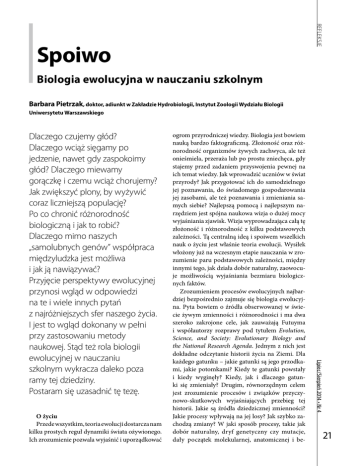 REFLEKSJE Spoiwo Biologia ewolucyjna w nauczaniu szkolnym Barbara Pietrzak, doktor, adiunkt w Zakładzie Hydrobiologii, Instytut Zoologii Wydziału Biologii Uniwersytetu Warszawskiego O życiu Przede wszystkim, teoria ewolucji dostarcza nam kilku prostych reguł dynamiki świata ożywionego. Ich zrozumienie pozwala wyjaśnić i uporządkować ogrom przyrodniczej wiedzy. Biologia jest bowiem nauką bardzo faktograficzną. Złożoność oraz różnorodność organizmów żywych zachwyca, ale też onieśmiela, przeraża lub po prostu zniechęca, gdy stajemy przed zadaniem przyswojenia pewnej na ich temat wiedzy. Jak wprowadzić uczniów w świat przyrody? Jak przygotować ich do samodzielnego jej poznawania, do świadomego gospodarowania jej zasobami, ale też poznawania i zmieniania samych siebie? Najlepszą pomocą i najlepszym narzędziem jest spójna naukowa wizja o dużej mocy wyjaśniania zjawisk. Wizja wyprowadzająca całą tę złożoność i różnorodność z kilku podstawowych zależności. Tą centralną ideą i spoiwem wszelkich nauk o życiu jest właśnie teoria ewolucji. Wysiłek włożony już na wczesnym etapie nauczania w zrozumienie paru podstawowych zależności, między innymi tego, jak działa dobór naturalny, zaowocuje możliwością wyjaśniania bezmiaru biologicznych faktów. Zrozumieniem procesów ewolucyjnych najbardziej bezpośrednio zajmuje się biologia ewolucyjna. Pyta bowiem o źródła obserwowanej w świecie żywym zmienności i różnorodności i ma dwa szeroko zakrojone cele, jak zauważają Futuyma i współautorzy rozprawy pod tytułem Evolution, Science, and Society: Evolutionary Biology and the National Research Agenda. Jednym z nich jest dokładne odczytanie historii życia na Ziemi. Dla każdego gatunku – jakie gatunki są jego przodkami, jakie potomkami? Kiedy te gatunki powstały i kiedy wyginęły? Kiedy, jak i dlaczego gatunki się zmieniały? Drugim, równorzędnym celem jest zrozumienie procesów i związków przyczynowo-skutkowych wyjaśniających przebieg tej historii. Jakie są źródła dziedzicznej zmienności? Jakie procesy wpływają na jej losy? Jak szybko zachodzą zmiany? W jaki sposób procesy, takie jak dobór naturalny, dryf genetyczny czy mutacje, dały początek molekularnej, anatomicznej i be- Lipiec/Sierpień 2014 • Nr 4 Dlaczego czujemy głód? Dlaczego wciąż sięgamy po jedzenie, nawet gdy zaspokoimy głód? Dlaczego miewamy gorączkę i czemu wciąż chorujemy? Jak zwiększyć plony, by wyżywić coraz liczniejszą populację? Po co chronić różnorodność biologiczną i jak to robić? Dlaczego mimo naszych „samolubnych genów” współpraca międzyludzka jest możliwa i jak ją nawiązywać? Przyjęcie perspektywy ewolucyjnej przynosi wgląd w odpowiedzi na te i wiele innych pytań z najróżniejszych sfer naszego życia. I jest to wgląd dokonany w pełni przy zastosowaniu metody naukowej. Stąd też rola biologii ewolucyjnej w nauczaniu szkolnym wykracza daleko poza ramy tej dziedziny. Postaram się uzasadnić tę tezę. 21 REFLEKSJE Lipiec/Sierpień 2014 • Nr 4 22 hawioralnej różnorodności organizmów żywych? I wreszcie, jak populacje stają się różnymi gatunkami? Rozwój praktycznie wszystkich nauk biologicznych wnosi wkład w odpowiedzi na te pytania, z kolei zrozumienie procesów ewolucyjnych wzbogaca każdą dziedzinę biologii. O nauce Tu dochodzimy do drugiego ważnego punktu. Teoria ewolucji i zakorzeniona wprost w niej biologia ewolucyjna świetnie ukazują, czym są teoria naukowa i naukowe poznanie świata. Teoria ewolucji jest jedną z najważniejszych współczesnych koncepcji naukowych i jednocześnie została sformułowana w sposób umożliwiający jej zrozumienie przez niespecjalistę. Tak jak podstawowe teorie w innych naukach, stanowi system twierdzeń najlepiej wyjaśniający badane zjawisko, czyli między innymi zmienność i różnorodność organizmów żywych. Kluczowa w teorii naukowej jest zasada, że twierdzenia te są falsyfikowalne, to znaczy można je obalić, jeśli pojawią się fakty, które im zaprzeczą. Ich prawdziwość poddaje się więc nieustannie empirycznemu testowaniu, a testowaniem hipotez wyprowadzonych z założeń teorii ewolucji zajmuje się właśnie biologia ewolucyjna. Podstawowe założenia teorii ewolucji są wyrażone bez użycia języka matematyki i odwołują się raczej do intuicyjnie rozumianych zjawisk niż do abstrakcyjnych pojęć. To, jak pisze Karol Sabath, daje uczniom możliwość samodzielnego wejrzenia w strukturę teorii naukowej i zastosowanie najogólniejszych jej założeń do wyjaśniania faktów szczegółowych. Procesy ewolucyjne kojarzymy zwykle z geologiczną skalą czasową. I rzeczywiście, najczęściej na lekcji będziemy pytać o źródła powstałych wcześniej adaptacji, testować użyteczność wykształconych już cech w określonych warunkach środowiska, czy symulować działanie doboru w grach planszowych lub komputerowych. Ewolucja może jednak zachodzić wprost na naszych oczach, jeśli skupimy uwagę na organizmach o krótkim cyklu życiowym. Zaledwie parę lat temu ukazały się w prasie naukowej doniesienia o wywołanej w laboratorium ewolucji wielokomórkowości – spekulowano, czy w podobnych warunkach doboru i za pomocą podobnych rozwiązań molekularnych doszło do tego też, po raz pierwszy, miliony lat temu. W tym roku ukazały się artykuły opisujące podobne eksperymenty zaprojektowane tak, by w ciągu kilku dni lub kilku tygodni można je było odtworzyć „w probówce” w warunkach lekcji szkolnej. Ratcliff i współautorzy podają procedurę doboru prowadzącego do ewolucji wielokomórkowości u drożdży. Spiers zaś opisuje eksperyment z zastosowaniem niechorobotwórczego szczepu bakterii. Powyższe badania nad ewolucją w akcji ukazują jednocześnie żywą, dynamicznie rozwijającą się naukę. Biologia ewolucyjna nie jest skostniałą dyscypliną ani nie zajmuje się wyłącznie badanie