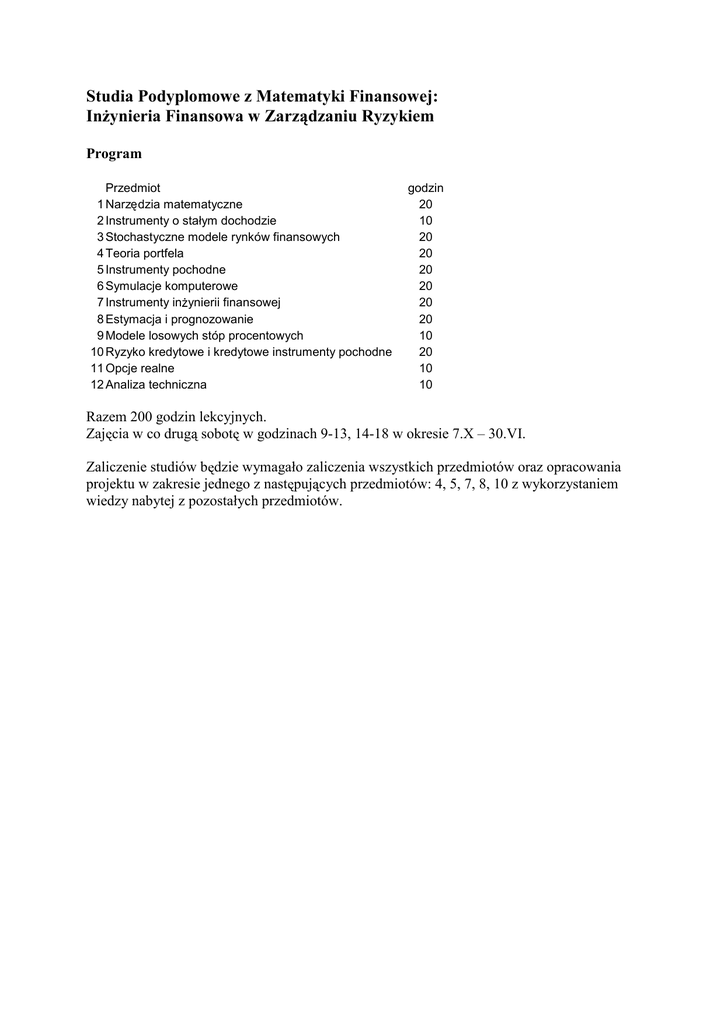 Studia Podyplomowe z Matematyki Finansowej: In ynieria Finansowa w Zarz dzaniu Ryzykiem Program Przedmiot 1 Narz dzia matematyczne 2 Instrumenty o stałym dochodzie 3 Stochastyczne modele rynków finansowych 4 Teoria portfela 5 Instrumenty pochodne 6 Symulacje komputerowe 7 Instrumenty in ynierii finansowej 8 Estymacja i prognozowanie 9 Modele losowych stóp procentowych 10 Ryzyko kredytowe i kredytowe instrumenty pochodne 11 Opcje realne 12 Analiza techniczna ę Ŝ godzin 20 10 20 20 20 20 20 20 10 20 10 10 Razem 200 godzin lekcyjnych. Zaj cia w co drug sobot w godzinach 9-13, 14-18 w okresie 7.X – 30.VI. Zaliczenie studiów b dzie wymagało zaliczenia wszystkich przedmiotów oraz opracowania projektu w zakresie jednego z nast puj cych przedmiotów: 4, 5, 7, 8, 10 z wykorzystaniem wiedzy nabytej z pozostałych przedmiotów.