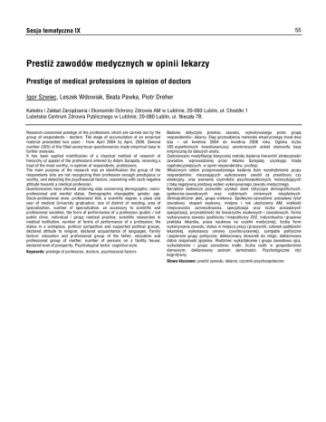Słowa kluczowe: prestiż zawodu, lekarze, czynniki psychospołeczne