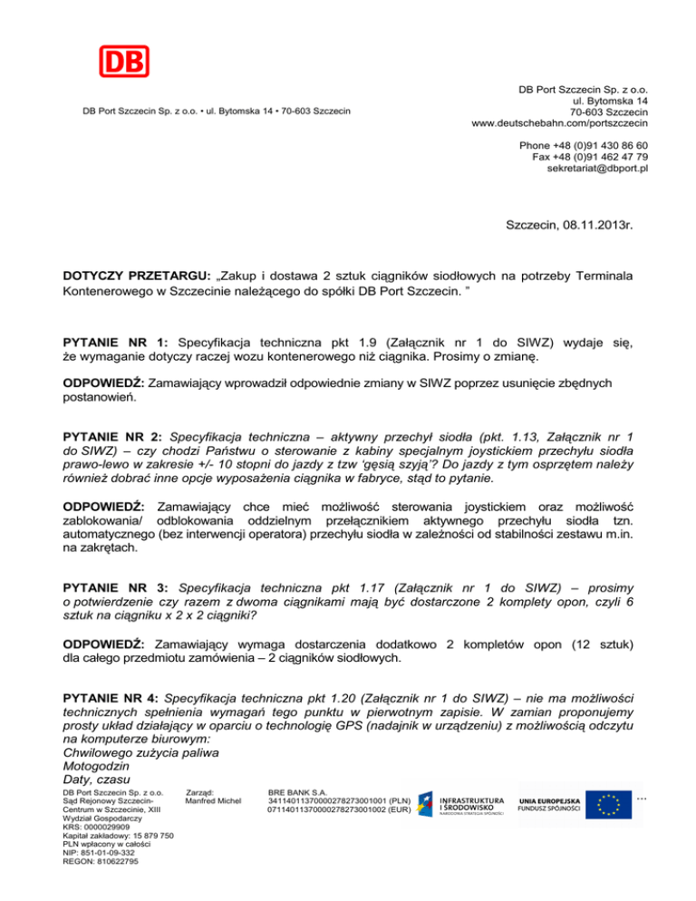 DB Port Szczecin Sp. z o.o. • ul. Bytomska 14 • 70-603 Szczecin DB Port Szczecin Sp. z o.o. ul. Bytomska 14 70-603 Szczecin www.deutschebahn.com/portszczecin Phone +48 (0)91 430 86 60 Fax +48 (0)91 462 47 79 [email protected] Szczecin, 08.11.2013r. DOTYCZY PRZETARGU: „Zakup i dostawa 2 sztuk ciągników siodłowych na potrzeby Terminala Kontenerowego w Szczecinie należącego do spółki DB Port Szczecin. ” PYTANIE NR 1: Specyfikacja techniczna pkt 1.9 (Załącznik nr 1 do SIWZ) wydaje się, że wymaganie dotyczy raczej wozu kontenerowego niż ciągnika. Prosimy o zmianę. ODPOWIEDŹ: Zamawiający wprowadził odpowiednie zmiany w SIWZ poprzez usunięcie zbędnych postanowień. PYTANIE NR 2: Specyfikacja techniczna – aktywny przechył siodła (pkt. 1.13, Załącznik nr 1 do SIWZ) – czy chodzi Państwu o sterowanie z kabiny specjalnym joystickiem przechyłu siodła prawo-lewo w zakresie +/- 10 stopni do jazdy z tzw ‘gęsią szyją’? Do jazdy z tym osprzętem należy również dobrać inne opcje wyposażenia ciągnika w fabryce, stąd to pytanie. ODPOWIEDŹ: Zamawiający chce mieć możliwość sterowania joystickiem oraz możliwość zablokowania/ odblokowania oddzielnym przełącznikiem aktywnego przechyłu siodła tzn. automatycznego (bez interwencji operatora) przechyłu siodła w zależności od stabilności zestawu m.in. na zakrętach. PYTANIE NR 3: Specyfikacja techniczna pkt 1.17 (Załącznik nr 1 do SIWZ) – prosimy o potwierdzenie czy razem z dwoma ciągnikami mają być dostarczone 2 komplety opon, czyli 6 sztuk na ciągniku x 2 x 2 ciągniki? ODPOWIEDŹ: Zamawiający wymaga dostarczenia dodatkowo 2 kompletów opon (12 sztuk) dla całego przedmiotu zamówienia – 2 ciągników siodłowych. PYTANIE NR 4: Specyfikacja techniczna pkt 1.20 (Załącznik nr 1 do SIWZ) – nie ma możliwości technicznych spełnienia wymagań tego punktu w pierwotnym zapisie. W zamian proponujemy prosty układ działający w oparciu o technologię GPS (nadajnik w urządzeniu) z możliwością odczytu na komputerze biurowym: Chwilowego zużycia paliwa Motogodzin Daty, czasu DB Port Szczecin Sp. z o.o. Sąd Rejonowy SzczecinCentrum w Szczecinie, XIII Wydział Gospodarczy KRS: 0000029909 Kapitał zakładowy: 15 879 750 PLN wpłacony w całości NIP: 851-01-09-332 REGON: 810622795 Zarząd: Manfred Michel BRE BANK S.A. 34114011370000278273001001 (PLN) 07114011370000278273001002 (EUR) ... 2/3 Zużycia paliwa od pierwszego uruchomienia silnika w fabryce jego producenta do momentu pomiaru Poziomu paliwa z zbiorniku System wiąże się z wykupieniem co rok abonamentu przez użytkownika z kartą SIM – po stronie DB Port Szczecin. ODPOWIEDŹ: Zamawiający wprowadził następującą zmianę w załączniku nr 1 do SIWZ, punkt 1.20 Zapewnienie Zamawiającemu dostępu do systemu kontroli paliwa zapisującego następujące dane: - data i godzina otwarcia zbiornika paliwa, - ilość paliwa w zbiorniku. Urządzenie do zapisu tych danych musi spełniać co najmniej jeden warunków: - jest wyposażone w kartę pamięci do odczytu informacji w komputerze, - istnieje możliwość odczytu informacji po podłączeniu tego urządzenia do komputera ze standardowym oprogramowaniem, - istnieje możliwość odczytu informacji po podłączeniu tego urządzenia do komputera z oprogramowaniem, w które Wykonawca wyposaży komputer Zamawiającego, - działa w oparciu o technologię GPS, z możliwością odczytu danych na komputerze biurowym. W przypadku konieczności wykupienia abonamentu z kartą SIM, Wykonawca pokrywa koszty przez cały czas trwania umowy serwisowej. Dane w urządzeniu muszą być przechowywane przez minimum 30 dni. PYTANIE NR 5: Specyfikacja techniczna – katalog części zamiennych – standardowo katalog, liczący kilkaset stron, dostarczany jest w j. angielskim z rysunkami złożeniowymi i prostym opisem łatwym do interpretacji. Prosimy o akceptację. ODPOWIEDŹ: Zamawiający dopuszcza możliwość dostarczenie katalogu części zamiennych w języku angielskim. PYTANIE NR 6: Załącznik nr 1 do SIWZ, Punkt 2.5.4 – prosimy o wydłużenie czasu reakcji serwisu (przyjazdu) do 24 godzin w dni robocze. Punkt 2.5.5 – prosimy o dodanie ‘dni robocze’. Punkty 2.5.6 – 2.5.7 – prosimy o dodanie zapisu o wspólnym ewentualnym ustaleniu czasu naprawy w przypadku ograniczonej dostępności części na magazynie dostawcy. ODPOWIEDŹ: W odniesieniu do punktu 2.5.4 Zamawiający dopuszcza reakcję na zgłoszenie serwisowe w czasie nie dłuższym niż 12 godzin od otrzymania zgłoszenia, jeżeli zgłoszenie wpłynie do Wykonawcy do godziny 10:00. Natomiast jeżeli zgłoszenie wpłynie do Wykonawcy po godzinie 10:00, Zamawiający dopuszcza możliwość reakcji na zgłoszenie serwisowe w czasie nie dłuższym niż 24 godziny od otrzymania zgłoszenia od Zamawiającego. W odniesieniu do punktu 2.5.5 Zamawiający dopuszcza mozliwośc wykonania naprawy w czasie nie dłuższym niż 3 dni robocze (z zastrzeżeniem punktów 2.5.6. i 2.5.7.). W odniesieniu do punktów 2.5.6 i 2.5.7 istnieje możliwość przedłużenia terminów wyłącznie za zgodą Zamawiającego. 3/3 PYTANIE NR 7: Gwarancja techniczna i rękojmia – prosimy o określenie czasu w miesiącach, po którym bez względu na przebieg w motogodzinach okres związania gwarancją/ rękojmią się kończy. ODPOWIEDŹ: Zamawiający dokonał zmiany w odniesieniu do gwarancji i rękojmi na 24 miesiące lub 4000 motogodzin. PYTANIE NR 8: Prosimy o wprowadzenie w paragrafach dotyczących kar umownych wszystkich umów w SIWZ zapisu o: • maksymalnym poziomie kar za ewentualną zwłokę w terminowej dostawie 5% wartości Urządzenia, którego zwłoka dotyczy; • maksymalnym poziomie wszystkich ewentualnych kar wynikających z umów 10% wartości przedmiotu umowy • oraz, że Wykonawca nie będzie odpowiadać za ewentualne straty produkcji, zysków czy dochodów, wynikające z niemożności używania urządzenia lub urządzeń razem, utraty umów handlo