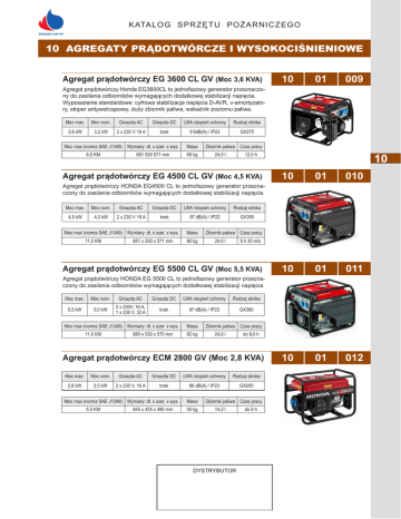 K ATA L OG SPRZĘTU POŻARNICZEGO 10 AGREGATY PRĄDOTWÓRCZE I WYSOKOCIŚNIENIOWE Agregat prądotwórczy EG 3600 CL GV (Moc 3,6 KVA) Agregat prądotwórczy Honda EG3600CL to jednofazowy generator przeznaczony do zasilania odbiorników wymagających dodatkowej stabilizacji napięcia. Wyposażenie standardowe: cyfrowa stabilizacja napięcia D-AVR, v-amortyzatory, stoper antywstrząsowy, duży zbiornik paliwa, wskaźnik poziomu paliwa. Moc max. Moc nom. Gniazda AC Gniazda DC LWA /stopień ochrony Rodzaj silnika 3,6 kW 3,2 kW 2 x 230 V 16 A brak 9 6dB(A) / IP23 GX270 Moc max (norma SAE J1349) Wymiary: dł. x szer. x wys. 8,0 KM 681 530 571 mm Masa 68 kg 24,0 l Moc max. Moc nom. Gniazda AC Gniazda DC LWA /stopień ochrony Rodzaj silnika 4,5 kW 4,0 kW 2 x 230 V 16 A brak 97 dB(A) / IP23 GX390 681 x 530 x 571 mm Masa 80 kg 24,0 l Moc max. Moc nom. Gniazda AC Gniazda DC LWA /stopień ochrony Rodzaj silnika 5,5 kW 5,0 kW 2 x 230V, 16 A, 1 x 230 V, 32 A brak 97 dB(A) / IP23 GX390 680 x 530 x 570 mm Masa 82 kg 24,0 l Moc nom. Gniazda AC Gniazda DC LWA /stopień ochrony Rodzaj silnika 2,8 kW 2,5 kW 2 x 230 V, 16 A brak 96 dB(A) / IP23 GX200 645 x 435 x 490 mm Masa 50 kg 10 01 011 10 01 012 do 8,0 h Moc max. 5,5 KM 010 Zbiornik paliwa Czas pracy Agregat prądotwórczy ECM 2800 GV (Moc 2,8 KVA) Moc max (norma SAE J1349) Wymiary: dł. x szer. x wys. 01 9 h 30 min. Agregat prądotwórczy HONDA EG 5500 CL to jednofazowy generator przeznaczony do zasilania odbiorników wymagających dodatkowej stabilizacji napięcia. 11,0 KM 10 Zbiornik paliwa Czas pracy Agregat prądotwórczy EG 5500 CL GV (Moc 5,5 KVA) Moc max (norma SAE J1349) Wymiary: dł. x szer. x wys. 009 12,0 h Agregat prądotwórczy HONDA EG4500 CL to jednofazowy generator przeznaczony do zasilania odbiorników wymagających dodatkowej stabilizacji napięcia. 11,0 KM 01 Zbiornik paliwa Czas pracy Agregat prądotwórczy EG 4500 CL GV (Moc 4,5 KVA) Moc max (norma SAE J1349) Wymiary: dł. x szer. x wys. 10 Zbiornik paliwa Czas pracy 14,2 l DYSTRYBUTOR do 9 h