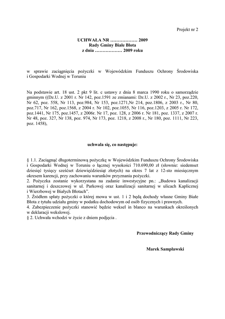 Projekt nr 2 UCHWAŁA NR ……………… 2009 Rady Gminy Białe Błota z dnia ……………… 2009 roku w sprawie zaciągnięcia poŜyczki w Wojewódzkim Funduszu Ochrony Środowiska i Gospodarki Wodnej w Toruniu Na podstawie art. 18 ust. 2 pkt 9 lit. c ustawy z dnia 8 marca 1990 roku o samorządzie gminnym ((Dz.U. z 2001 r. Nr 142, poz.1591 ze zmianami: Dz.U. z 2002 r., Nr 23, poz.220, Nr 62, poz. 558, Nr 113, poz.984, Nr 153, poz.1271,Nr 214, poz.1806, z 2003 r., Nr 80, poz.717, Nr 162, poz.1568, z 2004 r. Nr 102, poz.1055, Nr 116, poz.1203, z 2005 r. Nr 172, poz.1441, Nr 175, poz.1457, z 2006r. Nr 17, poz. 128, z 2006 r. Nr 181, poz. 1337, z 2007 r. Nr 48, poz. 327, Nr 138, poz. 974, Nr 173, poz. 1218, z 2008 r., Nr 180, poz. 1111, Nr 223, poz. 1458), uchwala się, co następuje: § 1.1. Zaciągnąć długoterminową poŜyczkę w Wojewódzkim Funduszu Ochrony Środowiska i Gospodarki Wodnej w Toruniu o łącznej wysokości 710.690,00 zł (słownie: siedemset dziesięć tysięcy sześćset dziewięćdziesiąt złotych) na okres 7 lat z 12-sto miesięcznym okresem karencji, przy zachowaniu warunków przyznania poŜyczki. 2. PoŜyczka zostanie wykorzystana na zadanie inwestycyjne pn.: „Budowa kanalizacji sanitarnej i deszczowej w ul. Parkowej oraz kanalizacji sanitarnej w ulicach Kaplicznej i Wierzbowej w Białych Błotach”. 3. Źródłem spłaty poŜyczki o której mowa w ust. 1 i 2 będą dochody własne Gminy Białe Błota z tytułu udziału gminy w podatku dochodowym od osób fizycznych i prawnych. 4. Zabezpieczenie poŜyczki stanowić będzie weksel in blanco na warunkach określonych w deklaracji wekslowej. § 2. Uchwała wchodzi w Ŝycie z dniem podjęcia . Przewodniczący Rady Gminy Marek Sampławski Uzasadnienie Zarząd Wojewódzkiego Funduszu Ochrony Środowiska i Gospodarki Wodnej w Toruniu poinformował Gminę Białe Błota, Ŝe uchwałą Rady Nadzorczej Nr 30/09 z dnia 27 marca 2009 roku wniosek p.n.: „Budowa kanalizacji sanitarnej i deszczowej w ul. Parkowej oraz kanalizacji sanitarnej w ulicach Kaplicznej i Wierzbowej w Białych Błotach” został wprowadzony na listę zadań przewidzianą do dofinansowania. Zabezpieczona kwota poŜyczki wynosi 710.690,00 zł. Kwota podana w niniejszej uchwale została zabezpieczona promesą do dnia 30 czerwca 2009 roku. W tej sytuacji zachodzi potrzeba podjęcia przez Radę Gminy stosownej uchwały na zaciągniecie poŜyczki. Przewodniczący Rady Gminy Marek Sampławski
