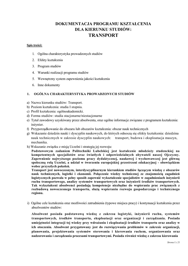 DOKUMENTACJA PROGRAMU KSZTAŁCENIA DLA KIERUNKU STUDIÓW: TRANSPORT Spis treści: 1. Ogólna charakterystyka prowadzonych studiów 2. Efekty kształcenia 3. Program studiów 4. Warunki realizacji programu studiów 5. Wewnętrzny system zapewnienia jakości kształcenia 6. Inne dokumenty 1. OGÓLNA CHARAKTERYSTYKA PROWADZONYCH STUDIÓW a) b) c) d) e) Nazwa kierunku studiów: Transport. Poziom kształcenia: studia I stopnia. Profil kształcenia: ogólnoakademicki. Forma studiów: studia stacjonarne/niestacjonarne Tytuł zawodowy uzyskiwany przez absolwenta, oraz ogólne informacje związane z programem kształcenia: inżynier. f) Przyporządkowanie do obszaru lub obszarów kształcenia: obszar nauk technicznych g) Wskazanie dziedzin nauki i dyscyplin naukowych, do których odnoszą się efekty kształcenia: dziedzina nauk technicznych w zakresie dyscyplin naukowych: transport, budowa i eksploatacja maszyn, mechanika. h) Wskazanie związku z misją Uczelni i strategią jej rozwoju: Podstawowym zadaniem Politechniki Lubelskiej jest kształcenie młodzieży studenckiej na kompetentnych specjalistów oraz światłych i odpowiedzialnych obywateli naszej Ojczyzny. Zapewnienie najwyższego poziomu pracy dydaktycznej, naukowej i wychowawczej jest główną społeczną rolą Uczelni, a udział w tworzeniu europejskiej przestrzeni edukacyjnej - obowiązkiem wobec przyszłych pokoleń. Transport jest nowoczesnym, interdyscyplinarnym kierunkiem studiów łączącym wiedzę z obszarów nauk technicznych, logistki i ekonomii. Połączenie wiedzy technicznej ze znajomością zagadnień logistycznych pozwala w pełny sposób zapewnić wykształcenie specjalistów w zagadnieniach inżynierii ruchu transportowego, analizy systemów transportowych oraz inżynierii środków transportowych. Tak wykształceni absolwenci posiadają kompetencje niezbędne do wspierania prac związanych z rozbudową nowoczesnego transportu, służą wspieraniu rozwoju gospodarczego i technicznego regionu. i) Ogólne cele kształcenia oraz możliwości zatrudnienia (typowe miejsca pracy) i kontynuacji kształcenia przez absolwentów studiów: Absolwent posiada podstawową wiedzę z zakresu logistyki, inżynierii ruchu, systemów transportowych, środków transportu, eksploatacji oraz organizacji i zarządzania. Posiada umiejętności integracji tej wiedzy przy wdrażaniu i eksploatacji środków transportu oraz analizy w ich otoczeniu. Absolwent przygotowany jest do rozwiązywania problemów w zakresie organizacji, planowania, projektowania systemów sterowania i kierowania ruchem, organizowania oraz nadzorowania i zarządzania procesami transportowymi. Posiada również wiedzę z zakresu kierowania Strona l z 21 zespołami, współpracy z ludźmi oraz z zarządzania placówkami eksploatacyjnymi transportu i zakładami obsługowo - naprawczymi. Wykształceni w ten sposób specjaliści mogą zasilać wszystkie branże gospodarki, gdzie istnieją problemy przemieszczania ludzi i towarów, są przygotowani do pracy w firmach zajmujących się eksploatacją pojazdów, ale także w firmach projektowo konstrukcyjnych, jednostkach organizacyjnych służb ruchu drogowego i lotniczego oraz instytutach badawczych i naukowych. Absolwent przygotowany jest również do podjęcia studiów drugiego stopnia. j) Wymagania wstępne (oczekiwane kompetencje kandydata) - zwłaszcza w przypadku studiów drugiego stopnia: ukończenie szkoły średniej i zdanie egzaminu maturalnego lub posiadanie równoważnego dokumentu zagranicznego potwierdzonego przez polskie władze oświatowe. k) Zasady rekrutacji w przypadku studiów drugiego stopnia: 1) Różnice w stosunku do innych programów o podobnie zdefiniowanych celach i efektach kształcenia prowadzonych w Uczelni: Program kształcenia na kierunku Transport pozwala na osiągnięcie celów i efektów kształcenia odnoszących się do dyscypliny naukowej - transport, do której nie odnoszą się inne programy w Uczelni. 2. EFEKTY KSZTAŁCENIA a). Tabela 1. Efekty kształcenia dla kierunku studiów I stopnia: Transport Opis efektów kształcenia dla kierunku: Transport Poziom kształcenia: Profil kształcenia: TR1A_W01 TR1A_W02 TR1A_W03 TR1A_W04 TR1A_W05 TR1A_W06 TR1A_W07 TRIA W08 TRIA W09 studia I stopnia ogólnoakademicki Osoba, posiadająca kwalifikacje I stopnia: Wiedza ma wiedzę w zakresie matematyki, obejmującą algebrę, analizę, statystykę inżynierską i badania operacyjne niezbędne do opisu i analizy systemów i procesów transportowych ma wiedzę w zakresie ekonomii oraz organizacji i zarządzania umożliwiającą prowadzenie działalności gospodarczej, kierowanie przedsiębiorstwem transportowym oraz zarządzanie finansami przedsiębiorstwa ma uporządkowaną wiedzę w zakresie fizyki niezbędną do zrozumienia podstawowych zjawisk fizycznych ma podstawową wiedzę w zakresie termodynamiki, z uwzględnieniem obiegów termodynamicznych, procesu spalania i wymiany ciepła, a także wiedzę w zakresie mechaniki płynów ma podstawową wiedzę w zakresie rozwiązywania problemów technicznych w oparciu o prawa mechaniki oraz potrafi dokonywać analizy wytrzymałościowe prostych elementów ma elementarną wiedzę na temat układów i systemów elektrycznych, elektronicznych oraz komputerowych wykorzystywanych w transporcie ma elementarną wiedzę w zakresie informatyki oraz projektowania systemów logistycznych z wykorzystaniem metod komputerowego wspomagania ma podstawową wiedzę w zakresie infrastruktury transportowej ma podstawową, podbudowaną teoretycznie wiedzę w zakresie doboru Strona 2 z 21 TRI A _W 10 TR1A_W11 TR1A_W12 TR1A_W13 TR1A_W14 TR1A_W15 TRI A _W 16 TRI A _W 17 TRIA W18 TR1A_W19 TR1A_W20 TR1AJU01 TR1AJU02 TR1AJU03 TR1AJU04 TR1AJU05 TR1AJJ06 TR1AJU07 i właściwości materiałów oraz projektowania, wytwarzania i budowy środków transportu ma uporządkowaną wiedzę na temat prawa transportowego, w tym prawa cywilnego, handlowego, socjalnego i podatkowego oraz przepisów re