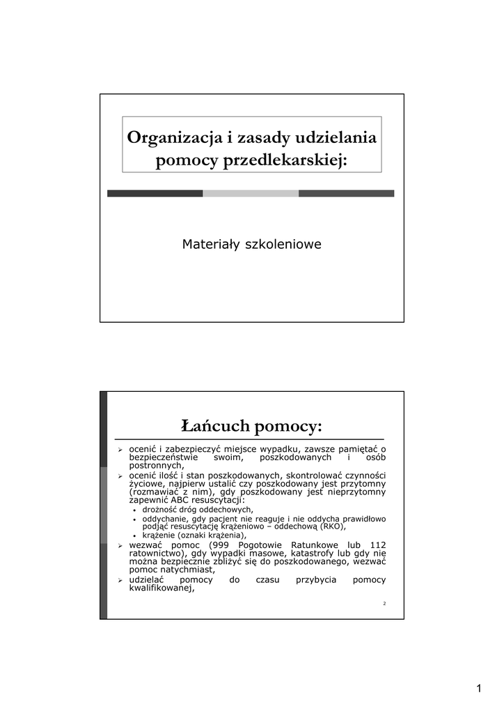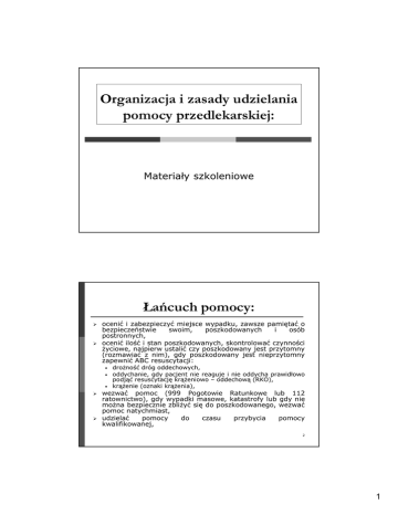 Organizacja i zasady udzielania pomocy przedlekarskiej: Materiały szkoleniowe Łańcuch pomocy: ocenić i zabezpieczyć miejsce wypadku, zawsze pamiętać o bezpieczeństwie swoim, poszkodowanych i osób postronnych, ocenić ilość i stan poszkodowanych, skontrolować czynności życiowe, najpierw ustalić czy poszkodowany jest przytomny (rozmawiać z nim), gdy poszkodowany jest nieprzytomny zapewnić ABC resuscytacji: • • • drożność dróg oddechowych, oddychanie, gdy pacjent nie reaguje i nie oddycha prawidłowo podjąć resuscytację krążeniowo – oddechową (RKO), krążenie (oznaki krążenia), wezwać pomoc (999 Pogotowie Ratunkowe lub 112 ratownictwo), gdy wypadki masowe, katastrofy lub gdy nie można bezpiecznie zbliżyć się do poszkodowanego, wezwać pomoc natychmiast, udzielać pomocy do czasu przybycia pomocy kwalifikowanej, 2 1 Ogólne zasady udzielania pierwszej pomocy: pozostać przy poszkodowanym i rozmawiać z nim, nie wpadać w panikę, zawsze można pocieszyć poszkodowanego, nigdy nie przenosić poszkodowanego bez ważnej przyczyny, zapewnić komfort termiczny, nie sprawiać dodatkowego bólu, zaproponować „oszczędzanie” sił, nie dawać poszkodowanemu nic do picia i jedzenia, przy udzielaniu pierwszej pomocy pamiętać o bezpieczeństwie swoim, poszkodowanego i osób znajdujących się w otoczeniu, katastrofy, wypadki masowe, wezwać pomoc3 zanim przystąpi się do działania, Omdlenia (chwilowa utrata świadomości): sprawdzić czy są drożne drogi oddechowe, sprawdzić czy pacjent oddycha, sprawdzić czy pacjent ma oznaki krążenia (ruch, kaszel, czy prawidłowo oddycha), unieś nogi do góry, zapewnić dopływ świeżego powietrza, gdy świadomość nie powraca, ale pacjent oddycha i ma oznaki krążenia, ułożyć go w pozycji bocznej ustalonej i wezwać pomoc, 4 2 Pozycja boczna ustalona (bezpieczna) 5 Sposób układania w pozycji bocznej ustalonej 6 3 Krwotok zewnętrzny, opatrywanie ran: ubrać rękawiczki zanim przystąpi się do udzielania pierwszej pomocy, mniejsze obrażenia może zaopatrzyć sobie sam poszkodowany, wystarczy podać środki opatrunkowe, w miejscu krwawienia, założyć opatrunek z gazy, bandaża, czystej tkaniny (bezpośrednio na rany nie wolno stosować waty i ligniny) i zaproponować konsultację lekarską, nie wolno stosować opaski uciskowej (z kabla, sznurówki, paska, linki…), gdy poszkodowany jest nieprzytomny, postępować jak w omdleniu, działać, wg 7 schematu ABC, Krwotok wewnętrzny i objawy wstrząsu: Poszkodowany jest zwykle blady, spocony, słaby, ma szybkie tętno i niskie ciśnienie krwi, czasami krew może się wydobywać z otworów naturalnych lub sytuacja (np. upadek z wysokości) wskazuje na możliwość urazu narządów wewnętrznych, krwotoku wewnętrznego nie jest się w stanie zatrzymać, należy jak najszybciej wezwać pomoc, tu bardzo liczy się czas, do czasu przybycia pomocy medycznej, postępować jak w omdleniu. 8 4 Poszkodowany nie oddycha: Resuscytacja krążeniowo – oddechowa Zespół czynności stosowanych u poszkodowanego, u którego wystąpiło podejrzenie nagłego zatrzymania krążenia, czyli ustanie czynności serca z utratą świadomości i bezdechem. 9 Poszkodowany nie oddycha: Resuscytacja krążeniowo – oddechowa Celem resuscytacji jest utrzymanie przepływu krwi przez mózg i mięsień sercowy oraz przywrócenie własnej czynności układu krążenia. Natychmiastowe rozpoczęcie resuscytacji przez świadków zdarzenia zwiększa przeżycie 3 – krotnie. 10 5 Poszkodowany nie oddycha: ułożyć poszkodowanego na wznak, drożność dróg oddechowych, wykonać sztuczne oddychanie metodą usta – usta lub usta – usta/nos z częstotliwością 1012 na minutę (używać w tym celu środków ochrony osobistej), wykonać zewnętrzne uciskanie mostka w jego dolnej części w tempie 100/minutę na głębokość 3,5 – 5 cm (u osoby dorosłej), zabiegi wymienione powyżej nazywa się podstawowym podtrzymywaniem życia (PPŻ=RKO) i wykonuje się je naprzemiennie: 30 uciśnięć mostka, 2 wdechy. zapewnić 11 Udrażnianie dróg oddechowych: 1. 2. 3. Należy odwrócić poszkodowanego na plecy. Umieścić jedną rękę na czole poszkodowanego i delikatnie odgiąć jego głowę. Opuszki palców drugiej ręki umieścić na żuchwie poszkodowanego, a następnie unieść ją. 12 6 Ocena oddechu: Należy przyłożyć ucho do ust poszkodowanego i jednocześnie obserwować ruchy klatki piersiowej przez 10 sekund. Tym sposobem można ocenić oddech za pomocą słuchu, wzroku i dotyku(odczuwanie ruchów powietrza na policzku). 13 Uciskanie klatki piersiowej: Uciskanie klatki piersiowej wykonuje się na przemiennie z oddechem w stosunku 30:2, tj. 30 uciśnięć na 2 oddechy: 1. Należy uklęknąć obok poszkodowanego. 2. Ułożyć dłoń jednej ręki na środki klatki piersiowej. 3. Dołożyć dłoń drugiej ręki na grzbiet ręki leżącej i utrzymać wyprost ramion. 4. Ustawić ramiona prostopadle do klatki piersiowej poszkodowanego. 5. Uciskać klatkę piersiową ciężarem własnego ciała na głębokość 5 cm. 6. Kontynuować uciskanie z częstością 100 - 120/min nie odrywając rąk od klatki piersiowej. 7. Uciskać 30 razy, a następnie wykonać 2 oddechy 14 ratownicze. 7 Oddechy ratownicze: 1. 2. 3. 4. 5. 6. Należy ponownie udrożnić drogi oddechowe. Zacisnąć skrzydełka nosa. Wziąć normalny wdech. Objąć szczelnie ustami usta poszkodowanego. Wdmuchać powietrze z normalnym natężeniem przez 1 sekundę, jednocześnie obserwując czy klatka piersiowa się porusza. Należy wykonać 2 wdechy, a następnie powrócić do uciskania klatki piersiowej w sekwencji 30:2. 15 Przerwanie: Odstawowe zabiegi resuscytacyjne BLS (Basic Life Support) można przerwać jedynie w sytuacji, kiedy poszkodowany zacznie reagować, oddychać lub się poruszać. W każdym innym przypadku należy kontynuować resuscytację aż do przybycia pomocy kwalifikowanej. 16 8 Poszkodowany nie oddycha: 17 Po