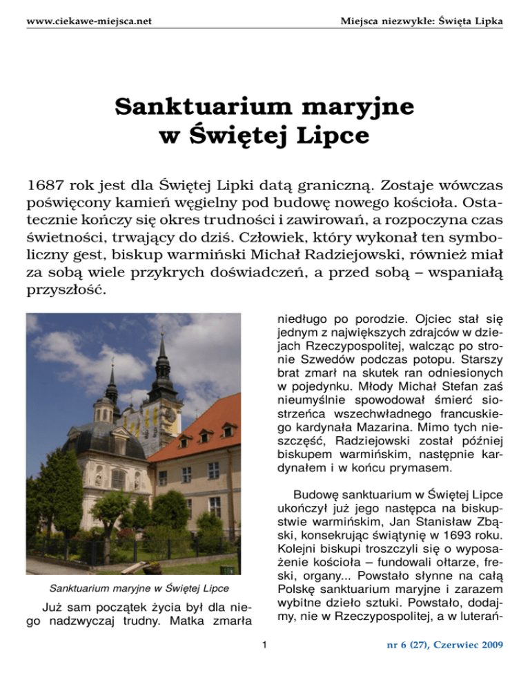www.ciekawe-miejsca.net Miejsca niezwykłe: Święta Lipka Sanktuarium maryjne w Świętej Lipce 1687 rok jest dla Świętej Lipki datą graniczną. Zostaje wówczas poświęcony kamień węgielny pod budowę nowego kościoła. Ostatecznie kończy się okres trudności i zawirowań, a rozpoczyna czas świetności, trwający do dziś. Człowiek, który wykonał ten symboliczny gest, biskup warmiński Michał Radziejowski, również miał za sobą wiele przykrych doświadczeń, a przed sobą – wspaniałą przyszłość. niedługo po porodzie. Ojciec stał się jednym z największych zdrajców w dziejach Rzeczypospolitej, walcząc po stronie Szwedów podczas potopu. Starszy brat zmarł na skutek ran odniesionych w pojedynku. Młody Michał Stefan zaś nieumyślnie spowodował śmierć siostrzeńca wszechwładnego francuskiego kardynała Mazarina. Mimo tych nieszczęść, Radziejowski został później biskupem warmińskim, następnie kardynałem i w końcu prymasem. Budowę sanktuarium w Świętej Lipce ukończył już jego następca na biskupstwie warmińskim, Jan Stanisław Zbąski, konsekrując świątynię w 1693 roku. Kolejni biskupi troszczyli się o wyposażenie kościoła – fundowali ołtarze, freski, organy... Powstało słynne na całą Polskę sanktuarium maryjne i zarazem wybitne dzieło sztuki. Powstało, dodajmy, nie w Rzeczypospolitej, a w luterań- Sanktuarium maryjne w Świętej Lipce Już sam początek życia był dla niego nadzwyczaj trudny. Matka zmarła 1 nr 6 (27), Czerwiec 2009 www.ciekawe-miejsca.net Miejsca niezwykłe: Święta Lipka Zgodnie więc z uświęconym prawem skazany „rzeźbiarz-amator” został uwolniony. Tak, jak nakazała mu Maria, zostawił figurkę na przydrożnej lipie. Wkrótce miejsce zaczęło słynąć cudami – ludzie odzyskiwali wzrok, zwierzęta mówiły ludzkim głosem. Mieszkańcy Kętrzyna postanowili więc znaleźć Matce Boskiej godniejsze miejsce w parafialnym kościele. Figurka jednak, mimo wielokrotnych prób przeniesienia jej, zawsze wracała na przydrożną lipę. Uznano więc, że tam właśnie należy wybudować kaplicę. Trudno dokładniej umiejscowić ten moment w czasie. Na pewno było to między 1374, a 1473 rokiem. skich Prusach Książęcych, 200 metrów od granicy z Koroną, jako ważny ośrodek misyjny zakonu jezuitów. Kaplice umieszczono dookoła świątyni Zanim na głęboko zatopionych w bagnistym podłożu palach zaczęto wznosić świątynię, na jej miejscu rósł gęsty las. Legenda mówi, że w pobliskim Kętrzynie pewien skazaniec oczekiwał na egzekucję. W nocy objawiła mu się Matka Boska i poleciła z kawałka drewna wyrzeźbić figurę. Więzień, choć rzeźbić nie umiał, wziął się do pracy i kiedy rano znaleziono przy nim piękną rzeźbę, uznano to za boską interwencję. W średniowieczu bowiem wierzono w tzw. ordalia, czyli sądy boże. Najczęściej były to próby wody lub ognia. W pierwszym przypadku związaną osobę wrzucano do wody i uznawano, że jeśli nie utonie będzie to boży znak wskazujący na jej niewinność. W próbie ognia kazano zmierzyć się z gorącą wodą, lub rozżarzonym żelazem i sprawdzano, czy podejrzany nie został poparzony. W przypadku skazańca z Kętrzyna pomoc Matki Boskiej objawiła się w mniej dramatyczny sposób. Wspaniała barokowa krata wprowadza na teren sanktuarium Podczas reformacji w Prusach podjęto walkę z katolicyzmem. Kaplicę zburzono, a na jej miejscu postawiono szubienicę. Trudno o dosadniejsze ostrzeżenie dla pielgrzymów. Wielu z nich pewnie widziało jakąś publiczną egzekucję. Wisielców zostawiano na widok publiczny, by ich trupy przypominały żywym o nieuchronności kary za przestępstwa. Figurkę Matki Boskiej wyrzucono do jeziora, a lipę ścięto. Ośrodek kultu odrodził się, kiedy sekretarz Zygmunta 2 nr 6 (27), Czerwiec 2009 www.ciekawe-miejsca.net Miejsca niezwykłe: Święta Lipka wykonaniem tego zamówienia zmienił pod wpływem jezuitów ze Świętej Lipki wyznanie z luterańskiego na katolickie. III Wazy Stefan Sadorski odkupił w 1619 roku teren, na którym stała kaplica. Nie było to łatwe, pomogło dopiero poparcie króla, królowej i królewicza Władysława Zygmunta (późniejszego Władysława IV). Na prawdziwe odrodzenie Świętej Lipki trzeba było jednak jeszcze trochę poczekać, do 1687 roku. Ołtarz o trzech (!) kondygnacjach zachwyca rozmiarami, wykonaniem poszczególnych rzeźb już zdecydowanie mniej. Trudno jednak przy tak ogromnym przedsięwzięciu nie popaść w schematyzm i pewną zdawkowość. Peucker wyrzeźbił również kilka bocznych ołtarzy i ambonę, pozostałe ołtarze to dzieło jego mistrza – Jana Döbla.. Döbel, wyrzeźbiwszy w Świętej Lipce cztery boczne ołtarze i konfesjonały, wyjechał do Berlina. Do ukończenia prac jezuici wezwali Peuckera. Rzeźby, i to najwyższej klasy, znajdują się także na zewnątrz kościoła. Krużganki i nisze fasady dekorowane są figurami dłuta Tyrolczyka Christopha Perwangera (z lat 40. XVIII wieku). Był on starszym cechu warzelników piwa, burmistrzem Tolkmicka, a oprócz tego bardzo zdolnym rzeźbiarzem, mającym prawdziwy dar tworzenia postaci malowniczych, ekspresyjnych i zarazem pełnych wdzięku. Iluzjonistyczne freski - rzadkość na Warmii W Świętej Lipce nie mogło zabraknąć również figury Matki Boskiej na drzewie lipy. Znajduje się ona w samym centrum drugiej kondygnacji fasady, pod wygiętym gzymsem. Powstała w latach 40. XVIII wieku, prawdopodobnie wykonał ją kolejny warmiński artysta – Jan Chrystian Schmidt. I na tym nazwisku przegląd rzeźbiarzy działających w Świętej Lipce można chyba zakończyć. Twórca figury w srebrnej sukience, znajdującej się wewnątrz świątyni, jest bowiem anonimowy. Wiemy tyl- Powstała dwuwieżowa, malownicza świątynia, o dynamicznej fasadzie. Budował ją Wilnianin Jerzy Ertli, ale nie wiadomo, czy on też sporządzał plany. Jest to dość wątpliwe, znamy go bowiem jed