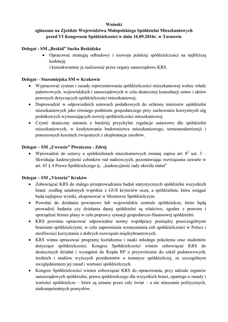 Wnioski zgłaszane na Zjeździe Województwa Małopolskiego Spółdzielni Mieszkaniowych przed VI Kongresem Spółdzielczości w dniu 16.09.2016r. w Tarnowie Delegat - SM „Beskid” Sucha Beskidzka Opracować strategię odbudowy i rozwoju polskiej spółdzielczości na najbliższą kadencję i konsekwentnie ja realizować przez organy samorządowe KRS. Delegat – Staromiejska SM w Krakowie Wypracować system i zasady reprezentowania spółdzielczości mieszkaniowej wobec władz państwowych, wojewódzkich i samorządowych w celu skutecznej konsultacji ustaw i aktów prawnych dotyczących spółdzielczości mieszkaniowej. Doprowadzić w odpowiednich ustawach podatkowych do ochrony interesów spółdzielni mieszkaniowych jako równego podmiotu gospodarczego przy zachowaniu korzystnych ulg podatkowych wymuszających rozwój spółdzielczości mieszkaniowej. Czynić skuteczne starania o bardziej przychylne regulacje ustawowe dla spółdzielni mieszkaniowych, w kredytowaniu budownictwa mieszkaniowego, termomodernizacji i ponoszonych kosztach związanych z eksploatacja zasobów. Delegat – SM „Uwrocie” Piwniczna - Zdrój Wprowadzić do ustawy o spółdzielniach mieszkaniowych zmianę zapisu art. 82 ust. 3 – likwidując kadencyjność członków rad nadzorczych, pozostawiając rozwiązania zawarte w art. 45 § 4 Prawa Spółdzielczego tj.: „kadencyjność rady określa statut” Delegat – SM „Victoria” Kraków Zobowiązać KRS do stałego przeprowadzania badań statystycznych spółdzielni wszystkich branż ,według ustalonych wspólnie z GUS kryteriów ocen, a spółdzielnie, które osiągać będą najlepsze wyniki, eksponować w Monitorze Spółdzielczym. Powołać do działania powiatowe lub wojewódzkie centrale spółdzielcze, które będą prowadzić badania czy działania danej spółdzielni są właściwe, zgodne z prawem i sporządzać biznes plany w celu poprawy sytuacji gospodarczo-finansowej spółdzielni. KRS powinna opracować odpowiednie normy współpracy pomiędzy poszczególnymi branżami spółdzielczymi, w celu zapewnienia wzmocnienia roli spółdzielczości w Polsce i możliwości korzystania z dobrych rozwiązań międzybranżowych. KRS winna opracować programy kształcenia i nauki młodego pokolenia oraz studentów dotyczące spółdzielczości. Kongres Spółdzielczości winien zobowiązać KRS do skutecznych działań i wystąpień do Rządu RP o przywrócenie do szkół podstawowych, średnich i studiów wyższych przedmiotów o tematyce spółdzielczej, ze szczególnym uwzględnieniem jej zasad i wartości spółdzielczych. Kongres Spółdzielczości winien zobowiązać KRS do opracowania, przy udziale organów samorządowych spółdzielni, prawa spółdzielczego dla wszystkich branż, opartego o zasady i wartości spółdzielcze – które są uznane przez cały świat – a nie mieszanie politycznych, niekompetentnych pomysłów. Delegat – Rabczańska SMLW Rabka – Zdrój Kongres Spółdzielczości zobowiąże KRS do podejmowania skutecznych działań uwiarygodniając spółdzielczość na rzecz pozyskania środków z UE i NFOŚ i GW tak w kraju jak i w województwach. KRS wystąpi do ustawodawcy o wprowadzenie do odpowiednich ustaw zapisów, które skutecznie doprowadzą do odzyskania poniesionych nakładów na termomodernizację w postaci obniżenia opodatkowania przy kolejnych działaniach ograniczenia niskiej emisji lub poprawy warunków energetycznych zasobów spółdzielni. Delegat – SM „Hutnik” Kraków KRS opracuje dla wszystkich branż spółdzielczych zasady służące integracji ruchu spółdzielczego, które będą służyć rozwojowi spółdzielczości w Polsce. Delegat – SM „Śnieżka” Kraków W celu budowy tanich, dostępnych dla każdego obywatela mieszkań należy wypracować zasady pozyskiwania „tanich kredytów mieszkaniowych”. Z takim wnioskiem KRS winna wystąpić do ustawodawcy. Delegat – SM „Podwawelska” Kraków Zgłoszony wniosek 1 i 2 – został zapisany we wnioskach wcześniejszych i wiąże się ze zmianą przepisów prawa spółdzielczego wyżej opisanych. Wniosek 3 dotyczy opracowania kodeksu etyki spółdzielczej – jest nieaktualny bo taki Kodeks został uchwalony przez ZO KRS w 2014r. Delegat – Grodzkiej SM w Nowym Sączu Spowodować aby sm mogły korzystać ze środków unijnych na montaż urządzeń do podgrzewania wody oraz termomodernizację budynków będących w eksploatacji sm. Doprowadzić do unowocześnienia prawa dotyczącego spółdzielczości i spółdzielni mieszkaniowych. Informujemy, że wszystkie wnioski zgłoszone do Komisji Uchwał i Wniosków zostały przekazane w oryginale do KRS w Warszawie. Przedstawione wyżej wnioski dopracowane pod względem merytorycznym, prawnym i stylistycznym obejmują wszystkie wnioski zgłoszone przez delegatów na Zjazd Wojewódzki spółdzielni mieszkaniowych województwa małopolskiego w dniu 16.09.2016r. Zarząd MZRSM w Tarnowie zgodnie z upoważnieniem Zjazdu.