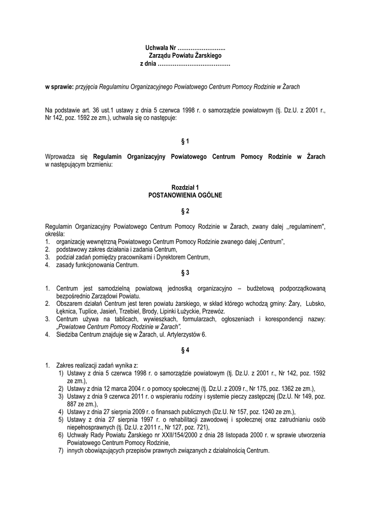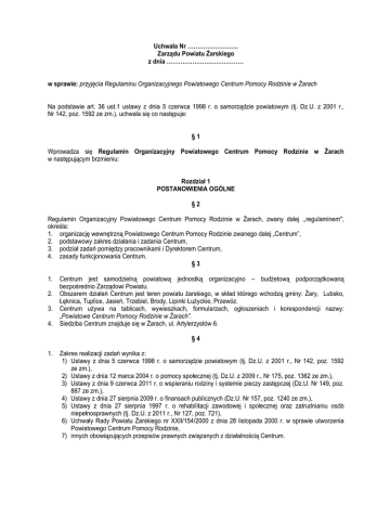 Uchwała Nr …………………….. Zarządu Powiatu Żarskiego z dnia ………………………………… w sprawie: przyjęcia Regulaminu Organizacyjnego Powiatowego Centrum Pomocy Rodzinie w Żarach Na podstawie art. 36 ust.1 ustawy z dnia 5 czerwca 1998 r. o samorządzie powiatowym (tj. Dz.U. z 2001 r., Nr 142, poz. 1592 ze zm.), uchwala się co następuje: §1 Wprowadza się Regulamin Organizacyjny Powiatowego Centrum Pomocy Rodzinie w Żarach w następującym brzmieniu: Rozdział 1 POSTANOWIENIA OGÓLNE §2 Regulamin Organizacyjny Powiatowego Centrum Pomocy Rodzinie w Żarach, zwany dalej ,,regulaminem'', określa: 1. organizację wewnętrzną Powiatowego Centrum Pomocy Rodzinie zwanego dalej „Centrum”, 2. podstawowy zakres działania i zadania Centrum, 3. podział zadań pomiędzy pracownikami i Dyrektorem Centrum, 4. zasady funkcjonowania Centrum. §3 1. Centrum jest samodzielną powiatową jednostką organizacyjno – budżetową podporządkowaną bezpośrednio Zarządowi Powiatu. 2. Obszarem działań Centrum jest teren powiatu żarskiego, w skład którego wchodzą gminy: Żary, Lubsko, Łęknica, Tuplice, Jasień, Trzebiel, Brody, Lipinki Łużyckie, Przewóz. 3. Centrum używa na tablicach, wywieszkach, formularzach, ogłoszeniach i korespondencji nazwy: „Powiatowe Centrum Pomocy Rodzinie w Żarach”. 4. Siedziba Centrum znajduje się w Żarach, ul. Artylerzystów 6. §4 1. Zakres realizacji zadań wynika z: 1) Ustawy z dnia 5 czerwca 1998 r. o samorządzie powiatowym (tj. Dz.U. z 2001 r., Nr 142, poz. 1592 ze zm.), 2) Ustawy z dnia 12 marca 2004 r. o pomocy społecznej (tj. Dz.U. z 2009 r., Nr 175, poz. 1362 ze zm.), 3) Ustawy z dnia 9 czerwca 2011 r. o wspieraniu rodziny i systemie pieczy zastępczej (Dz.U. Nr 149, poz. 887 ze zm.), 4) Ustawy z dnia 27 sierpnia 2009 r. o finansach publicznych (Dz.U. Nr 157, poz. 1240 ze zm.), 5) Ustawy z dnia 27 sierpnia 1997 r. o rehabilitacji zawodowej i społecznej oraz zatrudnianiu osób niepełnosprawnych (tj. Dz.U. z 2011 r., Nr 127, poz. 721), 6) Uchwały Rady Powiatu Żarskiego nr XXII/154/2000 z dnia 28 listopada 2000 r. w sprawie utworzenia Powiatowego Centrum Pomocy Rodzinie, 7) innych obowiązujących przepisów prawnych związanych z działalnością Centrum. §5 W Centrum obowiązuje instrukcja kancelaryjna, jednolity rzeczowy wykaz akt określony rozporządzeniem Prezesa Rady Ministrów z dnia 18 grudnia 1998 r. w sprawie instrukcji kancelaryjnej dla organów powiatu (Dz.U. Nr 160, poz. 1074 ze zm.) oraz ustawa z dnia 29 sierpnia 1997 r. o ochronie danych osobowych (Dz.U. z 1997 r. Nr 133, poz. 883 ze zm.). §6 1. Centrum działa według następujących zasad: 1) praworządności, 2) służebności wobec społeczności lokalnej, 3) racjonalnego gospodarowania mieniem publicznym, 4) planowania pracy, 5) kontroli wewnętrznej, 6) podziału zadań pomiędzy kierownictwo Centrum, poszczególne działy i stanowiska. Rozdział 2 ZADANIA POWIATOWEGO CENTRUM POMOCY RODZINIE §7 1. Powiatowe Centrum wykonuje zadania powiatu żarskiego w zakresie pomocy społecznej, wspierania rodziny i pieczy zastępczej. Zadania te realizowane są w szczególności przez: 1) opracowanie i realizacja powiatowej strategii rozwiązywania problemów społecznych, ze szczególnym uwzględnieniem programów pomocy społecznej, wspierania osób niepełnosprawnych i innych, których celem jest integracja osób i rodzin z grup szczególnego ryzyka- po konsultacji z właściwymi terytorialnie gminami, 2) prowadzenie specjalistycznego poradnictwa, 3) opracowanie i realizacja 3-letnich powiatowych programów dotyczących rozwoju pieczy zastępczej, zawierających między innymi coroczny limit rodzin zastępczych zawodowych, 4) zapewnienie dzieciom pieczy zastępczej w rodzinach zastępczych, rodzinnych domach dziecka oraz w placówkach opiekuńczo-wychowawczych, 5) organizowanie wsparcia osobom usamodzielnianym opuszczającym rodziny zastępcze, rodzinne domy dziecka oraz placówki opiekuńczo-wychowawcze i regionalne placówki opiekuńczo-terapeutyczne, przez wspieranie procesu usamodzielnienia, 6) tworzenie warunków do powstawania i działania rodzin zastępczych, rodzinnych domów dziecka i rodzin pomocowych, 7) prowadzenie placówek opiekuńczo-wychowawczych oraz placówek wsparcia dziennego o zasięgu ponadgminnym, 8) organizowanie szkoleń dla rodzin zastępczych, prowadzących rodzinne domy dziecka, rodzin pomocowych i dyrektorów placówek opiekuńczo-wychowawczych typu rodzinnego oraz kandydatów do pełnienia funkcji rodziny zastępczej, prowadzenia rodzinnego domu dziecka lub pełnienia funkcji dyrektora placówki opiekuńczo-wychowawczej typu rodzinnego, 9) organizowanie wsparcia dla rodzinnej pieczy zastępczej, w szczególności przez tworzenie warunków do powstawania: a) grup wsparcia, b) specjalistycznego poradnictwa, 10) powoływanie centrów administracyjnych do obsługi placówek opiekuńczo-wychowawczych, 11) zapewnienie przeprowadzenia przyjętemu do pieczy zastępczej dziecku niezbędnych badań lekarskich, 12) kompletowanie we współpracy z właściwym ośrodkiem pomocy społecznej dokumentacji związanej z przygotowaniem dziecka do umieszczenia w rodzinie zastępczej albo rodzinnym domu dziecka, 13) finansowanie: a) świadczeń pieniężnych dotyczących dzieci z terenu powiatu, umieszczonych w rodzinach zastępczych, rodzinnych domach dziecka, placówkach opiekuńczo-wychowawczych, regionalnych placówkach opiekuńczo-terapeutycznych, interwencyjnych ośrodkach preadopcyjnych lub rodzinach pomocowych, na jego terenie lub na terenie innego powiatu, 14) 15) 16) 17) 18) 19) 20) 21) 22) 23) 24) 25) 26) 27) b) pomocy przyznawanej osobom usamodzielnianym opuszczającym rodziny zastępcze, rodzinne domy dziecka, placówki opiekuńczo-wychowawcze lub regionalne placówki opiekuńczoterapeutyczne, c) szkoleń dla kandydatów do pełnienia funkcji rodziny zastępczej, prowadzenia rodzinnego domu dziecka lub pełnienia funkcji dyr