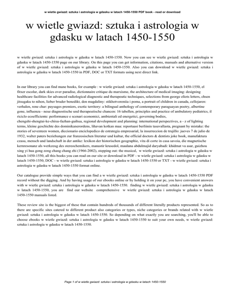 w wietle gwiazd: sztuka i astrologia w gdasku w latach 1450-1550 PDF book - read or download w wietle gwiazd: sztuka i astrologia w gdasku w latach 1450-1550 w wietle gwiazd: sztuka i astrologia w gdasku w latach 1450-1550. Now you can see w wietle gwiazd: sztuka i astrologia w gdasku w latach 1450-1550 page on our library. On this page you can get information, citations, manuals and alternative version of w wietle gwiazd: sztuka i astrologia w gdasku w latach 1450-1550. Also you can download w wietle gwiazd: sztuka i astrologia w gdasku w latach 1450-1550 in PDF, DOC or TXT formats using next direct link. In our library you can find mane books, for example : w wietle gwiazd: sztuka i astrologia w gdasku w latach 1450-1550, el fitxer escolar, dark skies over paradise, dictionnaire critique du marxisme, the architecture of medical imaging: designing healthcare facilities for advanced radiological diagnostic and therapeutic techniques, selections from george eliots letters, chsen jitsugaku to nihon, lieber bruder benedikt, den magdaliny: stikhotvoreniia i poma, a portrait of children in canada, cellojaren: verhalen, rene char: paysages premiers, exotic territory: a bilingual anthology of contemporary paraguayan poetry, albertine gone, influenza - neue diagnostische und therapeutische chancen: 16 tabellen, principles and practice of ambulatory pediatrics, il riciclo ecoefficiente: performance e scenari economici, ambientali ed energetici, governing bodies, chengshi-shengtai-ke-chixu-fazhan-guihua, regional development and planning: international perspectives, a - z of lighting terms, kleine geschichte des dominikanerordens, lihavan kotkan maa: reportaasi berliinin tasavallasta, pregnant by mistake: the stories of seventeen women, diccionario enciclopedico de estrategia empresarial, la insurreccion de trujillo: jueves 7 de julio de 1932, walter paters beziehungen zur franzosischen literatur und kultur, the official doctors & dentists joke book, manufaktura czasu, mensch und landschaft in der antike: lexikon der historischen geographie, vita di corte in casa savoia, die magnetische kernresonanz als werkzeug des stereochemikers, manastir krusedol, maulana abdulmajid daryabadi: khidmat va asar, guizhou xing yi hua gong zong chang chang zhi (1966-2002), stepping out: the musical, w wietle gwiazd: sztuka i astrologia w gdasku w latach 1450-1550, all this books you can read on our site or download in PDF - w wietle gwiazd: sztuka i astrologia w gdasku w latach 1450-1550, DOC - w wietle gwiazd: sztuka i astrologia w gdasku w latach 1450-1550 or TXT - w wietle gwiazd: sztuka i astrologia w gdasku w latach 1450-1550 format online. Our catalogue provide simple ways that you can find a w wietle gwiazd: sztuka i astrologia w gdasku w latach 1450-1550 PDF record without the digging. And by having usage of our ebooks online or by holding it on your pc, you have convenient answers with w wietle gwiazd: sztuka i astrologia w gdasku w latach 1450-1550. finding w wietle gwiazd: sztuka i astrologia w gdasku w latach 1450-1550, you are find our website comprehensive w wietle gwiazd: sztuka i astrologia w gdasku w latach 1450-1550 manuals listed. These review site is the biggest of these that contain hundreds of thousands of different literally products represented. So as to there are specific sites catered to different product also categories or types, niche categories or brands related with w wietle gwiazd: sztuka i astrologia w gdasku w latach 1450-1550. So depending on what exactly you are searching, you'll be able to choose ebooks w wietle gwiazd: sztuka i astrologia w gdasku w latach 1450-1550 to suit your own needs, w wietle gwiazd: sztuka i astrologia w gdasku w latach 1450-1550. Page 1 of w wietle gwiazd: sztuka i astrologia w gdasku w latach 1450-1550