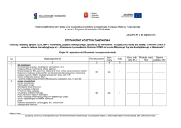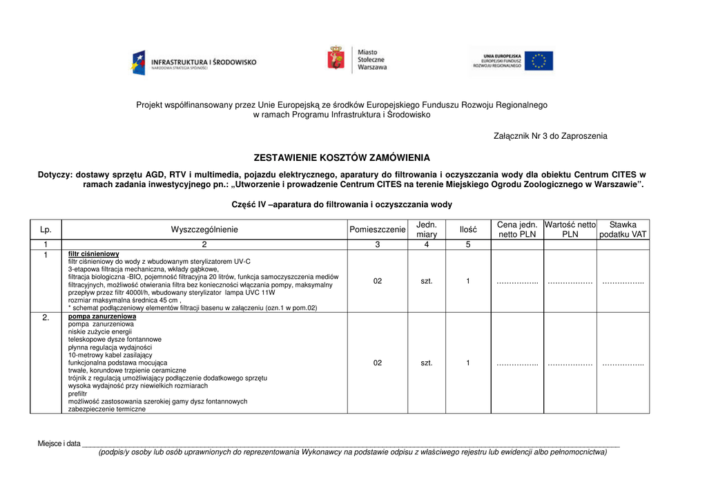 Projekt współfinansowany przez Unie Europejsk ze rodków Europejskiego Funduszu Rozwoju Regionalnego w ramach Programu Infrastruktura i rodowisko Zał cznik Nr 3 do Zaproszenia ZESTAWIENIE KOSZTÓW ZAMÓWIENIA Dotyczy: dostawy sprz tu AGD, RTV i multimedia, pojazdu elektrycznego, aparatury do filtrowania i oczyszczania wody dla obiektu Centrum CITES w ramach zadania inwestycyjnego pn.: „Utworzenie i prowadzenie Centrum CITES na terenie Miejskiego Ogrodu Zoologicznego w Warszawie”. Cz Lp. 1 1 2. IV –aparatura do filtrowania i oczyszczania wody Stawka Cena jedn. Warto netto PLN podatku VAT netto PLN Wyszczególnienie Pomieszczenie 2 3 Jedn. miary 4 02 szt. 1 …………….. ……………… …………….. 02 szt. 1 …………….. ……………… …………….. filtr ci nieniowy filtr ci nieniowy do wody z wbudowanym sterylizatorem UV-C 3-etapowa filtracja mechaniczna, wkłady g bkowe, filtracja biologiczna -BIO, pojemno filtracyjna 20 litrów, funkcja samoczyszczenia mediów filtracyjnych, mo liwo otwierania filtra bez konieczno ci wł czania pompy, maksymalny przepływ przez filtr 4000l/h, wbudowany sterylizator lampa UVC 11W rozmiar maksymalna rednica 45 cm , * schemat podł czeniowy elementów filtracji basenu w zał czeniu (ozn.1 w pom.02) pompa zanurzeniowa pompa zanurzeniowa niskie zu ycie energii teleskopowe dysze fontannowe płynna regulacja wydajno ci 10-metrowy kabel zasilaj cy funkcjonalna podstawa mocuj ca trwałe, korundowe trzpienie ceramiczne trójnik z regulacj umo liwiaj cy podł czenie dodatkowego sprz tu wysoka wydajno przy niewielkich rozmiarach prefiltr mo liwo zastosowania szerokiej gamy dysz fontannowych zabezpieczenie termiczne Ilo 5 Miejsce i data ________________________________________________________________________________________________________________________________________ (podpis/y osoby lub osób uprawnionych do reprezentowania Wykonawcy na podstawie odpisu z wła ciwego rejestru lub ewidencji albo pełnomocnictwa) 3. 4. 5. 6. 7. maksymalny przepływ 3300 l/h moc: 40 W wej cie ¾ cala, wyj cie ¾ cala * schemat podł czeniowy elementów filtracji basenu w zał czeniu (ozn.2 w pom.02) Podgrzewacz elektryczny z zabezpieczeniem termicznym Podgrzewacz elektryczny z zabezpieczeniem termicznym (0-45oC ) oraz brakiem przepływu wody. Obudowa z tworzywa, wkład grzałki ze stali kwasoodpornej. Przył cza wodne 1,5’’. Regulacja temp wody odbywa si za po rednictwem niezale nego regulatora temperatury. Temperatura otoczenia: - 10° do + 60° C Zasilanie 380V, moc 3kW, klasa ochrony IP40, wymiary 32X14X12 cm (+/- 2cm) * schemat podł czeniowy elementów filtracji basenu w zał czeniu (ozn.3 w pom.02) regulator temperatury Elektroniczny regulator temperatury, zakres pomiarowy 0-45 oC. Wy wietlacz LCD wskazuje temperatur mierzonej wody. Zmiana nastawionej temperatury odbywa si za po rednictwem potencjometru na obudowie urz dzenia. Przez kilka sekund jest widoczna nastawiona temperatura. Długo przewodu czujnika temp 1,5m z mo liwo ci przedłu enia do 10m (2x0,75 mm2). Wymiary: 14 x 12,5 x 8,5 cm (+/- 1cm) Zasilanie: 230 V/50 Hz Pobór mocy: 1,5 W Przeka nik: max 2,2 kW Klasa ochrony: IP 40 Temperatura otoczenia: - 10° do + 60° C* schemat podł czeniowy elementów filtracji basenu w zał czeniu(ozn.4 w pom.02) czujnik przylgowy temperatury Pt 1000 na przewodzie Dzxg 63x10,5 zaciski elektryczne 2, zakres temperatury 0-110stC klasa ochrony IP54 *schemat podł czeniowy elementów filtracji basenu w zał czeniu (ozn.5 w pom.02 Filtr zewn trzny z pomp (utrzymuj cy parametry wody w basenach zewn trznych ółwi) pobór mocy (maks.) 18 W Kolor Czarny Wydajno zasilania 600 l/h (+/- 100l) Wymiary (DxSxW) 310 x 100 x 95 mm (+/- 10cm) Napi cie robocze 230 V/50 Hz Długo minimalna kabla 10 m Dalsze dane techniczne Gł boko zanurzenia: maks. 2 m • Temperatura wody: maks. 35°C 02 szt. 1 …………….. ……………… …………….. 02 szt. 1 …………….. ……………… …………….. 02 szt. 1 …………….. ……………… …………….. 06 szt. 2 …………….. ……………… …………….. 08 szt. 1 …………….. ……………… …………….. Urz dzenie osmotyczne do oczyszczania wody dla płazów Urz dzenie zbudowane na tradycyjnych wkładach 10". Pi etapów filtracji wody: 1. Wkład wst pnego oczyszczania - 5 mikron 2. Wkład w glowy z w gla aktywnego Miejsce i data ________________________________________________________________________________________________________________________________________ (podpis/y osoby lub osób uprawnionych do reprezentowania Wykonawcy na podstawie odpisu z wła ciwego rejestru lub ewidencji albo pełnomocnictwa) 2 3. Wkład dokładnego oczyszczania - 1 mikron 4. Membrana molekularna TFC 400 GPD 5. Wkład liniowy z w gla drzewnego orzechów kokosowych Zastosowana membrana osmotyczna o wydajno ci 400 gpd (ok. 1400 litrów/doba) zapewnia czyst i smaczn wod . Wszystkie poł czenia z zastosowaniem nowej generacji bezpiecznych szybko-zł czek typu JG z zabezpieczeniami. W zestawie nie ma potrzeby stosowania zbiornika magazynuj cego czyst wod . produkuje wod na bie co - po odkr ceniu kranu wody czystej. wyposa ony jest w pomp podnosz c i reguluj c ci nienie wody, zaawansowan elektronik steruj c procesem uzdatniania wody. Wymiary urz dzenia: wysoko : 46 cm szeroko : 41 cm gł boko : 19,5 cm Wymiary wylewki: wysoko : 23 cm szeroko : 14,5 cm Min. temperatura wody zasilaj cej: 2' C Max. temperatura wody: 40' C Ci nienie minimalne: 1,5 bara Ci nienie max: 6,0 bar Wydajno max: 1440 litrów na dob (zale y od jako ci wody) Membrana: 400 GPD Niezb dne zasilanie elektryczne. Wydajno : Realna, testowana wydajno systemu to 1 litr wody uzyskany w ci gu 1,1 minuty. Ci gła RAZEM NETTO x KWOTA PODATKU VAT x RAZEM BRUTTO x Miejsce i data ________________________________________________________________________________________________________________________________________ (podpis/y osob