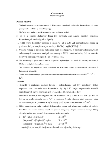Ćwiczenie 8 Przykładowe pytania Pytania opisowe 1. Wyjaśnij pojęcie termodynamicznej i kinetycznej trwałości związków kompleksowych oraz podaj wielkości które je charakteryzują. 2. Zdefiniuj oraz podaj czynniki wpływające na szybkość reakcji. 3. Co to są ligandy chelatowe? Podaj trzy przykłady oraz narysuj struktury związków kompleksowych zawierających te ligandy. 4.. Fe(III) tworzy kompleksy zarówno z jonami Cl- jak i SCN-. Jak doświadczalnie można się przekonać, który z kompleksów jest trwalszy: [Fe(Cl)4]- czy [Fe(SCN)6] 3- ? 5. Wyjaśnij różnicę w położeniu maksimum pasm absorbcyjnych, w zakresie widzialnym, widm elektronowych roztworów wodnych zawierających Ni(II) i etylenodiaminę (en) w stosunku molowym zmieniającym się od 1:1 do 1:4 (Ni(II) : en). 6. Na konkretnych przykładach omów czynniki wpływające na trwałość termodynamiczną i labilność związków kompleksowych. 7. Jak zmienia się stopniowa stała trwałości ze wzrostem liczby podstawionych ligandów ? Odpowiedź uzasadnij. 8. Omów reakcje zachodzące pomiędzy etylenodiaminą (en) i wodnymi roztworami Ni2+, Cu2+ i Cr3+. Zadania 1. Nikiel(II) w roztworze wodnym tworzy z etylenodiaminą (en) trzy kompleksy. Oblicz stopniowe stałe tworzenia tych kompleksów K1, K2 i K3 znając odpowiednie wartości skumulowanych stałych tworzenia lg β1 = 7,3, lg β2 = 13,4 oraz lg β3 = 17,7. 2. Zmieszano ze sobą równe objętości 0,1 M roztworów FeCl3 i KSCN oraz FeCL3 i KF. W którym przypadku stężenie jonów Fe3+ w roztworze będzie większe, jeżeli stopniowe stałe tworzenia kompleksu [Fe(H2O)5SCN]2- i [Fe(H2O)5F]2- wynoszą odpowiednio 102 i 106? 3. Oblicz skumulowaną stałą trwałości β3 kompleksu znając stałe równowagi poniższych reakcji. Przedstaw obliczenia podając wynik w postaci potęgowej. Zapisz równanie reakcji, której odpowiada obliczona wartość skumulowanej stałej tworzenia a) Fe2+ + phen = [Fe(phen)]2+ K1= 105,9 [Fe(phen)2]2+ = [Fe(phen)]2+ + phen K2 = 10-5,2 [Fe(phen)3]2+ = [Fe(phen)2]2+ + phen K3= 10-10,2 wyjaśnij który z kompleksów jest termodynamicznie najtrwalszy i dlaczego ? b) Ag+ + S2O32- = [Ag(S2O3)]- K1= 107,4 [Ag(S2O3)]- + S2O32- = [Ag(S2O3)2]3- K2= 105,4 [Ag(S2O3)3]5- = [Ag(S2O3)2]3- + S2O32- K3= 10-0,2 Jak zmieniają się obserwowane stopniowe stałe tworzenia i dlaczego ? 4. Oblicz skumulowaną stałą trwałości β4 kompleksu znając stałe równowagi poniższych reakcji. Przedstaw obliczenia podając wynik w postaci potęgowej. Zapisz równanie reakcji, której odpowiada obliczona wartość skumulowanej stałej tworzenia. Jak zmieniają się obserwowane stopniowe stałe tworzenia i dlaczego ? Cd2+ + CN- = [Cd(CN)]+ K1=105,48 [Cd(CN)]+ + CN- = [Cd(CN)2] K2=105,12 [Cd(CN)2] + CN- = [Cd(CN)3]- K3=104,63 [Cd(CN)4]2- = [Cd(CN)3]- + CN- K4=10-3,65 a) b) Cd2+ + NH3 = [Cd(NH3)]2+ K1=102,65 [Cd(NH3)2]2+ = [Cd(NH3)]2+ + NH3 K2 = 10-2,10 [Cd(NH3)3]2+ = [Cd(NH3)2]2+ + NH3 K3= 10-1,44 [Cd(NH3)3]2+ + NH3 = [Cd(NH3)4]2+ K4 = 100,93 5. Zmieszano ze sobą 100 cm3 roztworu zawierającego 0,03 molowy Cu2+ i 0,03 molową etylenodiaminę z 200 cm3 roztworu zawierającego 0,15 molowy Cu2+ i 0,15 molową etylenodiaminę. Oblicz stężenia równowagowe substancji znajdujących się w roztworze, zakładając tworzenie się tylko jednego kompleksu, dominującego w tych warunkach. lg K1 =10,55, lg K2 = 9,05. 6. Jak należy zmienić temperaturę syntezy K3[Fe(CN)6] prowadzonej w temp 298 K, aby zwiększyć wydajność reakcji, wiedząc że dla tej reakcji ∆Go = -149,4 kJ/mol a ∆So = 349,3 J/(K mol)? Odpowiedź uzasadnij podając odpowiednie równania termodynamiczne.