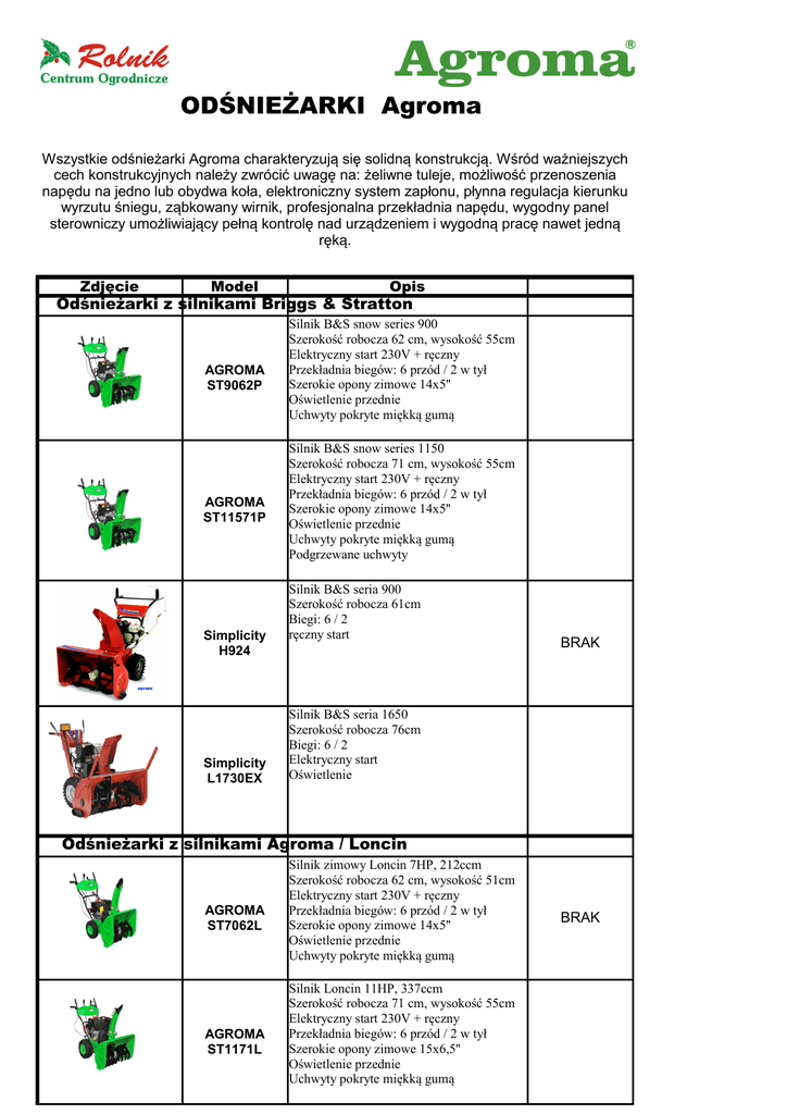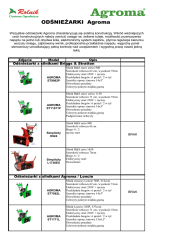 ODŚNIEŻARKI Agroma Wszystkie odśnieżarki Agroma charakteryzują się solidną konstrukcją. Wśród ważniejszych cech konstrukcyjnych należy zwrócić uwagę na: żeliwne tuleje, możliwość przenoszenia napędu na jedno lub obydwa koła, elektroniczny system zapłonu, płynna regulacja kierunku wyrzutu śniegu, ząbkowany wirnik, profesjonalna przekładnia napędu, wygodny panel sterowniczy umożliwiający pełną kontrolę nad urządzeniem i wygodną pracę nawet jedną ręką. Zdjęcie Model Opis Odśnieżarki z silnikami Briggs & Stratton AGROMA ST9062P AGROMA ST11571P Simplicity H924 Simplicity L1730EX Silnik B&S snow series 900 Szerokość robocza 62 cm, wysokość 55cm Elektryczny start 230V + ręczny Przekładnia biegów: 6 przód / 2 w tył Szerokie opony zimowe 14x5'' Oświetlenie przednie Uchwyty pokryte miękką gumą Silnik B&S snow series 1150 Szerokość robocza 71 cm, wysokość 55cm Elektryczny start 230V + ręczny Przekładnia biegów: 6 przód / 2 w tył Szerokie opony zimowe 14x5'' Oświetlenie przednie Uchwyty pokryte miękką gumą Podgrzewane uchwyty Silnik B&S seria 900 Szerokość robocza 61cm Biegi: 6 / 2 ręczny start BRAK Silnik B&S seria 1650 Szerokość robocza 76cm Biegi: 6 / 2 Elektryczny start Oświetlenie Odśnieżarki z silnikami Agroma / Loncin AGROMA ST7062L AGROMA ST1171L Silnik zimowy Loncin 7HP, 212ccm Szerokość robocza 62 cm, wysokość 51cm Elektryczny start 230V + ręczny Przekładnia biegów: 6 przód / 2 w tył Szerokie opony zimowe 14x5'' Oświetlenie przednie Uchwyty pokryte miękką gumą Silnik Loncin 11HP, 337ccm Szerokość robocza 71 cm, wysokość 55cm Elektryczny start 230V + ręczny Przekładnia biegów: 6 przód / 2 w tył Szerokie opony zimowe 15x6,5'' Oświetlenie przednie Uchwyty pokryte miękką gumą BRAK AGROMA ST1476L AGROMA ST1476LT AGROMA ST14106L AGROMA BIZON 6556L Silnik zimowy Loncin 14HP, 420ccm Szerokość robocza 76 cm, wysokość 55cm Elektryczny start 230V + ręczny Przekładnia biegów: 6 przód / 2 w tył Szerokie opony zimowe 15x6,5'' Oświetlenie przednie Ogrzewane uchwyty Uchwyty pokryte miękką gumą Silnik zimowy Loncin 14HP, 420ccm Szerokość robocza 76 cm, wysokość 55cm Elektryczny start 230V + ręczny Przekładnia biegów: 6 przód / 2 w tył Gąsienice Oświetlenie przednie Ogrzewane uchwyty Uchwyty pokryte miękką gumą Silnik zimowy Loncin 14HP, 420ccm Szerokość robocza 106 cm, wysokość55cm Akumulator rozruchowy Szerokie opony zimowe 18x7'' Przekładnia biegów: 6 przód / 2 w tył Oświetlenie przednie Ogrzewane uchwyty Uchwyty pokryte miękką gumą Silnik Loncin 6,5HP; 196ccm Szerokość robocza 56 cm, wysokość 51 cm Przekładnia biegów: 6 przód / 2 w tył Start manualny Płynna regulacja kierunku wyrzutu śniegu BRAK Charakterystyka zimowych silników AGROMA / LONCIN system odpowiedniego wypełnienia paliwem gaźnika przy uruchamianiu sprawia, że zmarznięty silnik łatwiej zaczyna pracę. • Stosowanie materiałów wzmocnionych odpornych na niskie temperatury • Specjalnie zamknięta zewnętrzna obudowa silnika śnieżnego zapobiega przedostaniu się topniejącego śniegu do cylindra, oraz chroni od szybkiego zużycia elementów elektrycznych. • Wysoki poziom oleju silnikowego, oraz otworu wlewowego oleju sprawia, że dolanie go jest wygodniejsze i czystsze. • Głowica zaworów (OHV) projektowana jest specjalnie dla niskiej temperatury pracy, dużej mocy, niezawodności i trwałości, oraz efektywności wykorzystania paliwa przez silnik. • Żeliwny silnik nie tylko poprawia smarowanie, ale także sprawia, że silnik jest bardziej odporny na zużycie i ma dłuższą żywotność. • Automatyczny alarm i zatrzymanie pracy silnika na niskim poziomie oleju zapobiega uszkodzeniu silnika podczas pracy z niskim poziomie i zwiększa ochronę. • metalowe kute krzywki wału korbowego i sprawiają, że silnik jest bardziej niezawodny i trwały w niskich temperaturach.