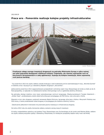 2012-08-29 Praca wre - Pomorskie realizuje kolejne projekty infrastrukturalne | autor: Miasto Gdansk Finalizacja całego szeregu inwestycji drogowych na potrzeby Mistrzostw Europy w piłce nożnej, nie tylko poprawiła dostępność niektórych dzielnic Trójmiasta, ale również usprawniła ruch na kluczowych skrzyżowaniach w całej aglomeracji. Szykują się kolejne inwestycje, które usprawnią ruch jeszcze bardziej. Tuż przed Euro 2012 do użytku oddana została brakująca cześć budowanej od lat osiemdziesiątych trasy „Wschód-Zachód” w Gdańsku wraz z łączącym ją z obwodnicą Węzłem drogowym „Karczemka”. Jednocześnie przed Euro 2012 zagwarantowano przejezdność centralnej części trasy Słowackiego od ronda La Salle aż do Al. Rzeczpospolitej, co wpłynęło na rozładowanie bardzo intensywnego ruchu w gdańskiej dzielnicy Wrzeszcz. Na potrzeby obsługi stadionu oraz nowo wybudowanego centrum targowego, Międzynarodowych Targów Gdańskich – „Amber Expo”, przebudowany został układ komunikacyjny przylegający do PGE Areny, oraz ulica Jana z Kolna. Również w tym roku drogowcy wykonali renowację Węzła Kliniczna, łączącego ulicę Jana z Kolna z Marynarki Polskiej oraz PGE Areną, a także przebudowali układ drogowy w przylegającej do stadionu dzielnicy Letnica. Zakończenie piłkarskich mistrzostw nie przerwało pasma inwestycji w infrastrukturę drogową. Do końca 2012 roku do użytku kierowców oddany zostanie szereg nowych inwestycji. W stolicy województwa zakończy się budowa Trasy Słowackiego oraz Sucharskiego aż do tunelu pod Martwą Wisłą, oddane do użytku zostaną wszystkie zjazdy z Obwodnicy Południowej a w Kwidzynie przejezdny będzie nowy most nad Wisłą. 1 Rzecznik spółki Gdańskie Inwestycje Komunalne, Magdalena Skorupka-Kaczmarek poinformowała w wywiadzie, udzielonym Polskiej Agencji Prasowej, że odcinek Trasy Sucharskiego, łączący Południową Obwodnicę Gdańska z Portem Gdańskim oraz głębokowodnym terminalem kontenerowym DCT, jest gotowy już w 70%. Najbardziej zaawansowane są prace na pierwszym odcinku Trasy Sucharskiego, od Węzła Ku Ujściu do Węzła Wosia Budzisza, prace na tym odcinku zakończone zostaną w listopadzie br. Na drugim odcinku, który łączy Obwodnicę Południową z „Węzłem Elbląska”, trwają obecnie prace przy przejściach pieszo-rowerowych nad torami oraz pięcioma wiaduktami. Do końca 2014 roku Trasę Sucharskiego z prowadzącą od Węzła Marynarki Polskiej do trójmiejskiego lotniska Trasą Słowackiego połączy jedyny w Polsce tunel pod Martwą Wisłą. Zakończenie budowy Trasy Słowackiego planowane jest na koniec 2012. Zaawansowana jest całość budowy, od rondaLa Salle do Węzła Marynarki Polskiej, obecnie pracę prowadzone są prace na wysokości estakady nad al. Grunwaldzką. Zakończenie robót drogowych na Trasie Sucharskiego oraz Słowackiego umożliwi nowe połączenia Wschód – Zachód i zmniejszenie natężenia ruchu w centrum miasta. Ponadto usprawniona zostanie komunikacja miejska, jak i komunikacja między portem, lotniskiem a Południową Obwodnicą Gdańska (POG). POG, o długości18 kilometrów, została oddana do użytku już na początku lipca 2012 roku. Do końca roku planowane jest zakończenie budowy dwóch zjazdów: „Gdańsk Lipce”, łączący obwodnicę z drogą 91 oraz dzielnicą Gdańsk Orunia, a także zjazd z obwodnicy na Węźle Gdańsk Olszynka na Trasę Sucharskiego w stronę Portu Gdańsk. W oddalonym o 100 kilometrów Kwidzynie trwa budowa nowej przeprawy przez Wisłę. Sześcioprzęsłowy most o długości 900 metrów i szerokości ponad 16 m znajduje się w budowie od roku 2010. Według przedstawicieli oddziału GDDKiA w Gdańsku, budowa mostu na Wiśle powinna potrwać do końca tego roku, chociaż istnieje zagrożenie, że termin nie zostanie dotrzymany ze względu na aktualne opóźnienia wykonawcy. GDDKiA przyznaje, że prowadzi prace przygotowawcze do budowy trasy S6 od zachodniej obwodnicy trójmiasta przez Lębork do Słupska. Prace prowadzone są także na odcinku trasy S7 od południowej obwodnicy Gdańska do Elbląga, na obwodnicy Elbląga, Kościerzyny oraz na tak zwanej Trasie Kaszubskiej. Priorytetowymi inwestycjami do zrealizowania w okresie najbliższych dwóch lat, są dla GDDKiA: rozpoczęcie budowy kolejnego odcinka S7 z Gdańska w stronę Elbląga oraz oddanie do użytku obwodnic Kościerzyny i Malborka. Dzięki inwestycjom, takim jak budowa Południowej Obwodnicy Gdańska, w niepamięć odchodzą zakorkowane skrzyżowania, m.in. na ulicach Podwale Przedmiejskie, Kartuskiej czy Łostowickiej. Z kolei rozbudowa Trasy Słowackiego przyczyniła się do poprawy płynności ruchu również na obrzeżach trójmiasta, przy zjazdach na obwodnicę zachodnią, przy centach handlowych i w dzielnicach centralnych dzielnicach Gdańska, m.in. we Wrzeszczu czy Brzeźnie. Autor Michał A. Gromek / 2
