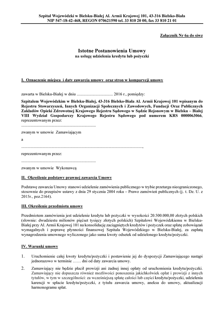 Szpital Wojewódzki w Bielsku-Białej Al. Armii Krajowej 101, 43-316 Bielsko-Biała NIP 547-18-42-468, REGON 070621590 tel. 33 810 20 00, fax 33 810 21 01 Załącznik Nr 6a do siwz Istotne Postanowienia Umowy na usługę udzielenia kredytu lub pożyczki I. Oznaczenie miejsca i daty zawarcia umowy oraz stron w komparycji umowy zawarta w Bielsku-Białej w dniu ................................... 2016 r., pomiędzy: Szpitalem Wojewódzkim w Bielsku-Białej, 43-316 Bielsko-Biała Al. Armii Krajowej 101 wpisanym do Rejestru Stowarzyszeń, Innych Organizacji Społecznych i Zawodowych, Fundacji Oraz Publicznych Zakładów Opieki Zdrowotnej Krajowego Rejestru Sądowego w Sądzie Rejonowym w Bielsku – Białej VIII Wydział Gospodarczy Krajowego Rejestru Sądowego pod numerem KRS 0000063066, reprezentowanym przez: ........................................................................ zwanym w umowie Zamawiającym a ....................................................................................................................., reprezentowanym przez: ........................................................................ zwanym w umowie Wykonawcą II. Określenie podstawy prawnej zawarcia Umowy Podstawę zawarcia Umowy stanowi udzielenie zamówienia publicznego w trybie przetargu nieograniczonego, stosownie do przepisów ustawy z dnia 29 stycznia 2004 roku – Prawo zamówień publicznych (j. t. Dz. U. z 2015r., poz.2164). III. Określenie przedmiotu umowy Przedmiotem zamówienia jest udzielenie kredytu lub pożyczki w wysokości 20.500.000,00 złotych polskich (słownie: dwudziestu milionów pięćset tysięcy złotych polskich) Szpitalowi Wojewódzkiemu w BielskuBiałej przy Al. Armii Krajowej 101 na konsolidację zaciągniętych kredytów i pożyczek oraz spłatę zobowiązań wymagalnych i poprawę płynności finansowej Szpitala Wojewódzkiego w Bielsku-Białej, za zapłatą wynagrodzenia umownego wyliczonego jako suma kwoty odsetek od udzielonego kredytu/pożyczki. IV. Warunki umowy 1. Uruchomienie całej kwoty kredytu/pożyczki i postawienie jej do dyspozycji Zamawiającego nastąpi jednorazowo w terminie …… dni od daty zawarcia umowy. 2. Zamawiający nie będzie płacił prowizji ani żadnej innej opłaty od uruchomienia kredytu/pożyczki. Zamawiający nie dopuszcza również możliwości ponoszenia jakichkolwiek opłat i prowizji z innych tytułów, w tym w szczególności: za wcześniejszą spłatę całości lub części kredytu/pożyczki, udzielenia karencji w spłacie kredytu/pożyczki, z tytułu zawarcia umowy, aneksu do umowy, aktualizacji harmonogramu spłat. 3. Okres obowiązywania umowy – 96 miesięcy, licząc od dnia zawarcia umowy. 4. Spłata kapitału nastąpi w 89-ciu (osiemdziesiąt dziewięć) równych ratach, płatnych do ostatniego dnia każdego miesiąca kalendarzowego, począwszy od ostatniego dnia miesiąca następującego po miesiącu, w którym zakończył się okres karencji w spłacie rat kapitałowych. 5. Odsetki od kredytu/pożyczki będą spłacane przez cały okres kredytowania od aktualnego salda kredytu/pożyczki. Płatność odsetek, o których mowa powyżej, będzie następować na koniec każdego miesiąca kalendarzowego przez cały okres obowiązywania umowy. 6. Harmonogram spłat kredytu/pożyczki będzie stanowił załącznik do umowy. 7. Podstawowy okres karencji w spłacie rat kapitałowych wynosi 6 miesięcy, licząc od dnia zawarcia umowy. 8. W okresie karencji oraz w miesiącu, w którym zakończył się okres karencji Zamawiający będzie płacił na rzecz Wykonawcy tylko odsetki od udzielonego kredytu/pożyczki. Płatność odsetek będzie następować na koniec każdego miesiąca kalendarzowego objętego karencją w spłacie kapitału. 9. Wykonawca w okresie obowiązywania umowy zobowiązany jest udzielić dodatkowego okresu/okresów karencji w spłacie rat kapitałowych w łącznej wysokości 6 miesięcy, na pisemny wniosek Zamawiającego nie wymagający uzasadnienia, który to okres karencji będzie biegł od daty najbliższej spłaty raty kapitałowej wynikającej z harmonogramu stanowiącego załącznik do umowy, z tym zastrzeżeniem, że Zamawiający może występować o udzielenie karencji jednokrotnie lub kilkakrotnie, aż do wyczerpania dodatkowego 6-miesięcznego okresu karencji w spłacie rat kapitałowych, o którym mowa powyżej. Zamawiający we wniosku o udzielenie karencji skierowanym do Wykonawcy określi, o jaki okres karencji w spłacie rat kapitałowych wnioskuje. 10. Wniosek o udzielenie dodatkowej karencji Zamawiający jest zobowiązany złożyć w formie pisemnej Wykonawcy nie później niż 7 dni kalendarzowych przed zakończeniem miesiąca kalendarzowego. Do wyżej wymienionego terminu wlicza się dzień złożenia wniosku. 11. Każdorazowa karencja w spłacie rat kapitałowych, o której mowa w ust. 9, powodować będzie po stronie Wykonawcy obowiązek przedłożenia Zamawiającemu aktualizacji harmonogramu spłat poprzez dostosowanie go do okresu dodatkowej karencji i skutkować będzie dla Stron obowiązkiem zawarcia pisemnego aneksu do umowy aktualizującego harmonogram spłat. 12. Dodatkowa karencja w spłacie kredytu/pożyczki nie powoduje wydłużenia okresu obowiązywania umowy kredytowej. Spowoduje jedynie zmianę wysokości rat kapitałowych pozostałych do spłaty, co znajdzie odzwierciedlenie w harmonogramie aktualizującym, o którym mowa w ust. 11. 13. W okresie dodatkowej karencji Zamawiający będzie płacił na rzecz Wykonawcy tylko odsetki od salda kredytu/pożyczki. Płatność odsetek będzie następować na koniec każdego miesiąca kalendarzowego objętego dodatkową karencją w spłacie kapitału. 14. Zabezpieczenie kredytu/pożyczki stanowić będzie cesja wierzytelności z umów o udzielanie świadczeń opieki zdrowotnej z Narodowym Funduszem Zdrowia lub weksel in blanco z deklaracją wekslową. W przypadku wyboru przez Wykonawcę formy zabezpieczenia w postaci cesji wierzytelności 
