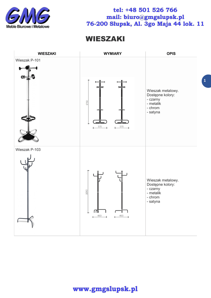 WIESZAKI WIESZAKI WYMIARY OPIS Wieszak P-101 1 Wieszak metalowy. Dostępne kolory: - czarny - metalik - chrom - satyna Wieszak P-103 Wieszak metalowy. Dostępne kolory: - czarny - metalik - chrom - satyna WIESZAKI WYMIARY OPIS Wieszak metalowy. Dostępne kolory: - czarny - metalik - RAL Wieszak SEVEN Istnieje możliwość zamówienia haczyków w innym kolorze niż kolor stelaża wieszaka. Standardowe kolory RAL (stelaż wieszaka): RAL 1023 (zółty), RAL 3020 (czerwony), RAL 5018 (turkusowy), RAL 9003 (biały). Standardowe kolory (haczyki): CZARNY, METALIK, CHROM, RAL 1023 (żółty), RAL 3020 (czerwony), RAL 5018 (turkusowy), RAL 9003 (biały). Wieszak WS04 [wys/szer/gł][mm] 1760 x 800 x 400 Wieszak metalowy. Dostępne kolory: - czarny - biały połysk Wieszak WS05 [wys/szer/gł][mm] 1760 x 480 Wieszak metalowy. Dostępne kolory: - czarny - biały połysk 2 WIESZAKI WYMIARY OPIS Wieszak WS06 [wys/szer/gł][mm] 112 x 60 x 600 Wieszak metalowy. Dostępne kolory: - czarny - biały połysk Wieszak WS07 [wys/szer/gł][mm] 112 x 60 x 1200 Wieszak metalowy. Dostępne kolory: - czarny - biały połysk 3