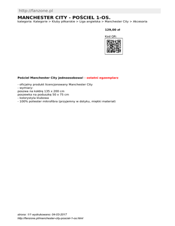 http://fanzone.pl MANCHESTER CITY - POŚCIEL 1-OS. kategoria: Kategorie > Kluby piłkarskie > Liga angielska > Manchester City > Akcesoria 129,00 zł Kod QR: Pościel Manchester City jednoosobowa! - ostatni egzemplarz - oficjalny produkt licencjonowany Manchester City - wymiary: poszwa na kołdrę 135 x 200 cm poszewka na poduszkę 50 x 75 cm - kolorystyla klubowa - 100% poliester mikrofibra (przyjemny w dotyku, miękki materiał) strona: 1/1 wydrukowano: 04-03-2017 http://fanzone.pl/manchester-city-posciel-1-os.html