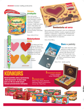 aktualnoÊci nowoÊci wed∏ug producenta Zdrowa przekàska Teraz ma∏a puszka kukurydzy Bonduelle ma nowe zamkni´cie w postaci wieczka z mi´kkiej aluminiowej folii z wygodnym uchwytem. Dzi´ki temu ka˝dy maluch, kiedy b´dzie mia∏ ochot´ na ma∏à przekàsk´, b´dzie móg∏ samodzielnie otworzyç puszk´ z kukurydzà Bonduelki. Cena: 2,50 z∏/212 ml Walentynkowe serca Bombonierka od serca Serca pe∏ne s∏odyczy to pomys∏ w sam raz na Walentynki. W∏oski producent wafelków, Loacker, przygotowa∏ zestaw s∏odkoÊci w opakowaniu z serduszkami. W bombonierce znajdziemy czekoladowe wafelki w trzech smakach oraz cztery rodzaje lekkich mini batoników. Cena: 40 z∏/200 g Biuro w podró˝y Prezent na Walentynki? Musi byç w serduszka! Idealny na upominek dla ukochanej osoby b´dzie d∏ugopis lub zeszyt Inoxcrom z barwnej kolekcji hiszpaƒskiej projektantki Agathy Ruiz de la Prada. Teraz ˝aden dokument, który zabieramy ze sobà w podró˝ nie zniszczy si´, ani si´ nie zawieruszy, jeÊli w∏o˝ymy go do teczki z linii Vivanto Leitz. A do tego – stylowy wyglàd i trzy kolory do wyboru: pomaraƒczowy, zielony oraz niebieski. Ceny: 18 z∏ – zeszyt 10 z∏ – d∏ugopis Cena: 16 z∏ – teczka z gumkà 5 drewnianych skrzynek KONKURS WÊród Czytelników, którzy zaprenumerujà „Âwiat Konsumenta” do koƒca lutego (patrz str. 46) oraz wÊród naszych obecnych prenumeratorów rozlosujemy: z trzema rodzajami herbat TEEKANNE 5zestawów herbat Winter Time, Magic Moments, Malinowà, Ró˝anà, Multivitamin, Immuni Tea i Royal Rum