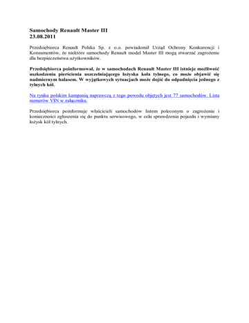 Samochody Renault Master III 23.08.2011 Przedsiębiorca Renault Polska Sp. z o.o. powiadomił Urząd Ochrony Konkurencji i Konsumentów, Ŝe niektóre samochody Renault model Master III mogą stwarzać zagroŜenie dla bezpieczeństwa uŜytkowników. Przedsiębiorca poinformował, Ŝe w samochodach Renault Master III istnieje moŜliwość uszkodzenia pierścienia uszczelniającego łoŜyska koła tylnego, co moŜe objawić się nadmiernym hałasem. W wyjątkowych sytuacjach moŜe dojść do odpadnięcia jednego z tylnych kół. Na rynku polskim kampanią naprawczą z tego powodu objętych jest 77 samochodów. Lista numerów VIN w załączniku. Przedsiębiorca poinformuje właścicieli samochodów listem poleconym o zagroŜeniu i konieczności zgłoszenia się do punktu serwisowego, w celu sprawdzenia pojazdu i wymiany łoŜysk kół tylnych.