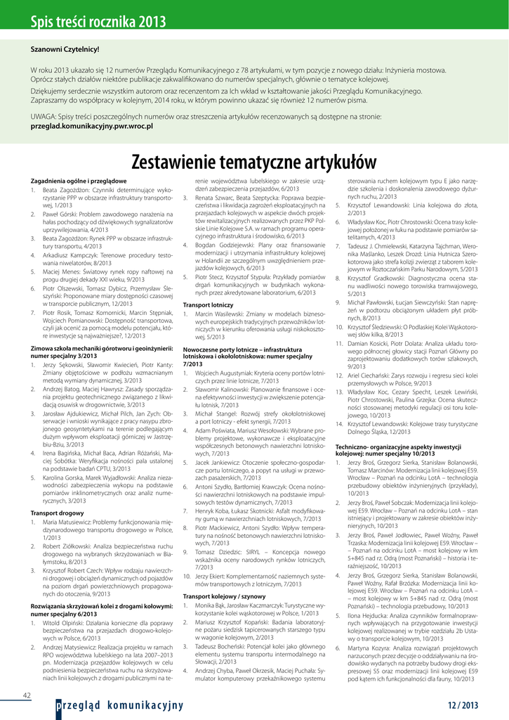 Spis treści rocznika 2013 Szanowni Czytelnicy! W roku 2013 ukazało się 12 numerów Przeglądu Komunikacyjnego z 78 artykułami, w tym pozycje z nowego działu: Inżynieria mostowa. Oprócz stałych działów niektóre publikacje zakwalifikowano do numerów specjalnych, głównie o tematyce kolejowej. Dziękujemy serdecznie wszystkim autorom oraz recenzentom za Ich wkład w kształtowanie jakości Przeglądu Komunikacyjnego. Zapraszamy do współpracy w kolejnym, 2014 roku, w którym powinno ukazać się również 12 numerów pisma. UWAGA: Spisy treści poszczególnych numerów oraz streszczenia artykułów recenzowanych są dostępne na stronie: przeglad.komunikacyjny.pwr.wroc.pl Zestawienie tematyczne artykułów Zagadnienia ogólne i przeglądowe 1. Beata Zagożdżon: Czynniki determinujące wykorzystanie PPP w obszarze infrastruktury transportowej, 1/2013 2. Paweł Górski: Problem zawodowego narażenia na hałas pochodzący od dźwiękowych sygnalizatorów uprzywilejowania, 4/2013 3. Beata Zagożdżon: Rynek PPP w obszarze infrastruktury transportu, 4/2013 4. Arkadiusz Kampczyk: Terenowe procedury testowania niwelatorów, 8/2013 5. Maciej Menes: Światowy rynek ropy naftowej na progu drugiej dekady XXI wieku, 9/2013 6. Piotr Olszewski, Tomasz Dybicz, Przemysław Śleszyński: Proponowane miary dostępności czasowej w transporcie publicznym, 12/2013 7. Piotr Rosik, Tomasz Komornicki, Marcin Stępniak, Wojciech Pomianowski: Dostępność transportowa, czyli jak ocenić za pomocą modelu potencjału, które inwestycje są najważniejsze?, 12/2013 Zimowa szkoła mechaniki górotworu i geoinżynierii: numer specjalny 3/2013 1. Jerzy Sękowski, Sławomir Kwiecień, Piotr Kanty: Zmiany objętościowe w podłożu wzmacnianym metodą wymiany dynamicznej, 3/2013 2. Andrzej Batog, Maciej Hawrysz: Zasady sporządzania projektu geotechnicznego związanego z likwidacją osuwisk w drogownictwie, 3/2013 3. Jarosław Ajdukiewicz, Michał Pilch, Jan Zych: Obserwacje i wnioski wynikające z pracy nasypu zbrojonego geosyntetykami na terenie podlegającym dużym wpływom eksploatacji górniczej w Jastrzębiu-Bziu, 3/2013 4. Irena Bagińska, Michał Baca, Adrian Różański, Maciej Sobótka: Weryfikacja nośności pala ustalonej na podstawie badań CPTU, 3/2013 5. Karolina Gorska, Marek Wyjadłowski: Analiza niezawodności zabezpieczenia wykopu na podstawie pomiarów inklinometrycznych oraz analiz numerycznych, 3/2013 Transport drogowy 1. Maria Matusiewicz: Problemy funkcjonowania międzynarodowego transportu drogowego w Polsce, 1/2013 2. Robert Ziółkowski: Analiza bezpieczeństwa ruchu drogowego na wybranych skrzyżowaniach w Białymstoku, 8/2013 3. Krzysztof Robert Czech: Wpływ rodzaju nawierzchni drogowej i obciążeń dynamicznych od pojazdów na poziom drgań powierzchniowych propagowanych do otoczenia, 9/2013 Rozwiązania skrzyżowań kolei z drogami kołowymi: numer specjalny 6/2013 1. Witold Olpiński: Działania konieczne dla poprawy bezpieczeństwa na przejazdach drogowo-kolejowych w Polsce, 6/2013 2. Andrzej Matysiewicz: Realizacja projektu w ramach RPO województwa lubelskiego na lata 2007–2013 pn. Modernizacja przejazdów kolejowych w celu podniesienia bezpieczeństwa ruchu na skrzyżowaniach linii kolejowych z drogami publicznymi na te- 42 p r ze g l ą d komunik ac yjny 3. 4. 5. renie województwa lubelskiego w zakresie urządzeń zabezpieczenia przejazdów, 6/2013 Renata Szwarc, Beata Szeptycka: Poprawa bezpieczeństwa i likwidacja zagrożeń eksploatacyjnych na przejazdach kolejowych w aspekcie dwóch projektów rewitalizacyjnych realizowanych przez PKP Polskie Linie Kolejowe S.A. w ramach programu operacyjnego infrastruktura i środowisko, 6/2013 Bogdan Godziejewski: Plany oraz finansowanie modernizacji i utrzymania infrastruktury kolejowej w Holandii ze szczególnym uwzględnieniem przejazdów kolejowych, 6/2013 Piotr Stecz, Krzysztof Stypuła: Przykłady pomiarów drgań komunikacyjnych w budynkach wykonanych przez akredytowane laboratorium, 6/2013 Transport lotniczy 1. Marcin Wasilewski: Zmiany w modelach biznesowych europejskich tradycyjnych przewoźników lotniczych w kierunku oferowania usługi niskokosztowej, 5/2013 Nowoczesne porty lotnicze – infrastruktura lotniskowa i okołolotniskowa: numer specjalny 7/2013 1. Wojciech Augustyniak: Kryteria oceny portów lotniczych przez linie lotnicze, 7/2013 2. Sławomir Kalinowski: Planowanie finansowe i ocena efektywności inwestycji w zwiększenie potencjału lotnisk, 7/2013 3. Michał Stangel: Rozwój strefy okołolotniskowej a port lotniczy - efekt synergii, 7/2013 4. Adam Poświata, Mariusz Wesołowski: Wybrane problemy projektowe, wykonawcze i eksploatacyjne współczesnych betonowych nawierzchni lotniskowych, 7/2013 5. Jacek Jankiewicz: Otoczenie społeczno-gospodarcze portu lotniczego, a popyt na usługi w przewozach pasażerskich, 7/2013 6. Antoni Szydło, Bartłomiej Krawczyk: Ocena nośności nawierzchni lotniskowych na podstawie impulsowych testów dynamicznych, 7/2013 7. Henryk Koba, Łukasz Skotnicki: Asfalt modyfikowany gumą w nawierzchniach lotniskowych, 7/2013 8. Piotr Mackiewicz, Antoni Szydło: Wpływ temperatury na nośność betonowych nawierzchni lotniskowych, 7/2013 9. Tomasz Dziedzic: SIRYL – Koncepcja nowego wskaźnika oceny narodowych rynków lotniczych, 7/2013 10. Jerzy Ekiert: Komplementarność naziemnych systemów transportowych z lotniczym, 7/2013 Transport kolejowy / szynowy 1. Monika Bąk, Jarosław Kaczmarczyk: Turystyczne wykorzystanie kolei wąskotorowej w Polsce, 1/2013 2. Mariusz Krzysztof Kopański: Badania laboratoryjne pożaru siedzisk tapicerowanych starszego typu w wagonie kolejowym, 2/2013 3. Tadeusz Bocheński: Potencjał kolei jako głównego elementu systemu transportu intermodalnego na Słowacji, 2/2013 4. Andrzej Chyba, Paweł Okrzesik, Maciej Puchała: Symulator komputerowy przekaźnikowego systemu 5. 6. 7. 8. 9. 10. 11. 12. 13. 14. sterowania ruchem kolejowym typu E jako narz