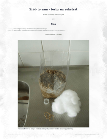 Zrób to sam - torby na substrat (Do it yourself - spawnbags) by Una wersja ang. www.en.psilosophy.info/vnoupsrsbijhbzckczafbxgs original text: http://www.shroomery.org/forums/showflat.php/Number/562556/fpart/all/vc/1 [ tłumaczenie: cjuchu ] Nasiona trawy (2 litry) i woda (1 litr) połączone w torbie polipropylenowej. soma rights re-served 1 od 12.08.2015 na http://www.psilosophy.info/ zrób to sam - torby na substrat www.psilosophy.info/vnoupsrsbijhbzckczafbxgs Torba jest przeciągana przez polipropylenowy krążek (wycięty z dużej strzykawki). soma rights re-served 2 od 12.08.2015 na http://www.psilosophy.info/ zrób to sam - torby na substrat www.psilosophy.info/vnoupsrsbijhbzckczafbxgs Torba jest wywijana... soma rights re-served 3 od 12.08.2015 na http://www.psilosophy.info/ zrób to sam - torby na substrat www.psilosophy.info/vnoupsrsbijhbzckczafbxgs ...i zabezpieczana dwiema gumkami. soma rights re-served 4 od 12.08.2015 na http://www.psilosophy.info/ zrób to sam - torby na substrat www.psilosophy.info/vnoupsrsbijhbzckczafbxgs Otwór jest zatykany watą syntetyczną (polyfill). soma rights re-served 5 od 12.08.2015 na http://www.psilosophy.info/ zrób to sam - torby na substrat www.psilosophy.info/vnoupsrsbijhbzckczafbxgs I zakrywany jest folią aluminiową by zabezpieczyć przed dostaniem się wilgoci w szybkowarze. soma rights re-served 6 od 12.08.2015 na http://www.psilosophy.info/ zrób to sam - torby na substrat www.psilosophy.info/vnoupsrsbijhbzckczafbxgs Torby są autoklawowane (2,5 godziny). soma rights re-served 7 od 12.08.2015 na http://www.psilosophy.info/ zrób to sam - torby na substrat www.psilosophy.info/vnoupsrsbijhbzckczafbxgs Torby te powinny być zaszczepiane płynną grzybnią, ponieważ nie można nimi wstrząsnąć. Oto zdjęcie (prawie) w pełni zarośniętej torby, dwa tygodnie po zaszczepianiu. Zaczyna się już tworzyć trochę małej, rozproszonej sklerocji. soma rights re-served 8 od 12.08.2015 na http://www.psilosophy.info/ zrób to sam - torby na substrat www.psilosophy.info/vnoupsrsbijhbzckczafbxgs Zamiast stosować rurkę PCV zastosowałam specjalne tekturowe pierścienie, które wytrzymują autoklawowanie. Zaszczepiono 50 ml zawiesiny grzybni wstrzykniętej strzykawką przez tyvekowy filtr. Dziurka została zaklejona taśmą. [ tłumaczenie: cjuchu ] soma rights re-served 9 od 12.08.2015 na http://www.psilosophy.info/